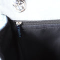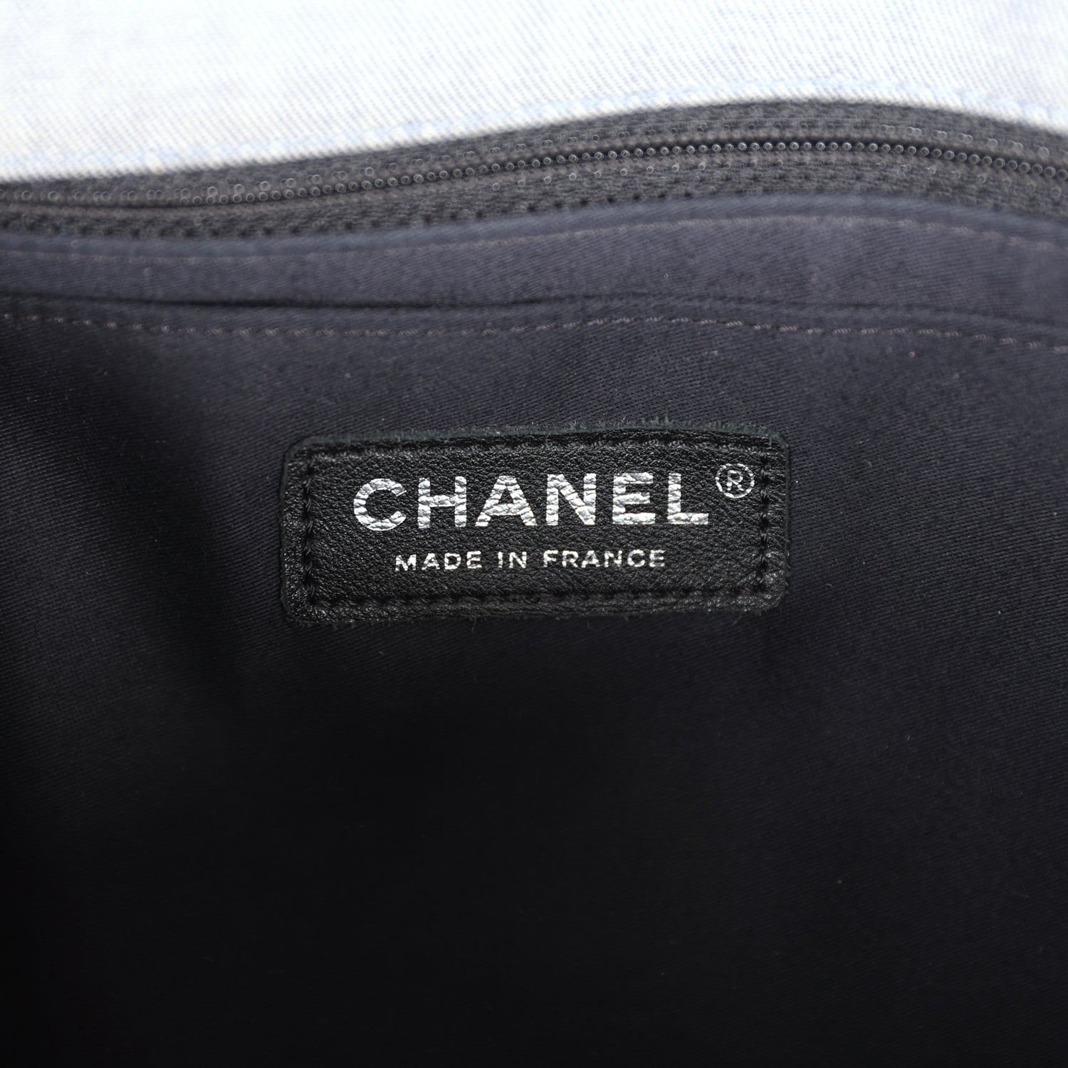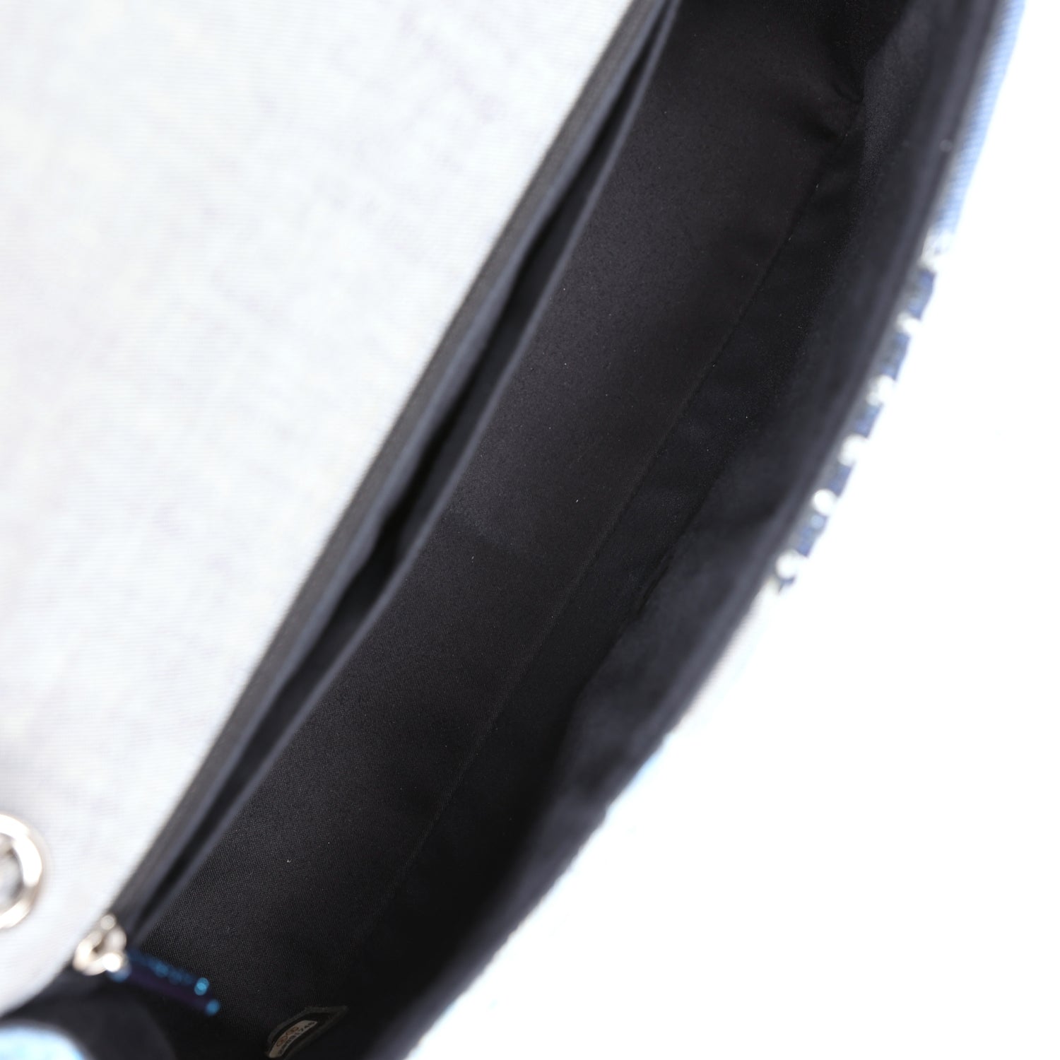 This rare Jumbo Flap Bag is in Blue denim patchwork fabric, canvas, and leather with silver hardware and features a front flap with signature CC turnlock closure and adjustable interwoven silver tone chain link and blue leather shoulder strap.