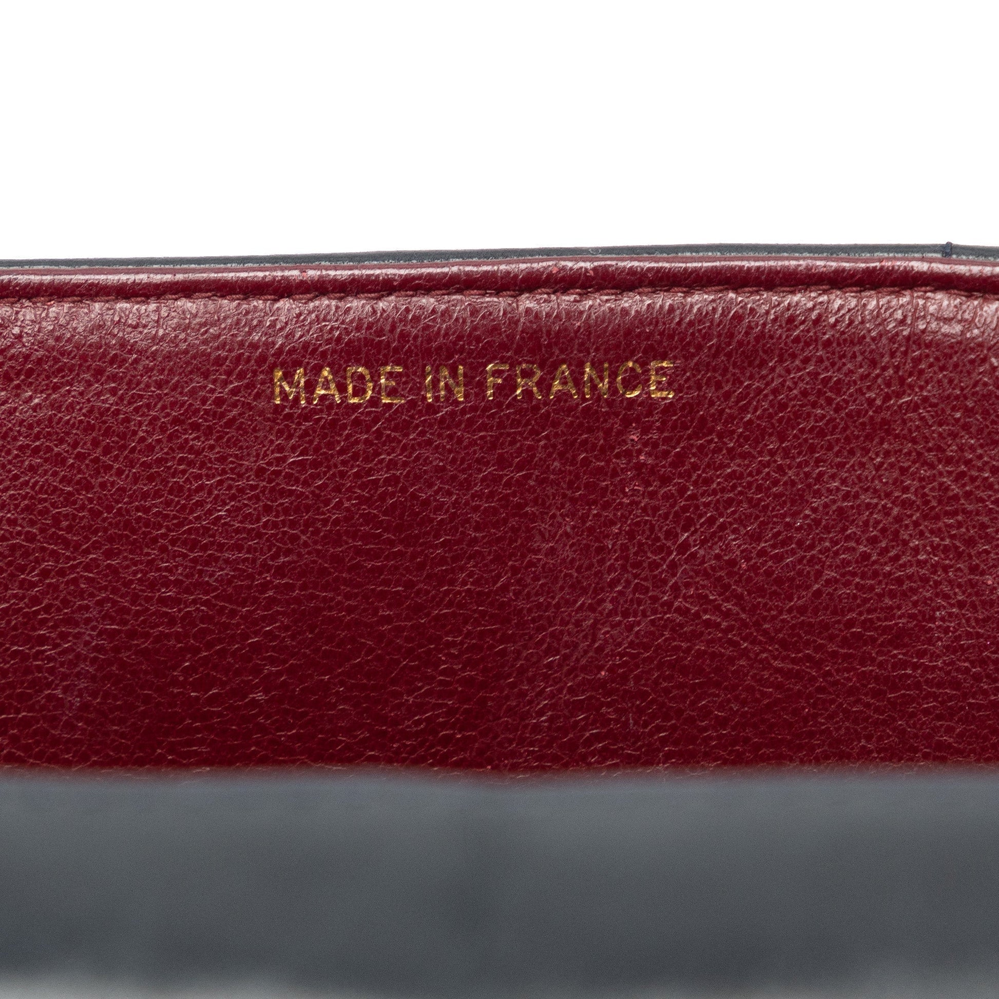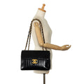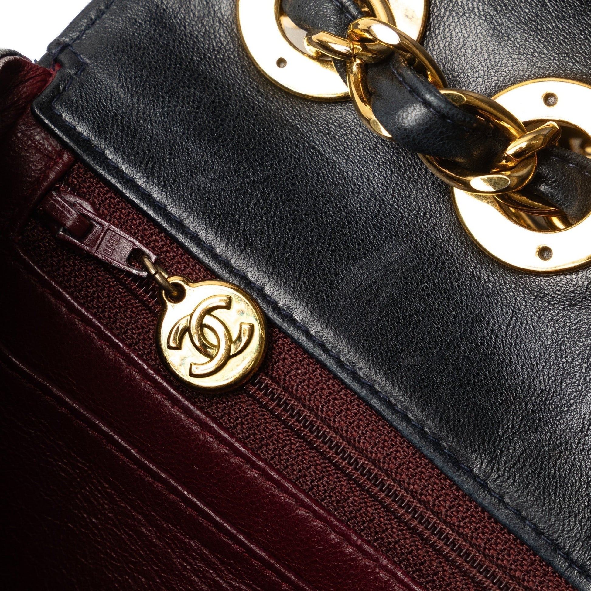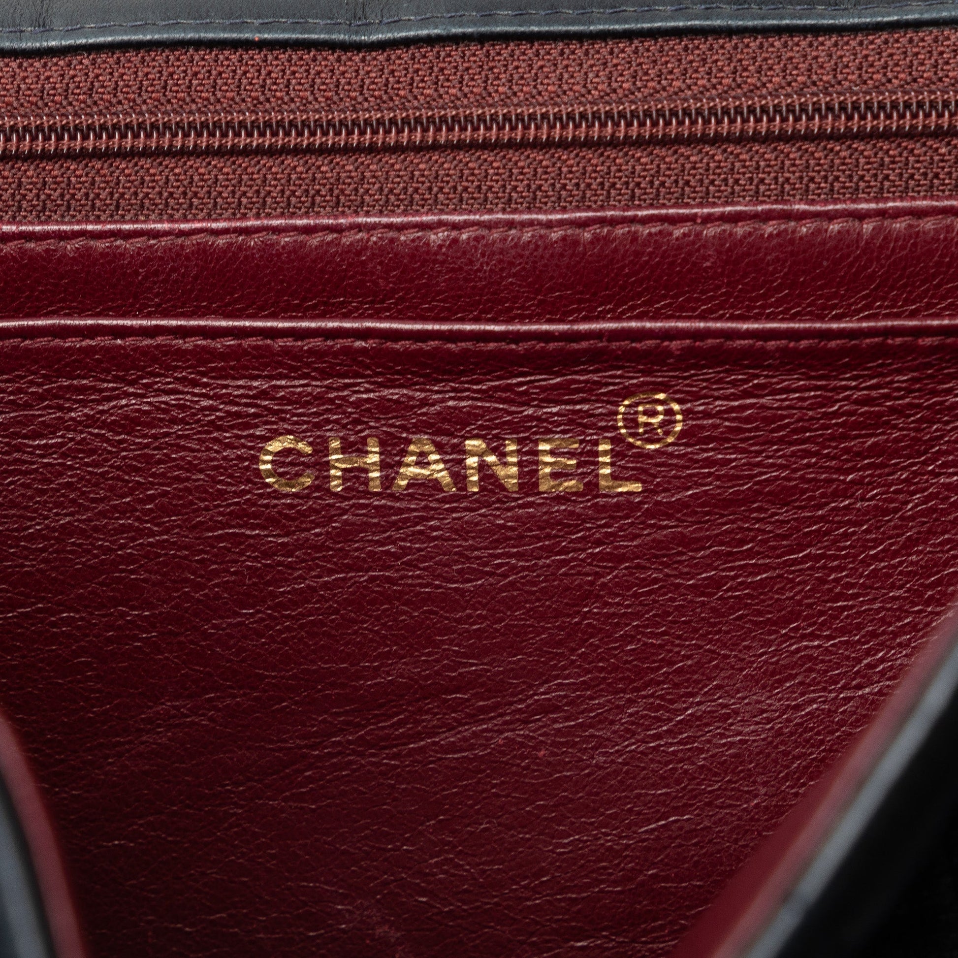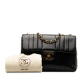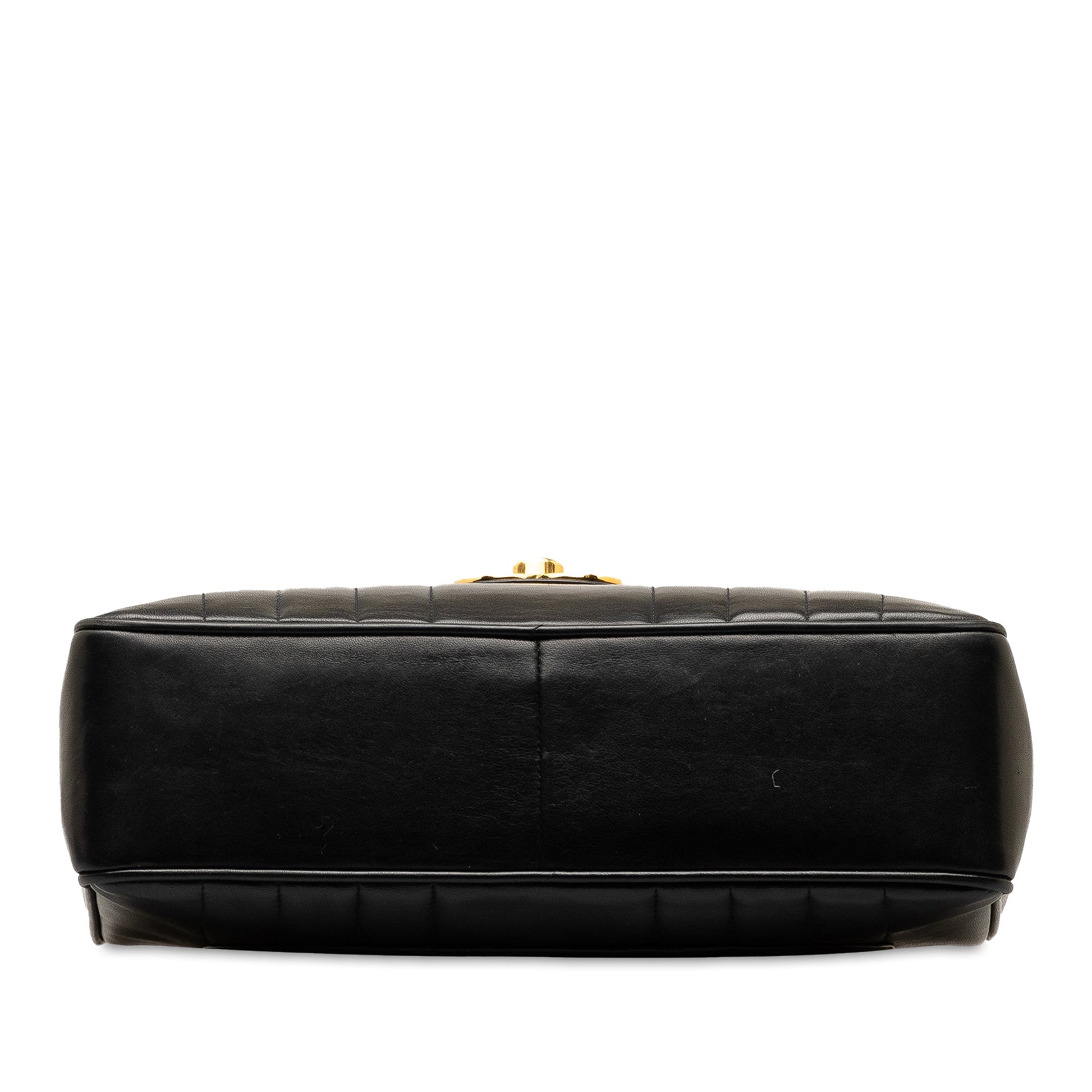 This shoulder Bag features a straight quilted lambskin leather body, leather woven gold-tone chain-link straps, a front flap with interlocking Cs and a twist lock closure, an exterior back slip pocket, and interior zip and slip pockets. Comes with dust Bag