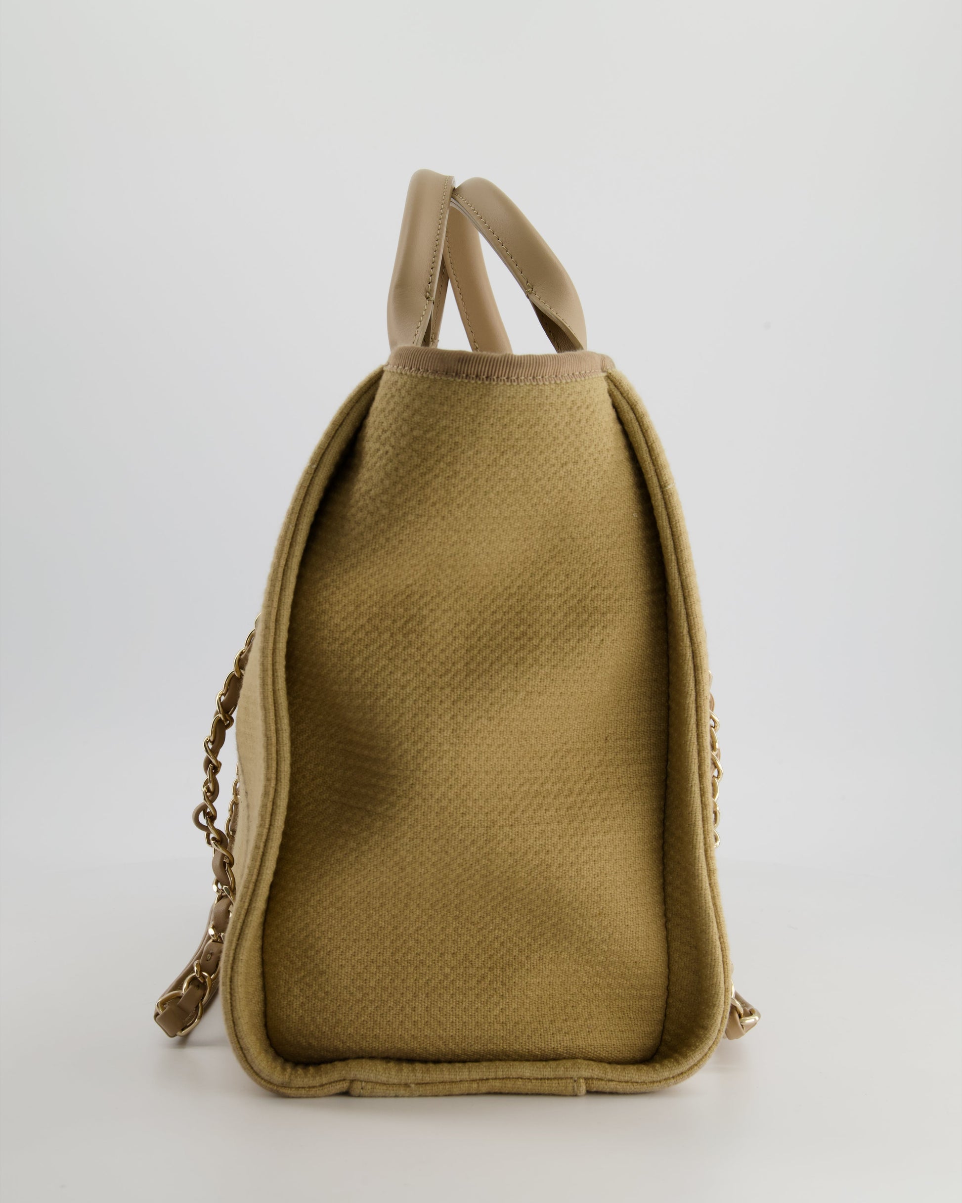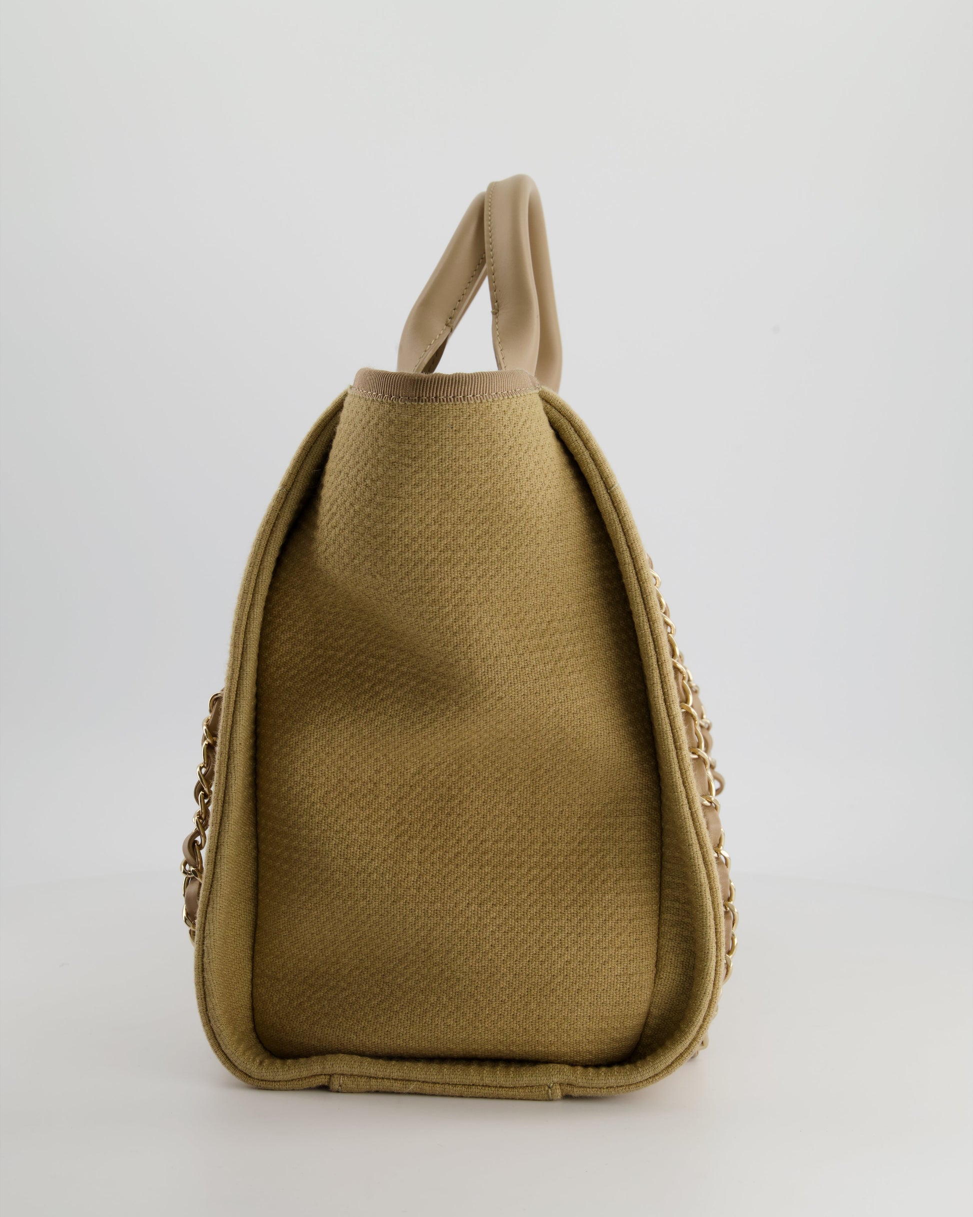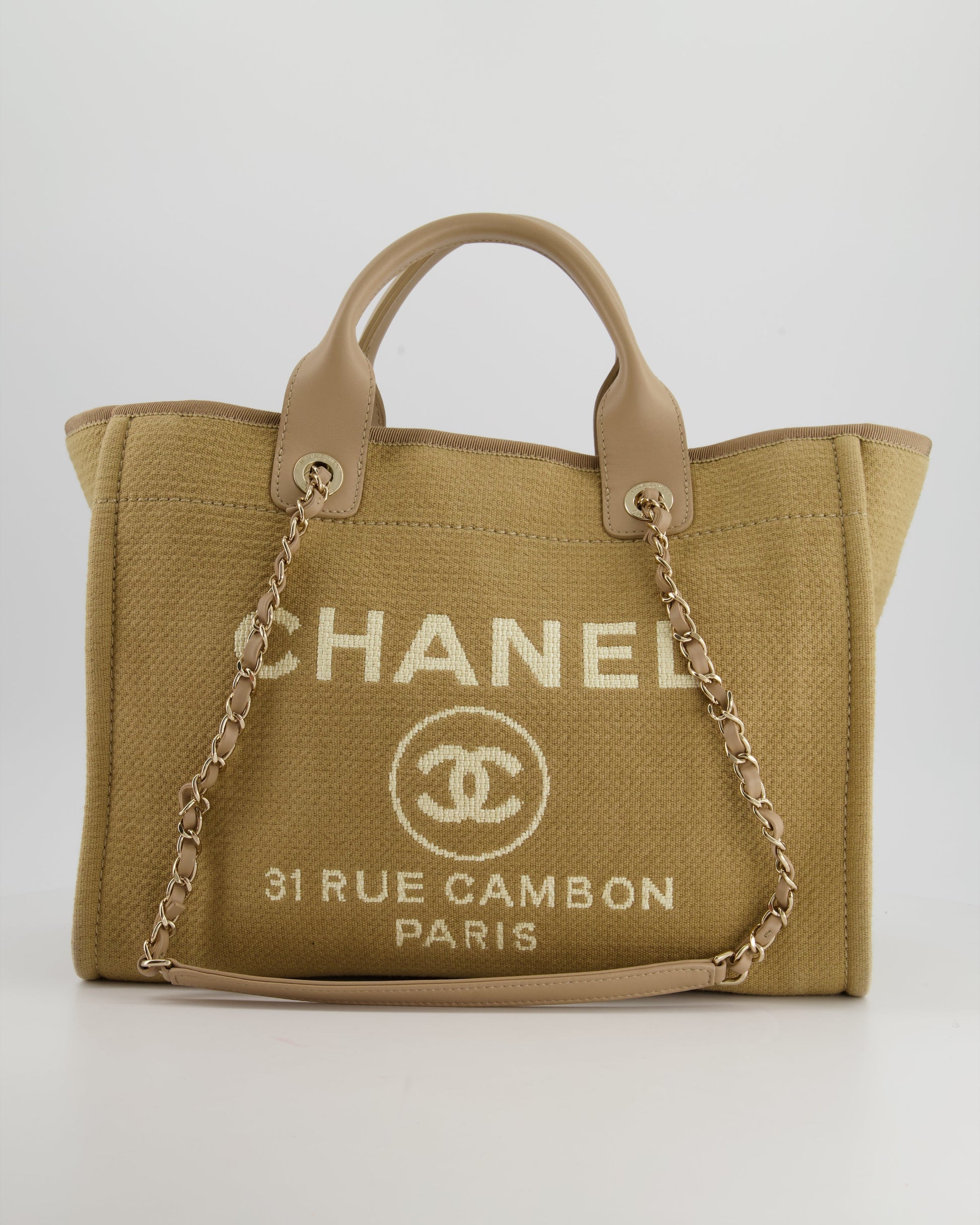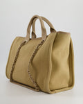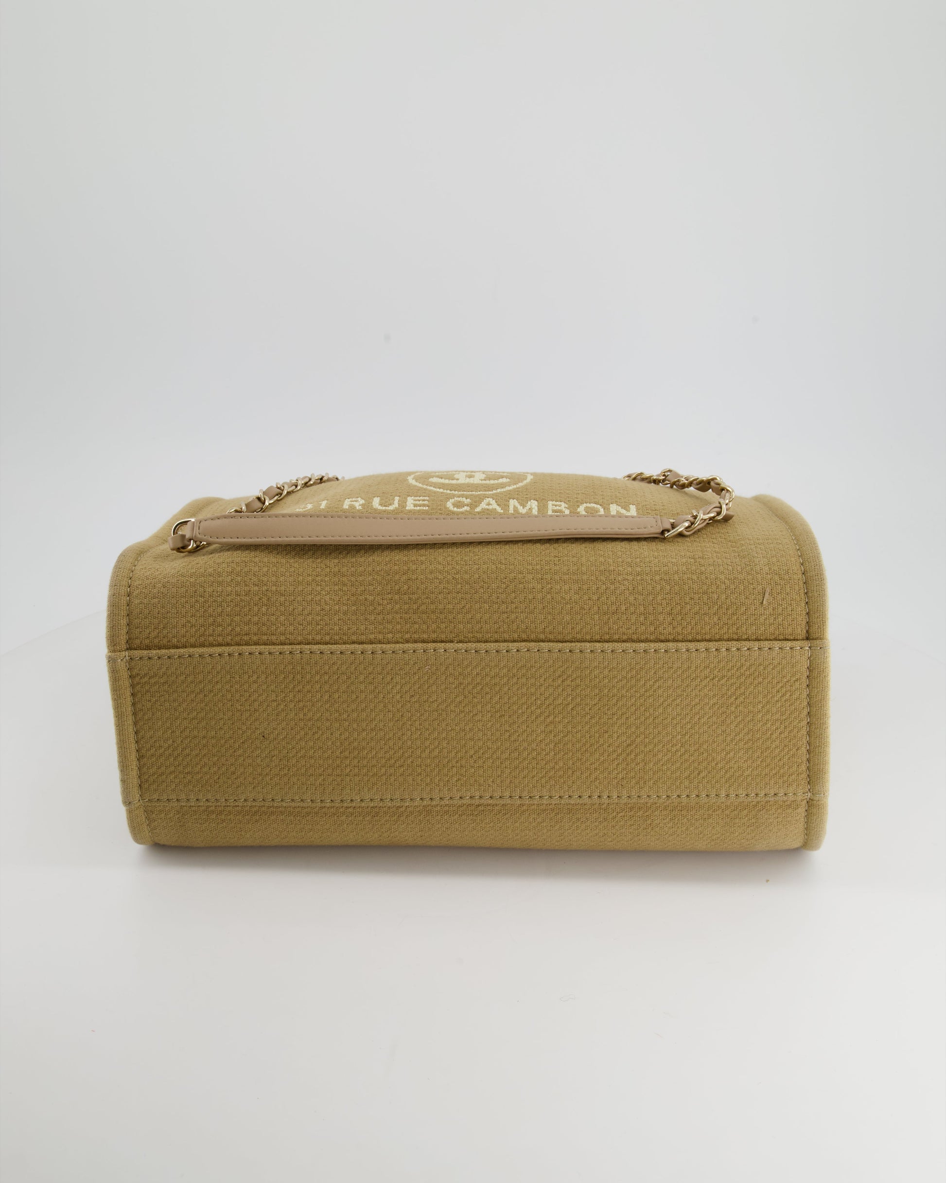 Chanel Dark Beige Canvas Small Deauville Tote Bag with CC Logo Print and Champagne Gold Hardware