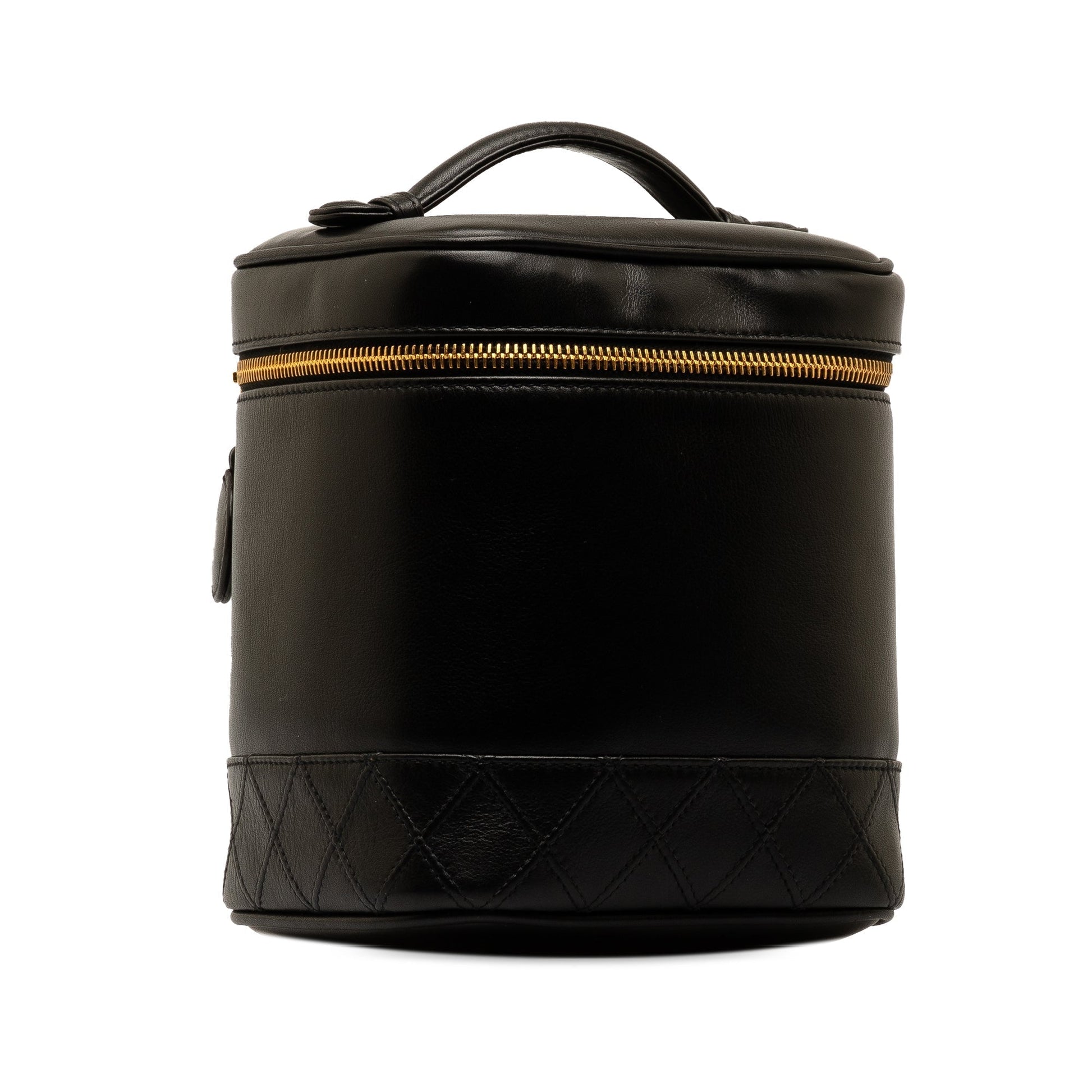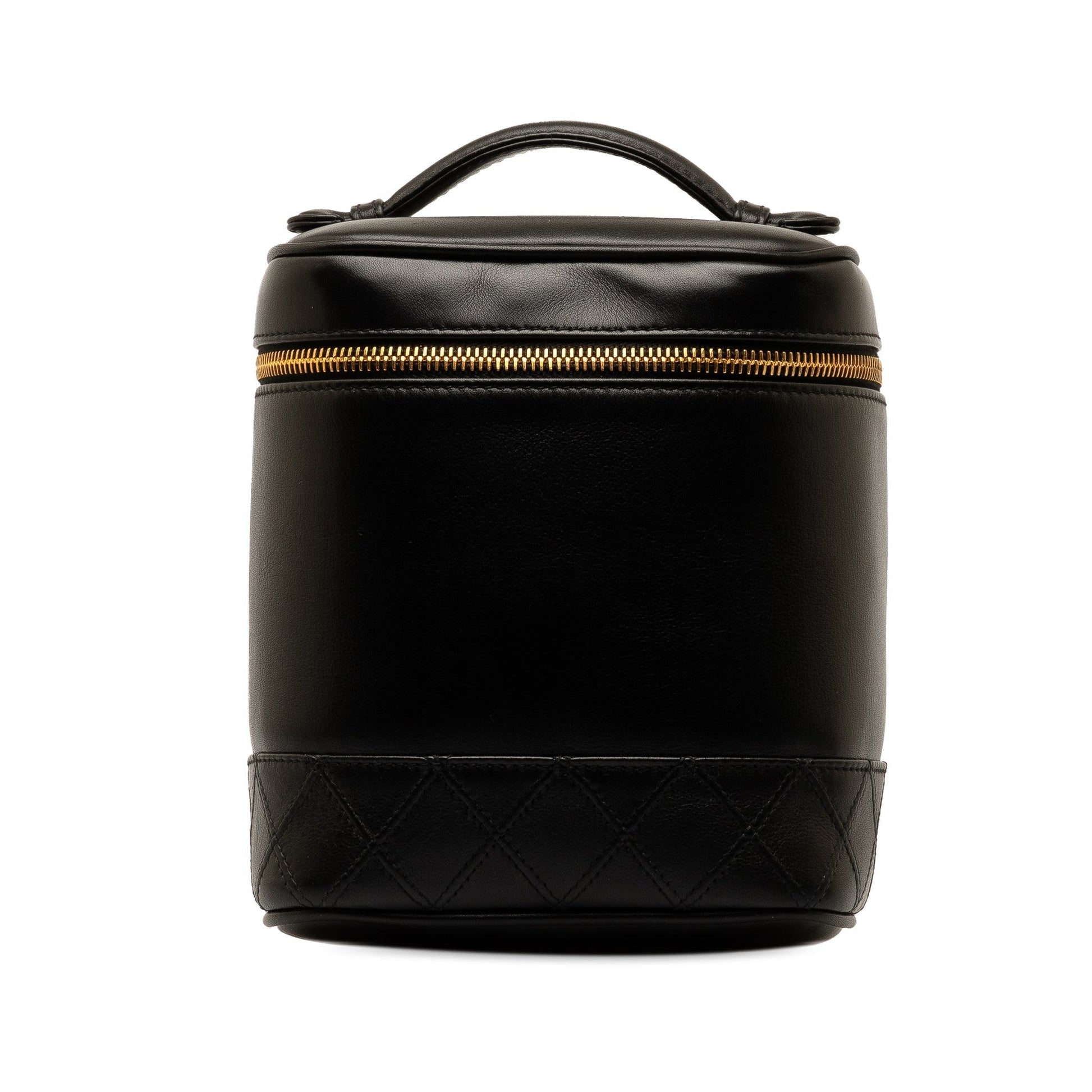 This vanity Bag features a lambskin leather body, a quilted bottom, a top handle, a top zip closure and an interior slip pocket. Comes with dust Bag