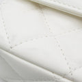 This crossbody Bag features a quilted lambskin leather body, a leather woven chain strap, a top zip closure, a front flap pocket with magnetic snap closure, an exterior back slip pocket, and an interior slip pocket. Comes with .