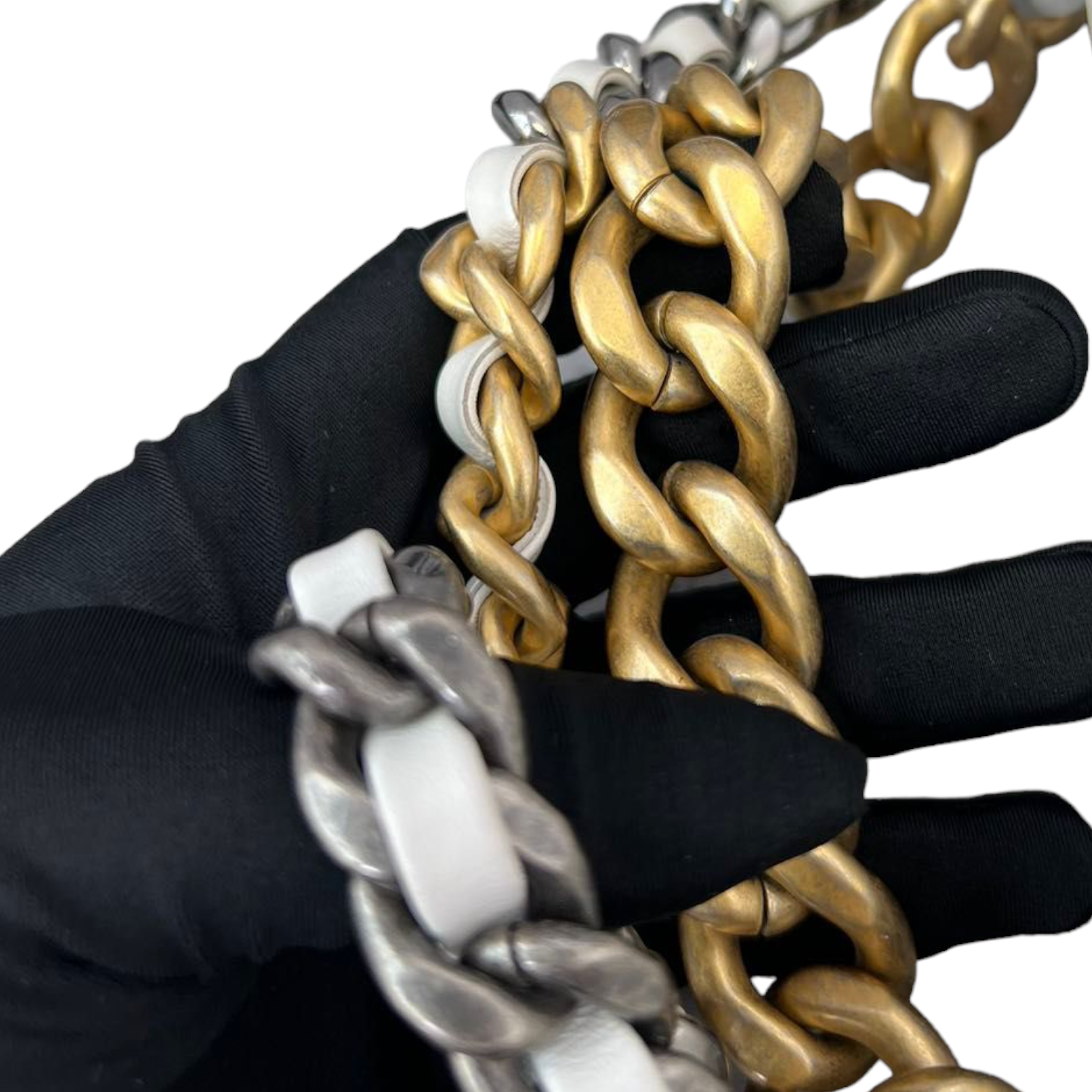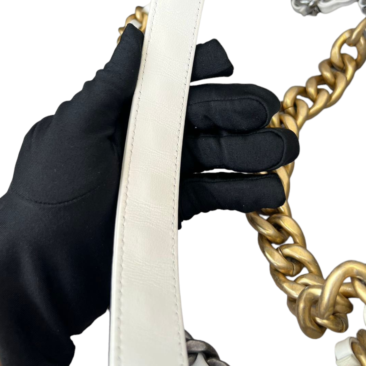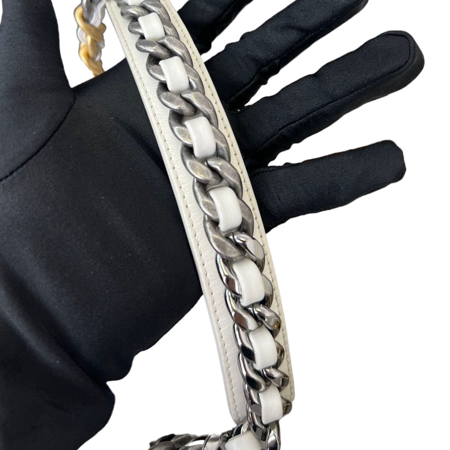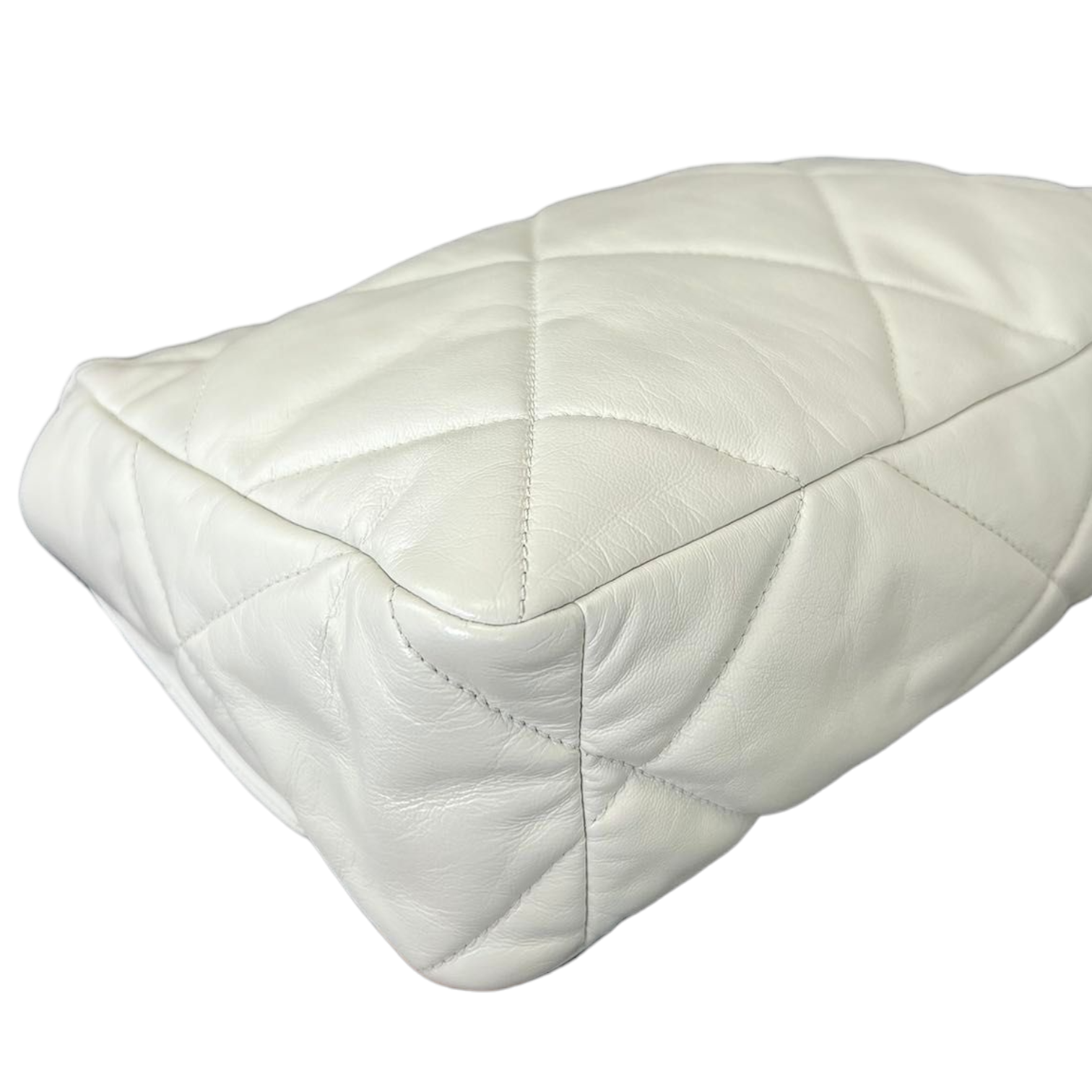 This is an Chanel Lambskin Quilted Large Chanel 19 Flap in White. This pillowy soft shoulder bag is crafted of oversized quilted lambskin leather in white. The bag showcases a chain embellishment with a CC turn-lock on the flap, a rear magnetic snap pocket, and a leather-threaded shoulder strap in aged gold, ruthenium, and silver with a leather shoulder cushion. The front flap opens to a beige fabric interior with a zipper pocket.
