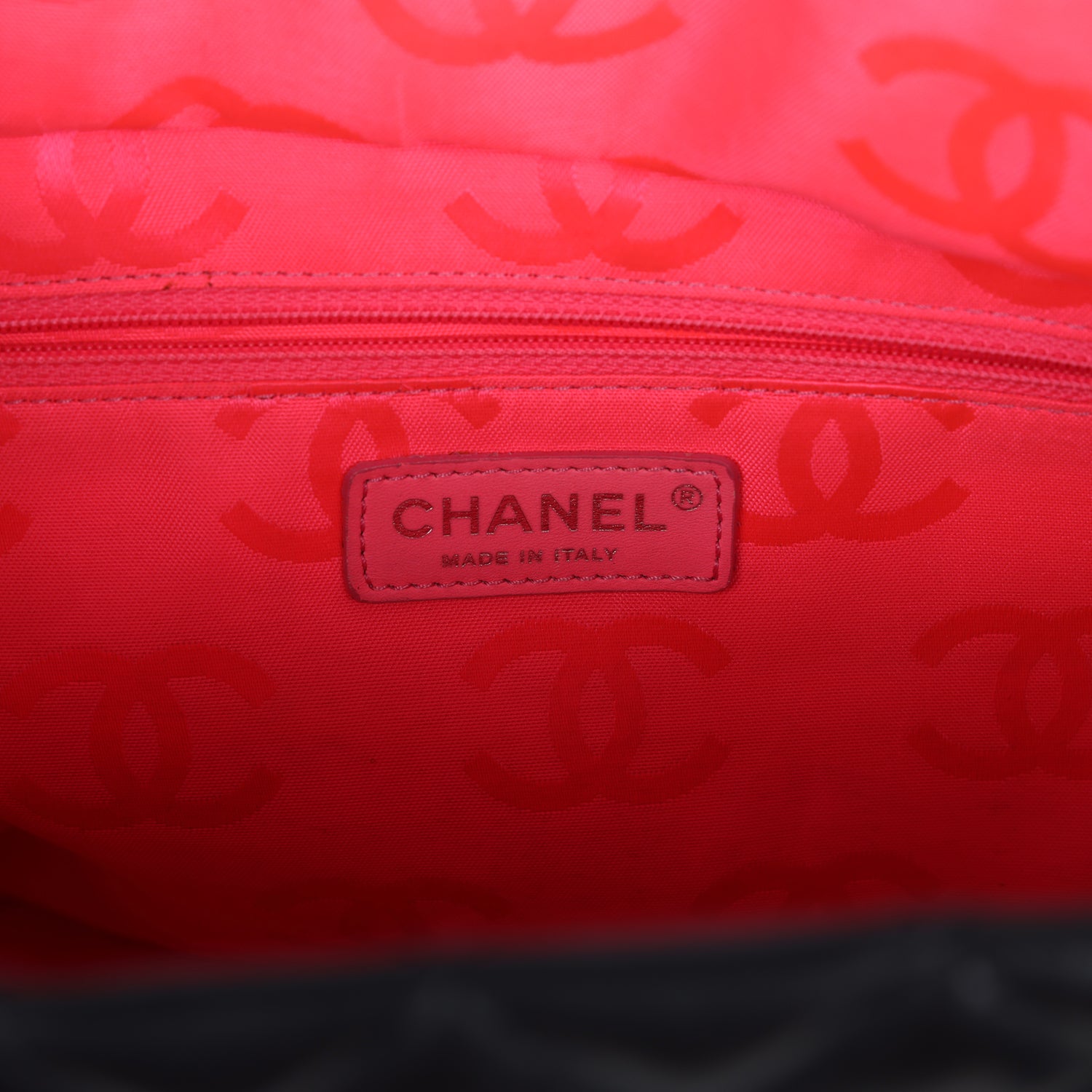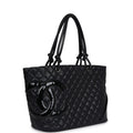 This Chanel large Cambon Ligne tote in black calfskin and patent leather with silver tone hardware, features a quilted leather shopping tote, a large patent leather CC logo on the side of the tote, half moon back exterior pocket, two knotted leather rope top handles, and a zipper top closure with silver tone logo pull.