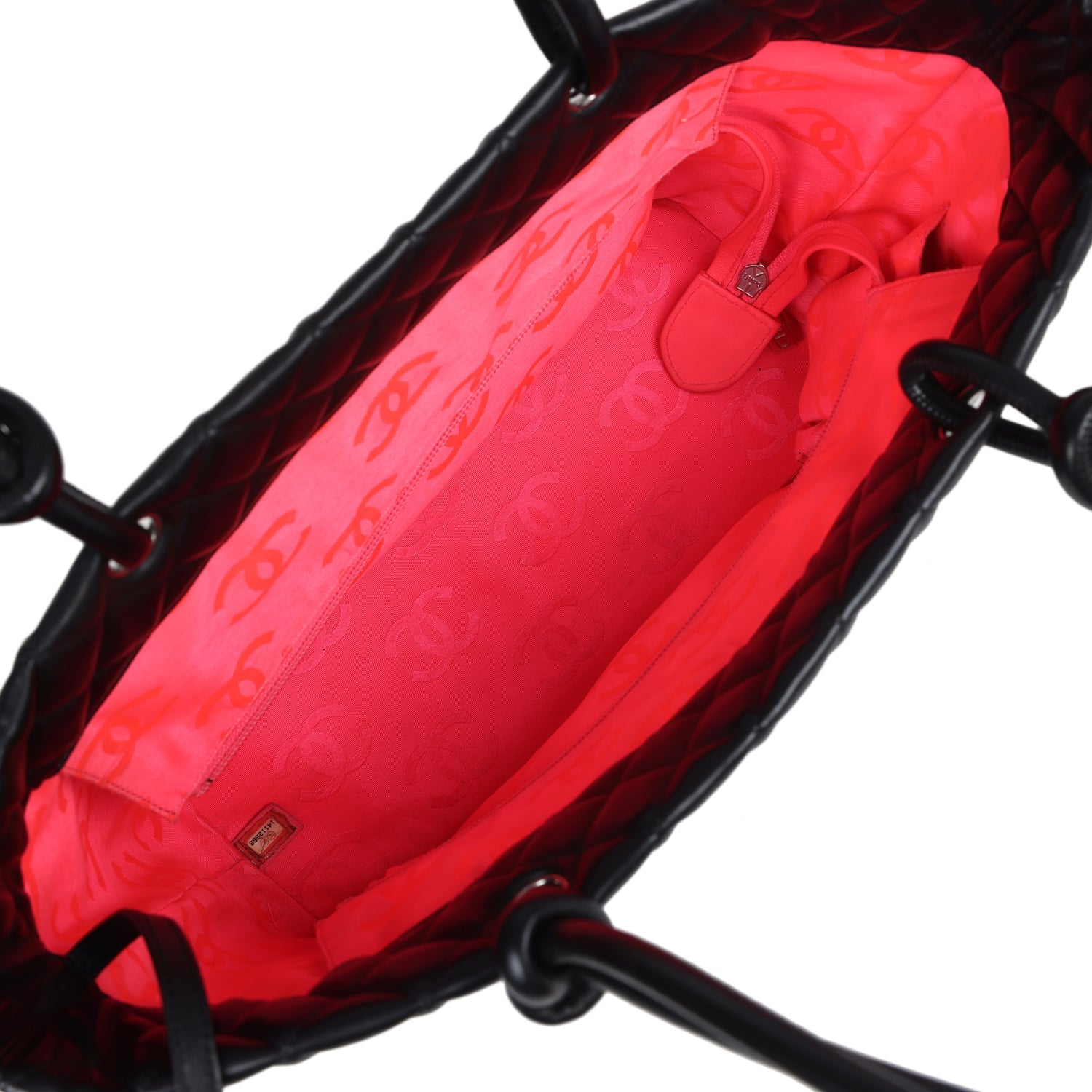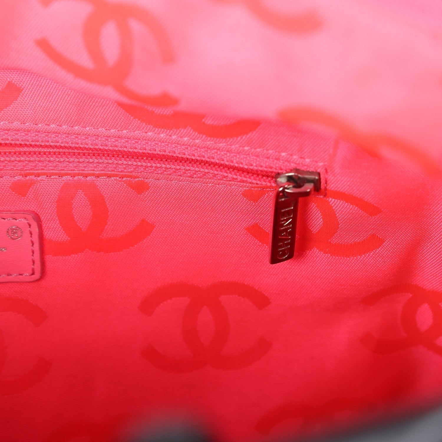 The interior is lined in a pink CC monogram satin fabric and has two interior zip pockets on both sizes, one open phone pocket, and two lipstick/pen pocket holders.
