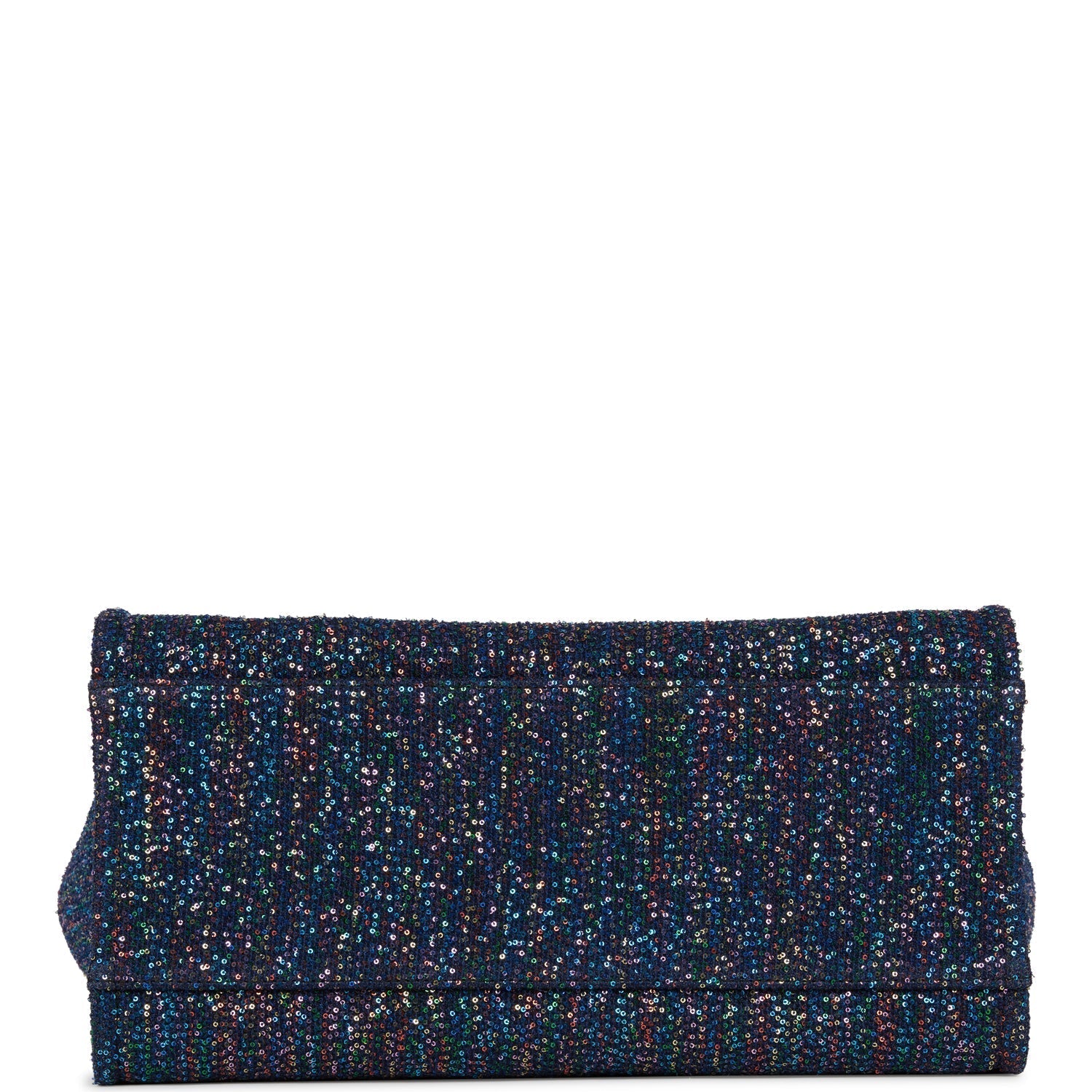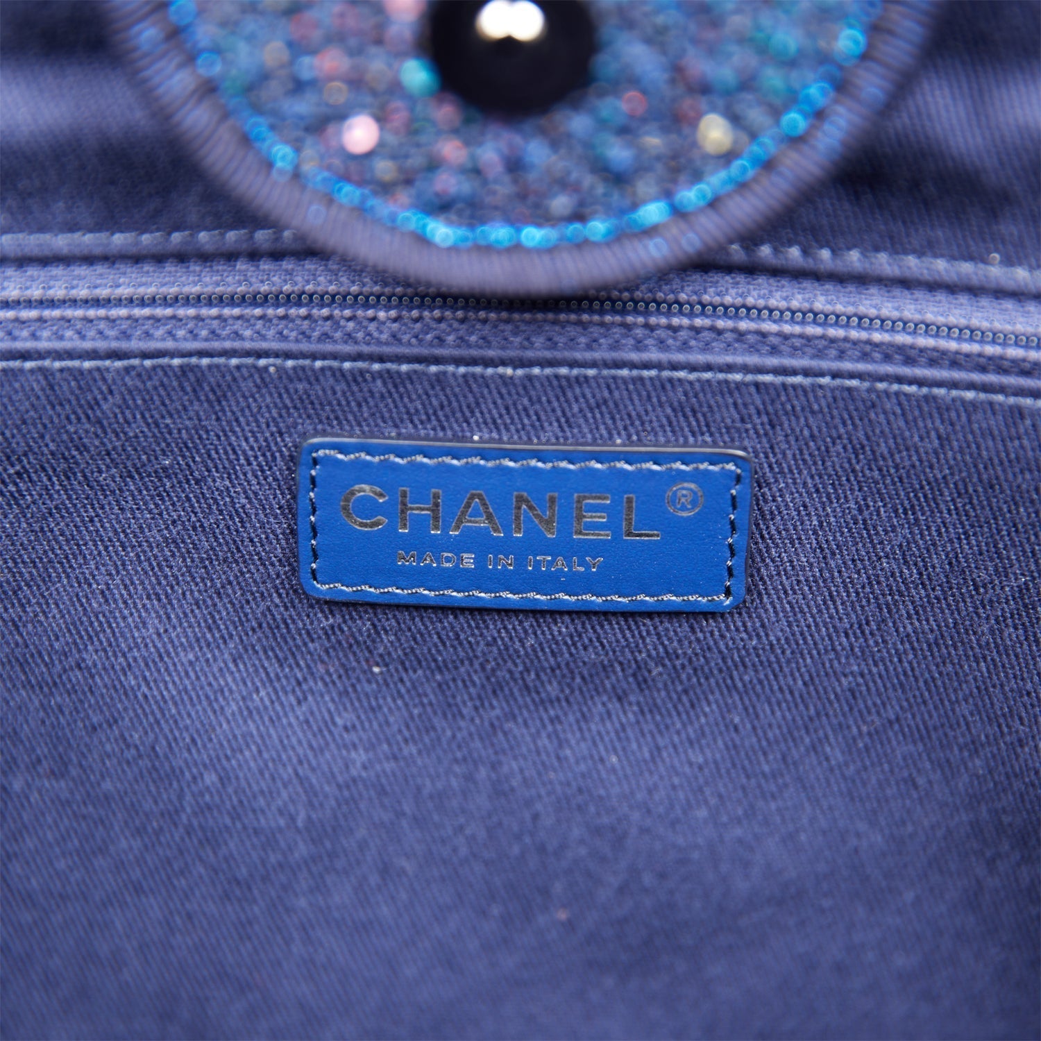 This large Deauville bag is made of canvas and sequins with silver tone hardware; featuring blue top handles, a large CC signature and Chanel logo on the front and interwoven silver tone chain link and blue leather shoulder strap