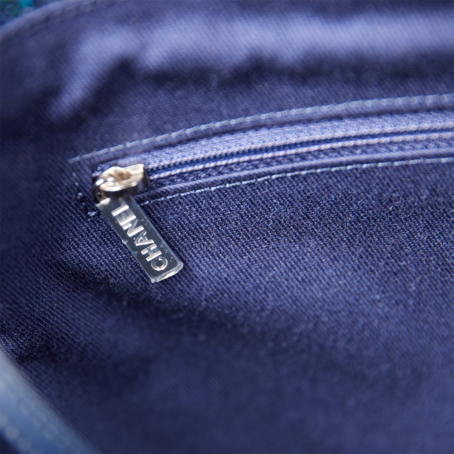 The interior is lined in blue fabric and has two open pockets on the front wall and a zipper pocket with a Chanel pull on the rear wall.