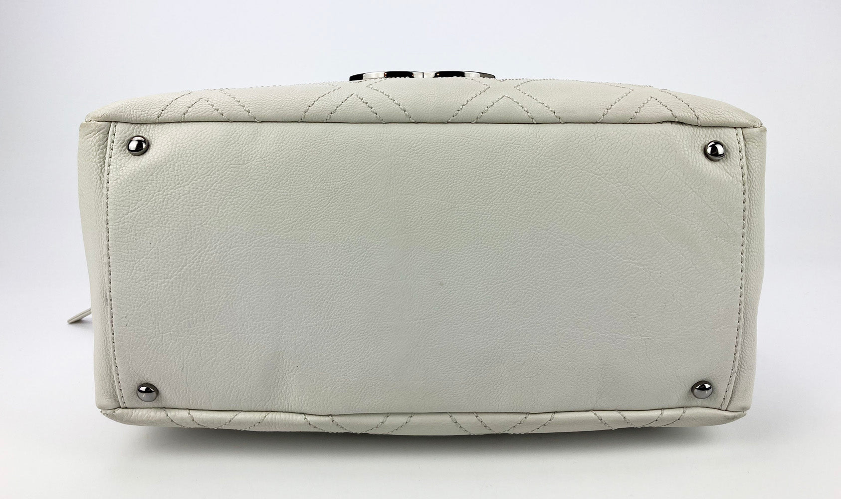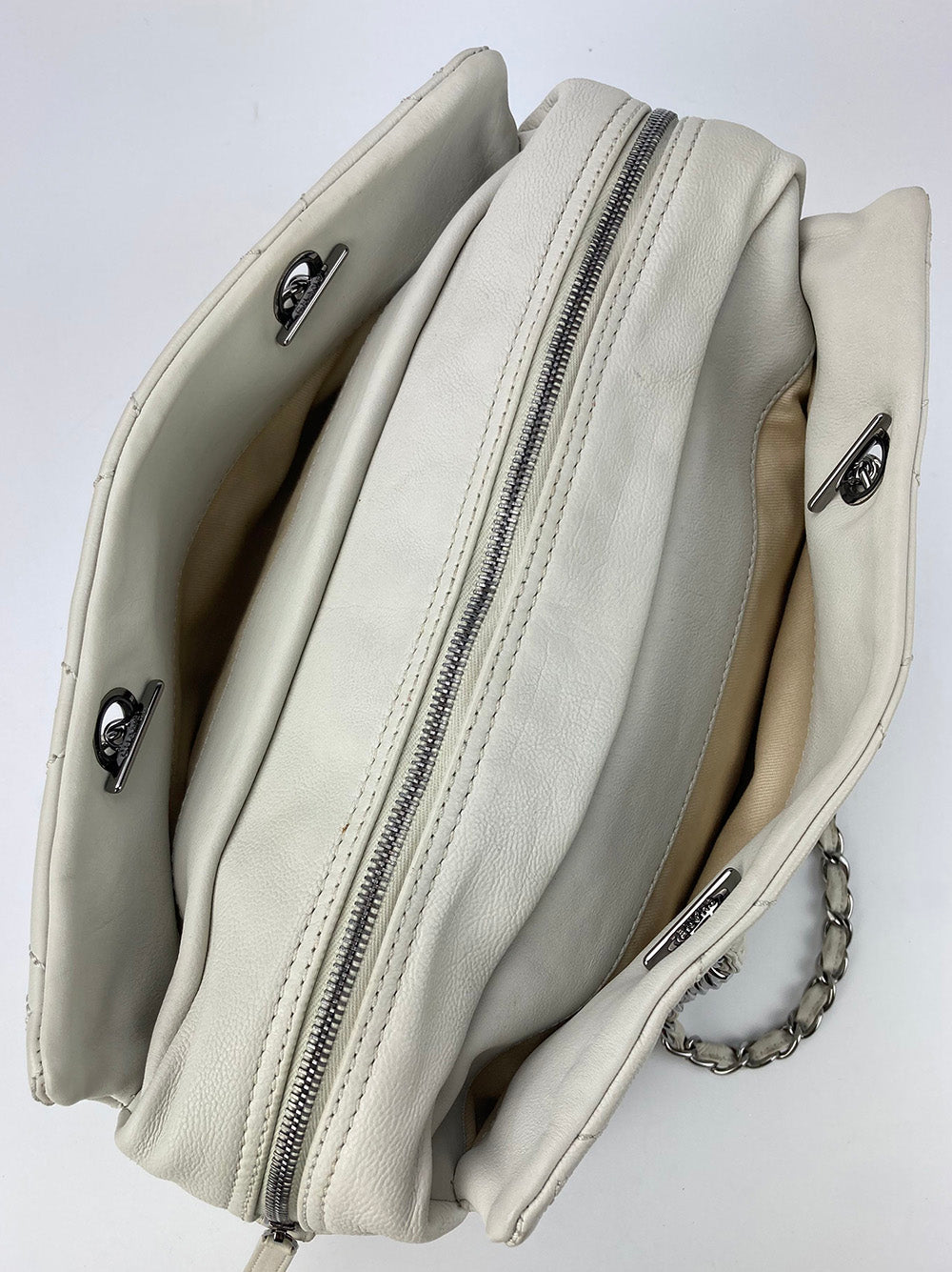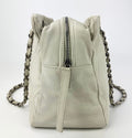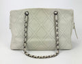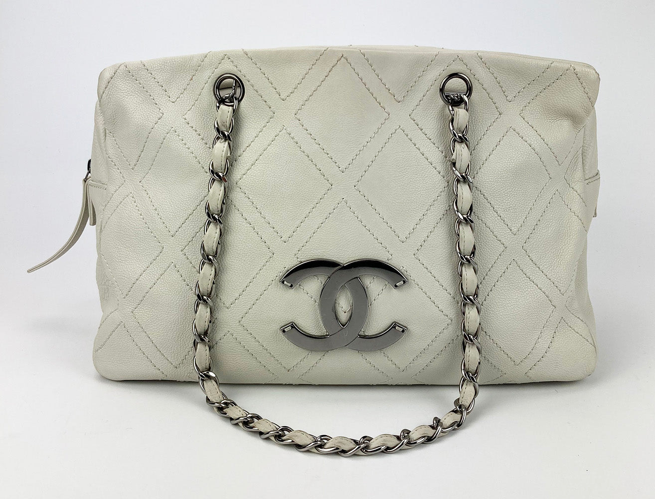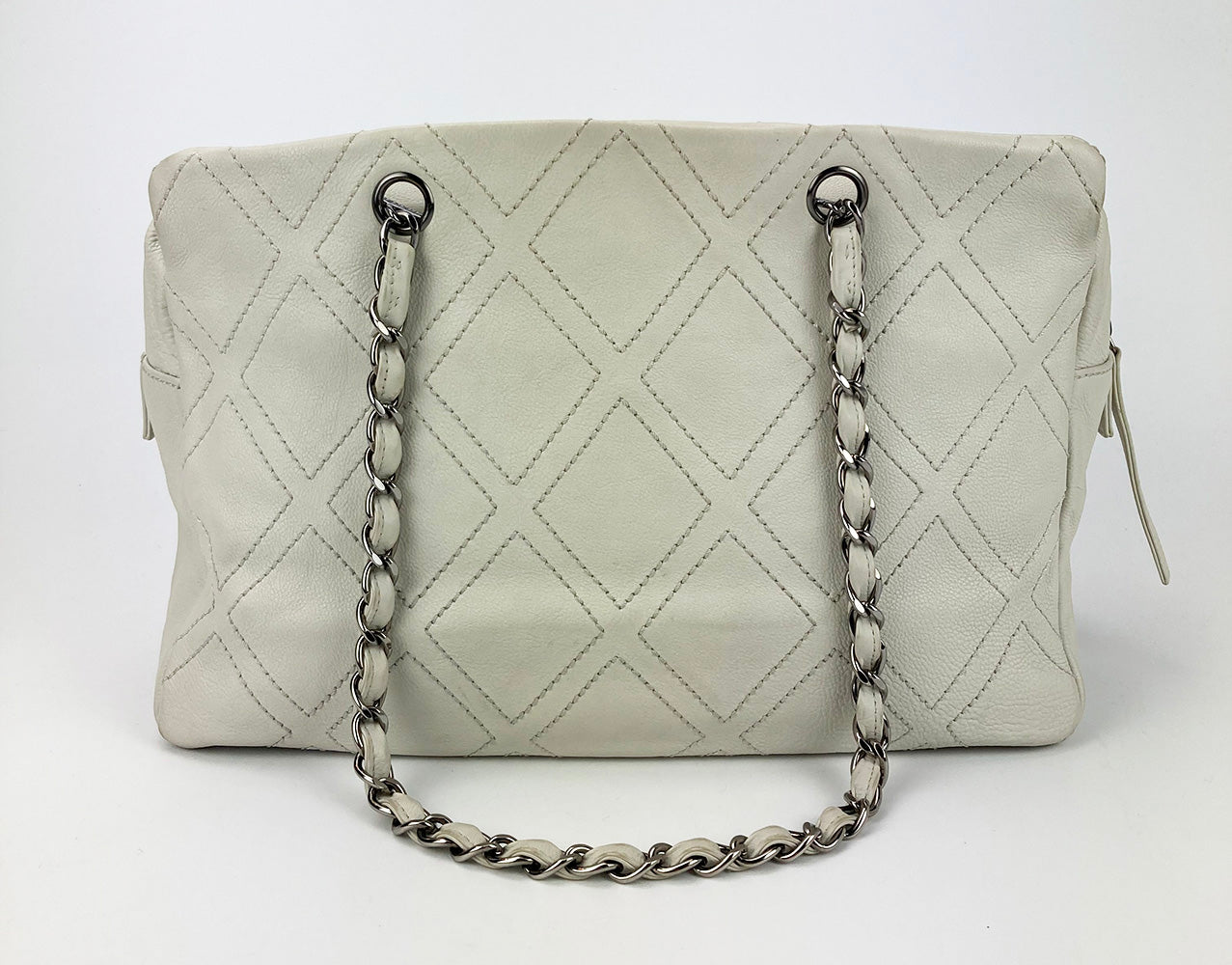 Chanel Large Diamond Stitch Tote in White in very good condition. White leather with large diamond top stitching along both front and back sides. silver hardware and woven chain and leather shoulder straps. 2 exterior side slit pockets. main compartment opens via zip closure to a beige canvas interior with one zip and 2 slit side pockets. Overall very good condition. Clean corners and edges. Tiny brown spots throughout interior. see photos. measurements: 13.5x9x6" 9.5" strap drop. purchase includes a dust cover.