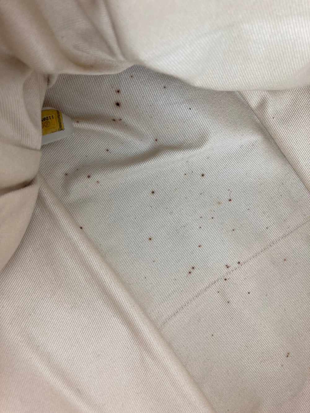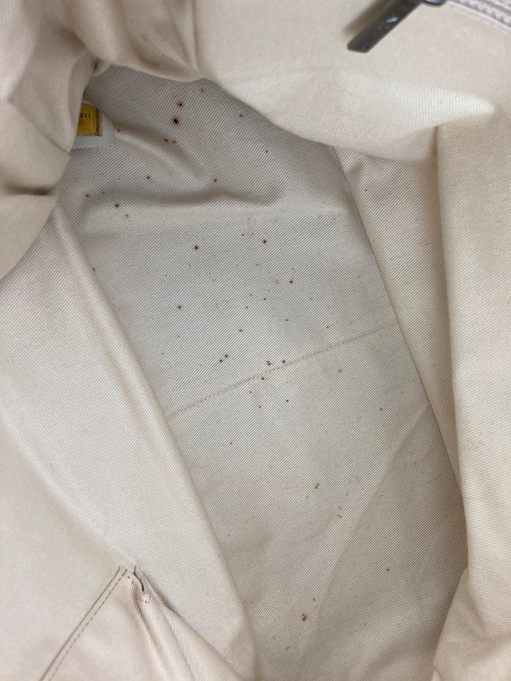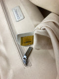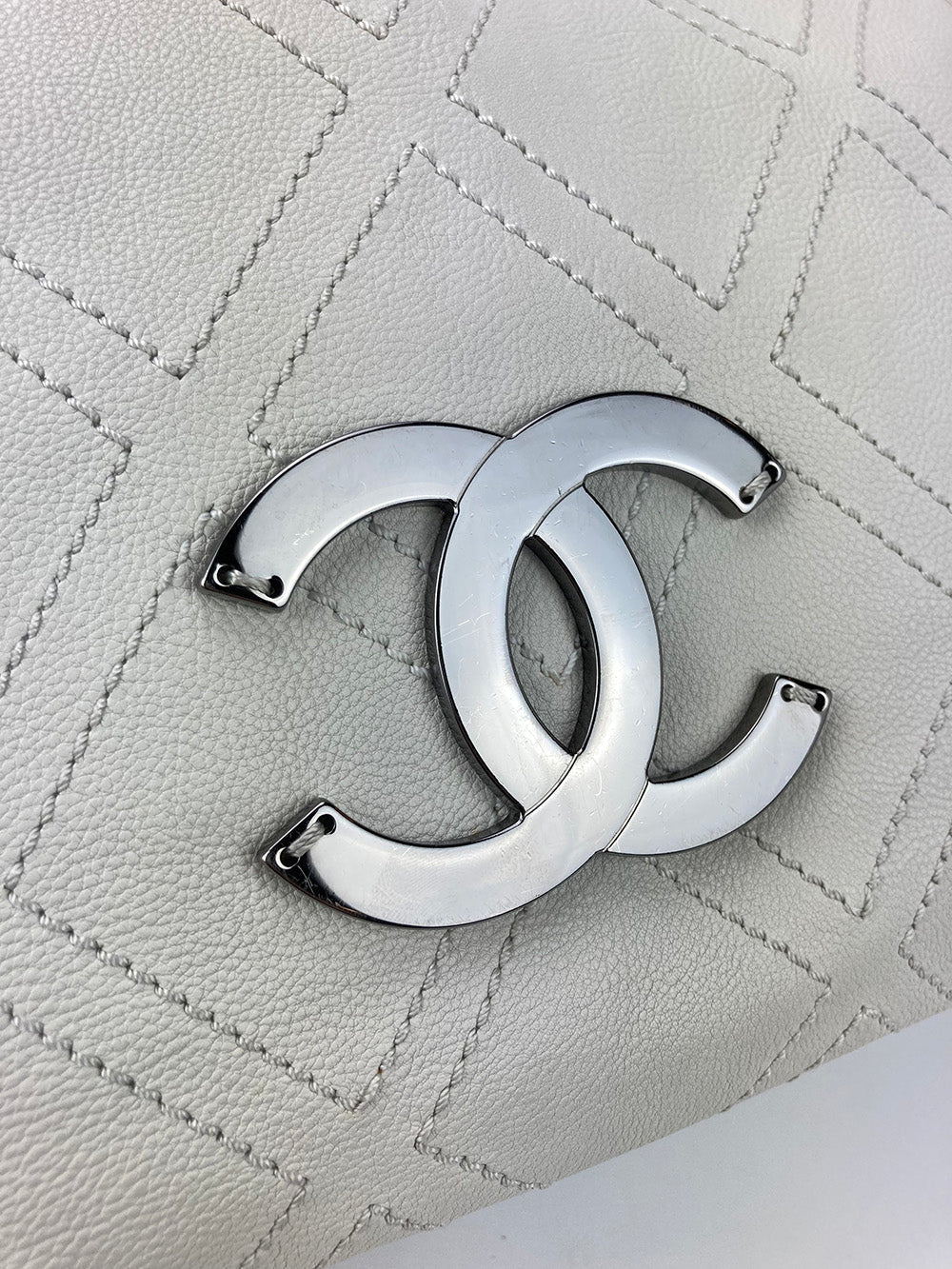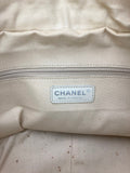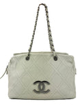 Chanel Large Diamond Stitch Tote in White in very good condition. White leather with large diamond top stitching along both front and back sides. silver hardware and woven chain and leather shoulder straps. 2 exterior side slit pockets. main compartment opens via zip closure to a beige canvas interior with one zip and 2 slit side pockets. Overall very good condition. Clean corners and edges. Tiny brown spots throughout interior. see photos. measurements: 13.5x9x6" 9.5" strap drop. purchase includes a dust cover.