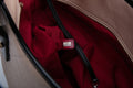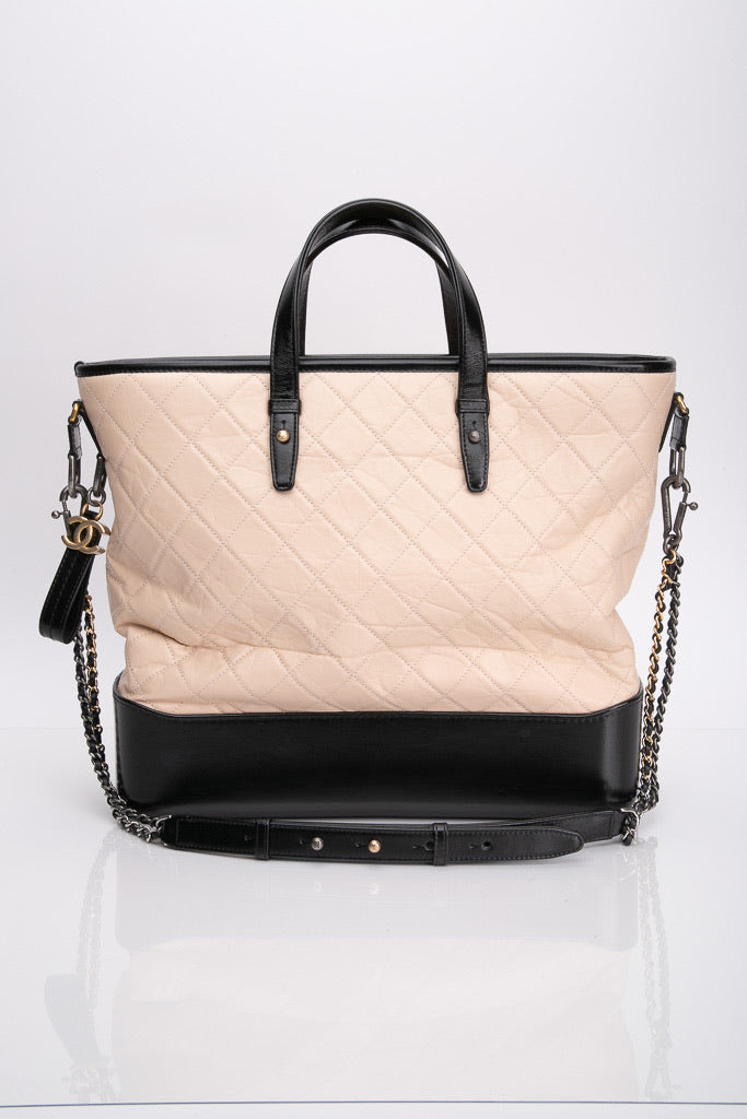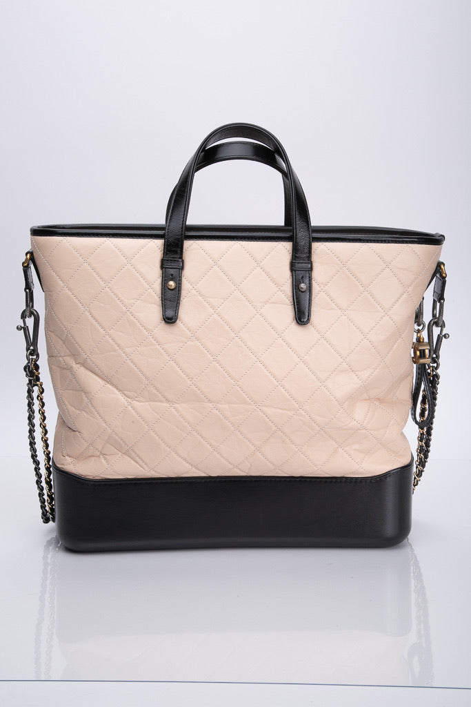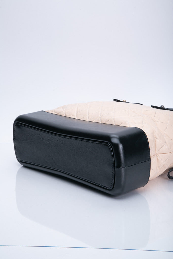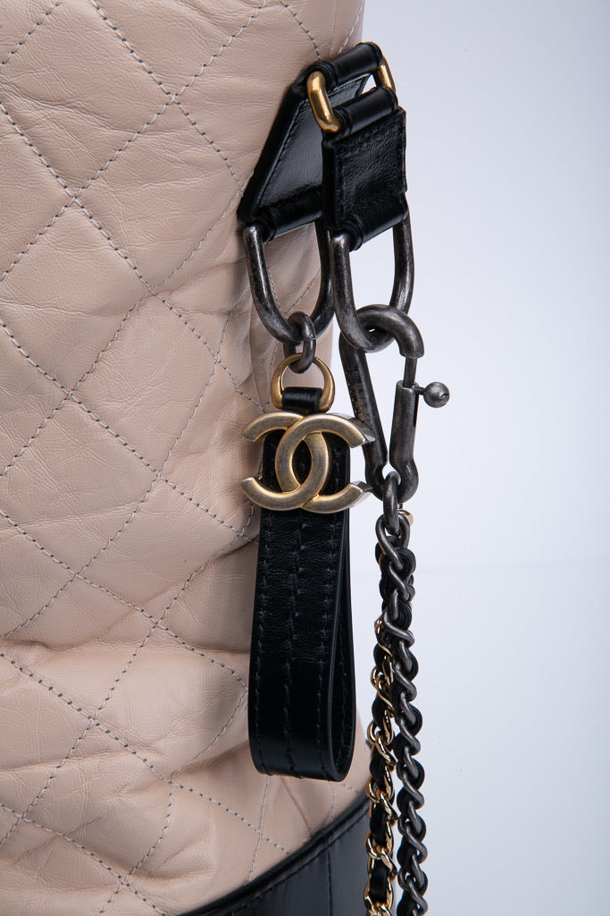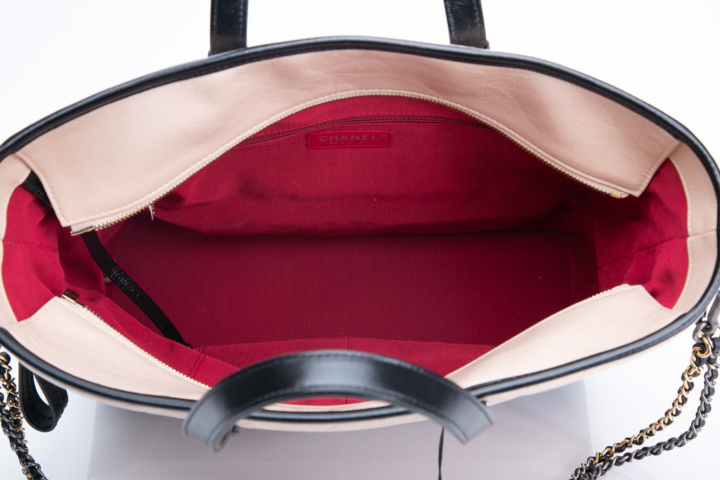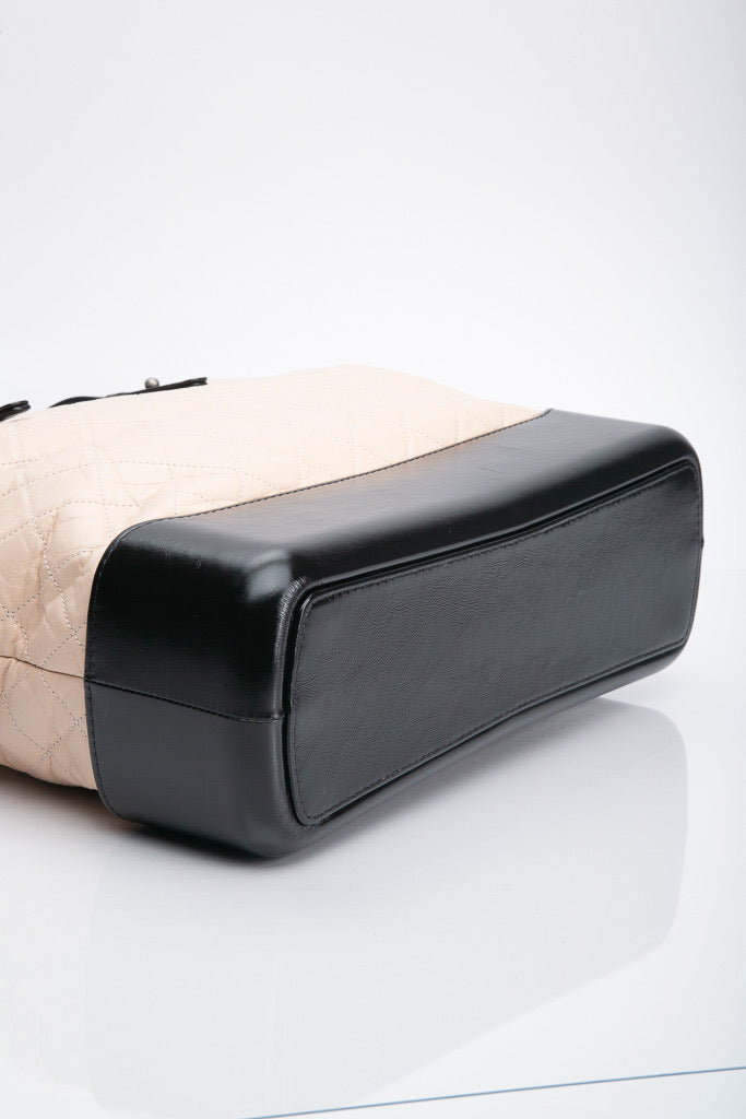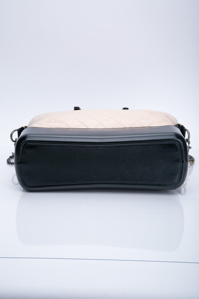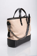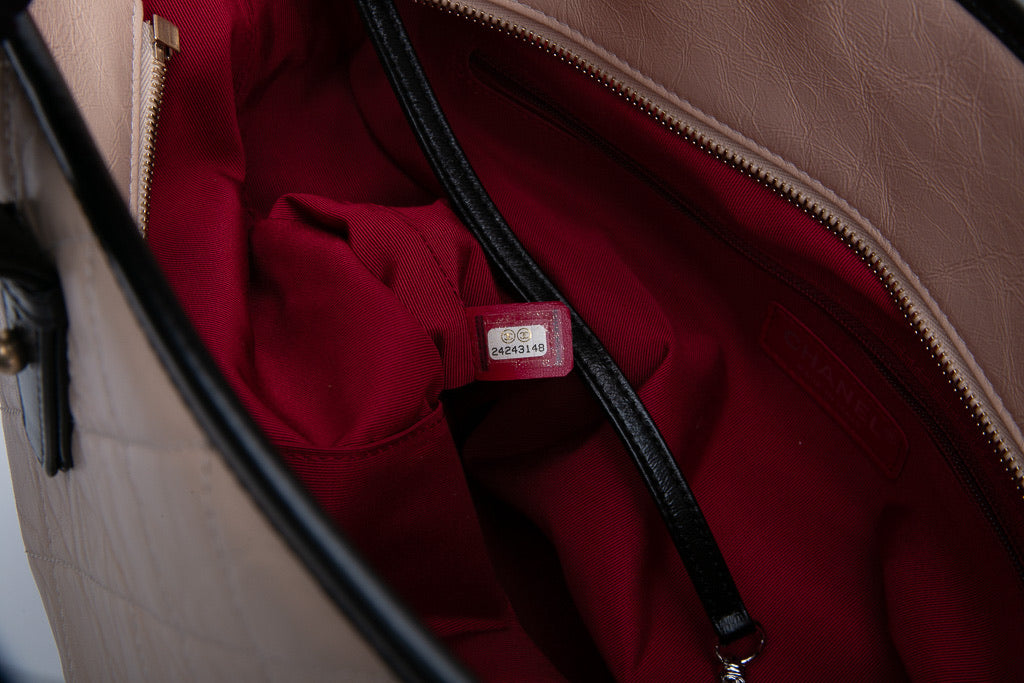 This chic hobo is crafted of diamond-stitched, textured, aged beige leather and smooth black calfskin leather. The shoulder Bag features a smooth black leather base, polished gold, silver, and ruthenium chain threaded black leather shoulder strap and black leather zipper pull with a matte gold CC logo. This versatile Bag can be in a multitude of ways. The top zipper pull opens to a spacious a deep red fabric interior with patch and zipper pockets.