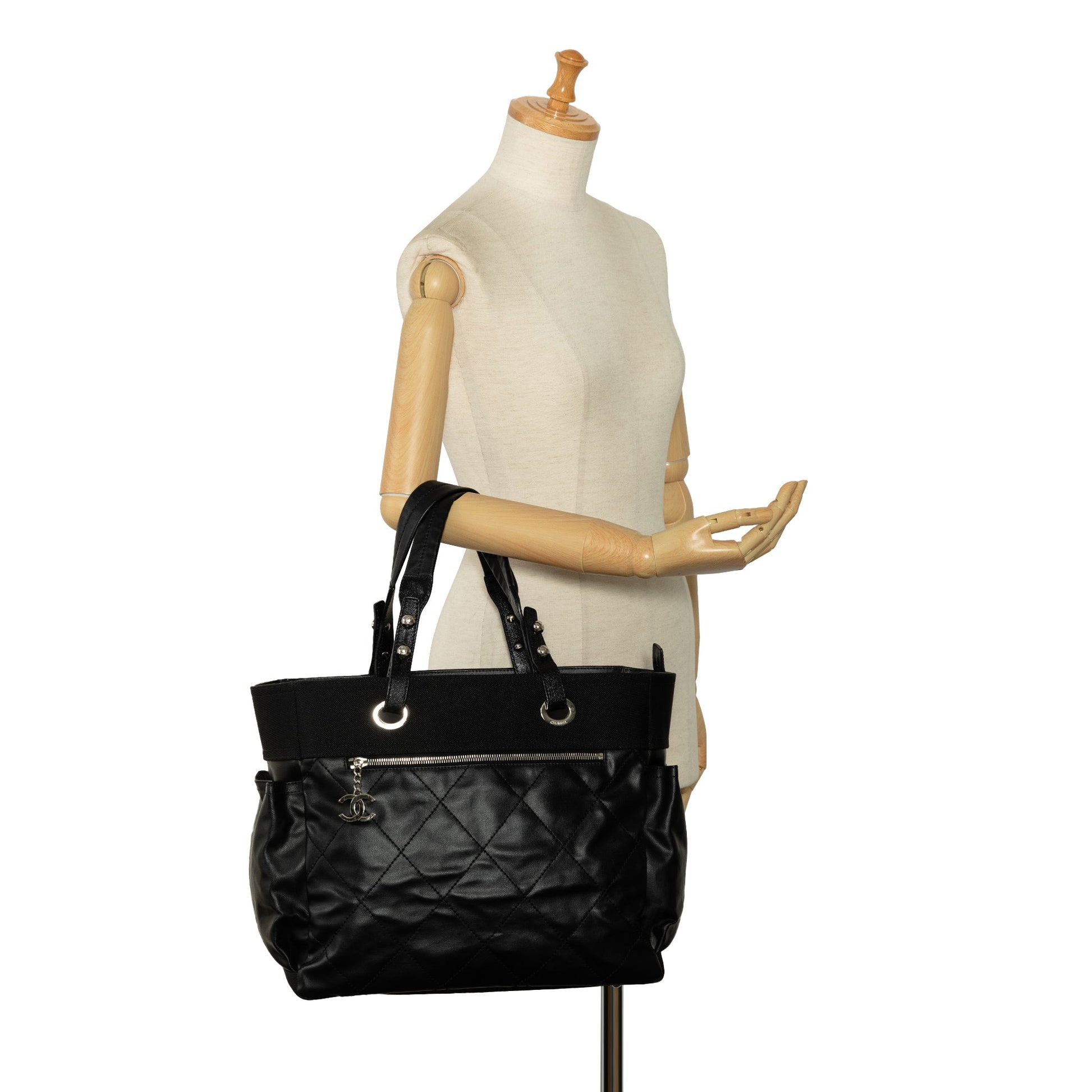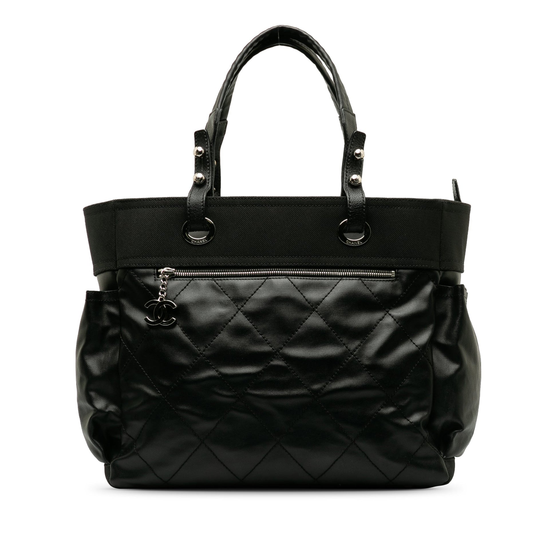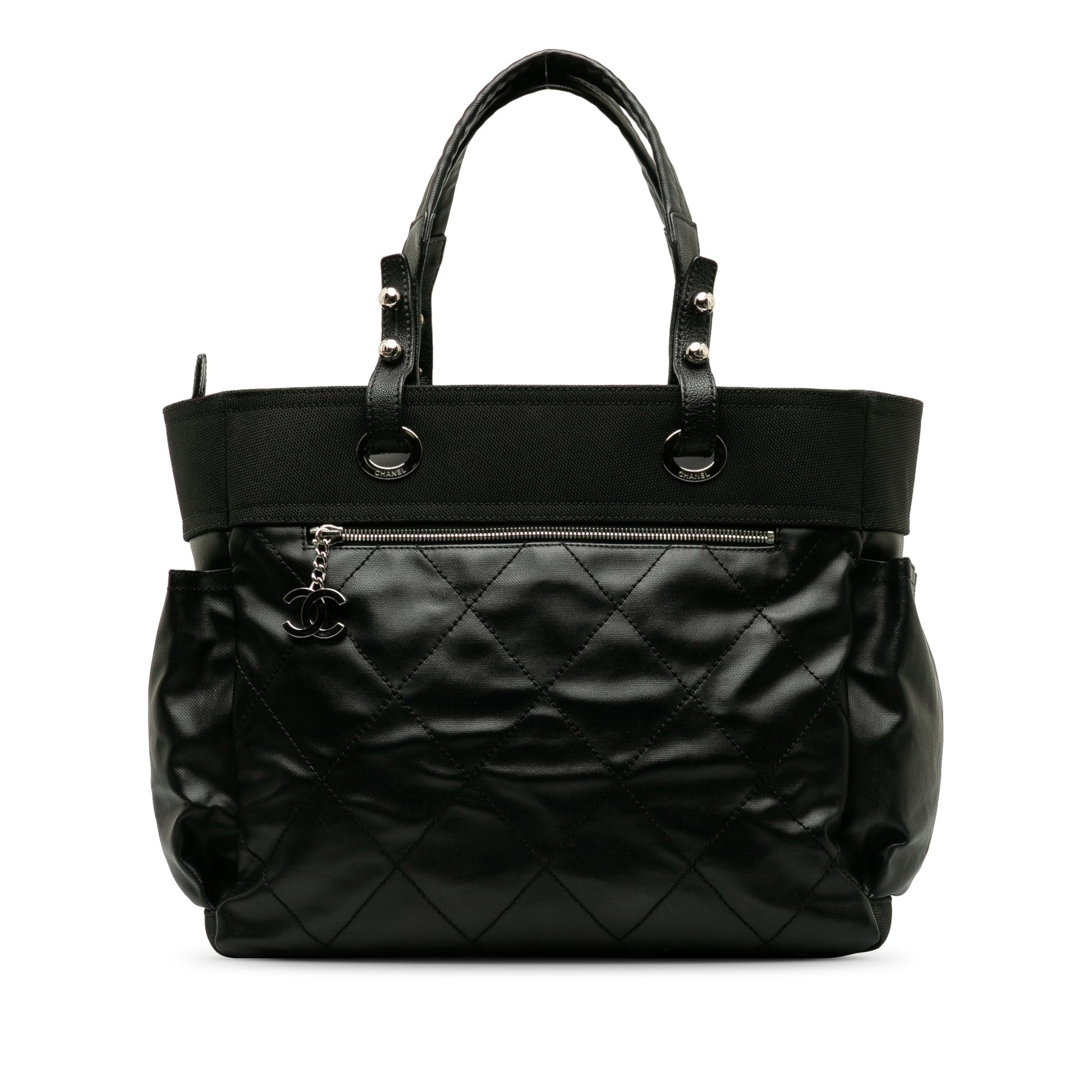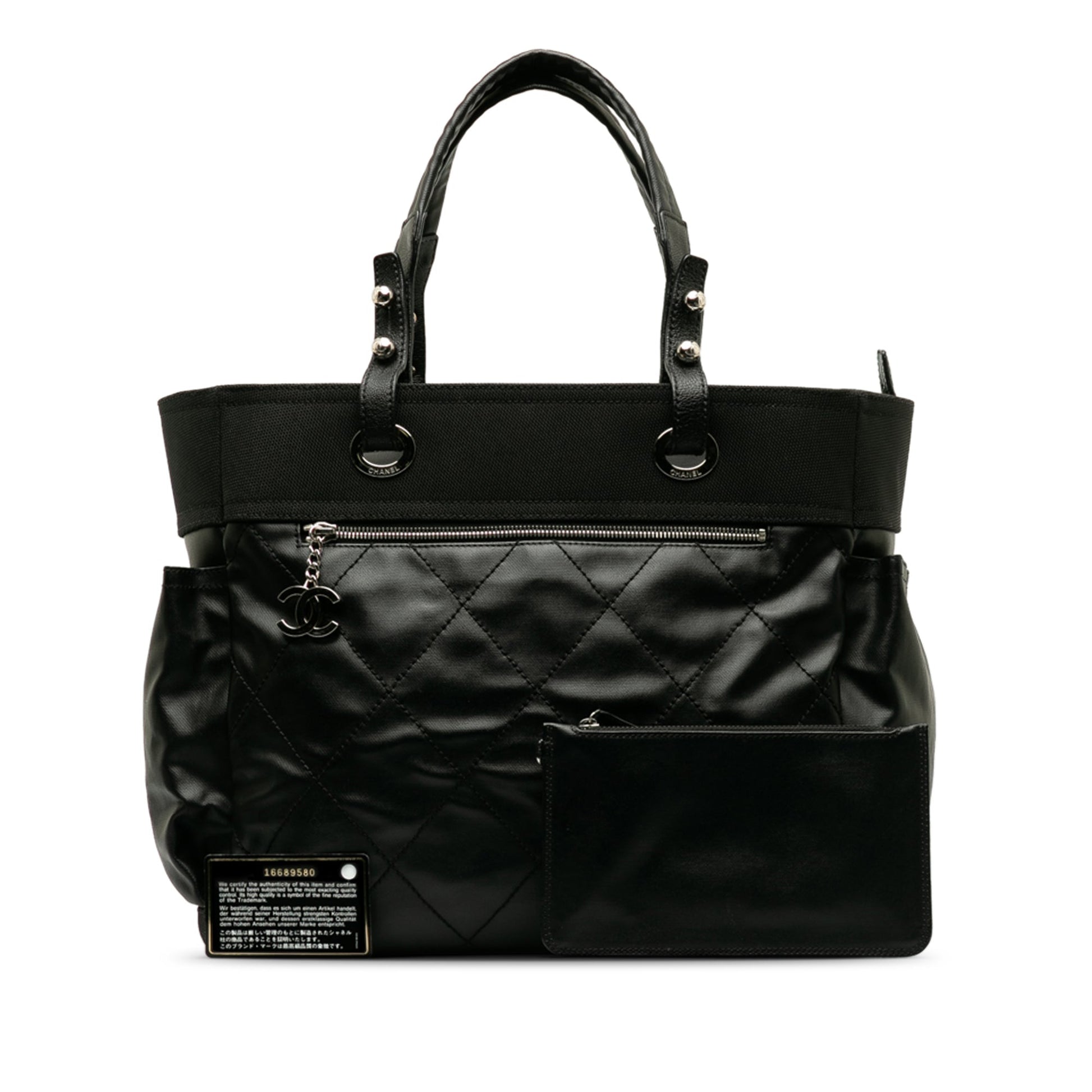 The Paris Biarritz Tote Bag features a coated canvas body with leather trim, flat canvas and leather handles, a top zip closure, side exterior slip pockets, and interior zip and slip pockets. Comes with ity card.