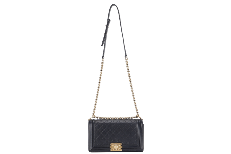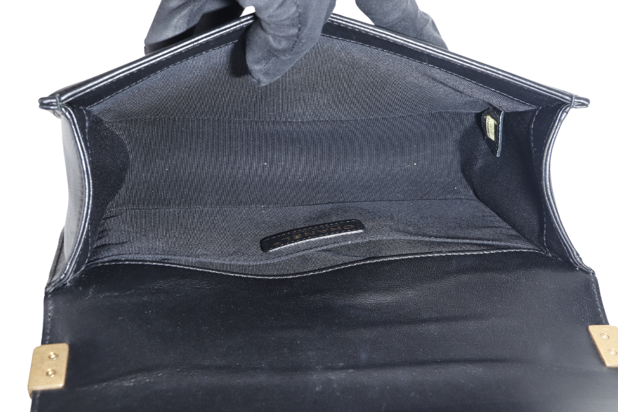 CHANEL LE BOY OLD MEDIUM (2165xxxx) BLACK LAMBSKIN GOLD HARDWARE WITH DUST COVER, AND BOX