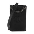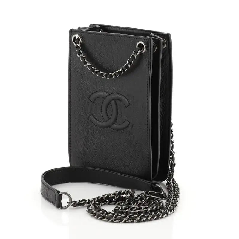 This chic case is crafted of luxurious calfskin leather with a silver chain link leather threaded cross-body strap. The top opens to a fabric interior for the latest iPhones with the timeless style only from Chanel!
