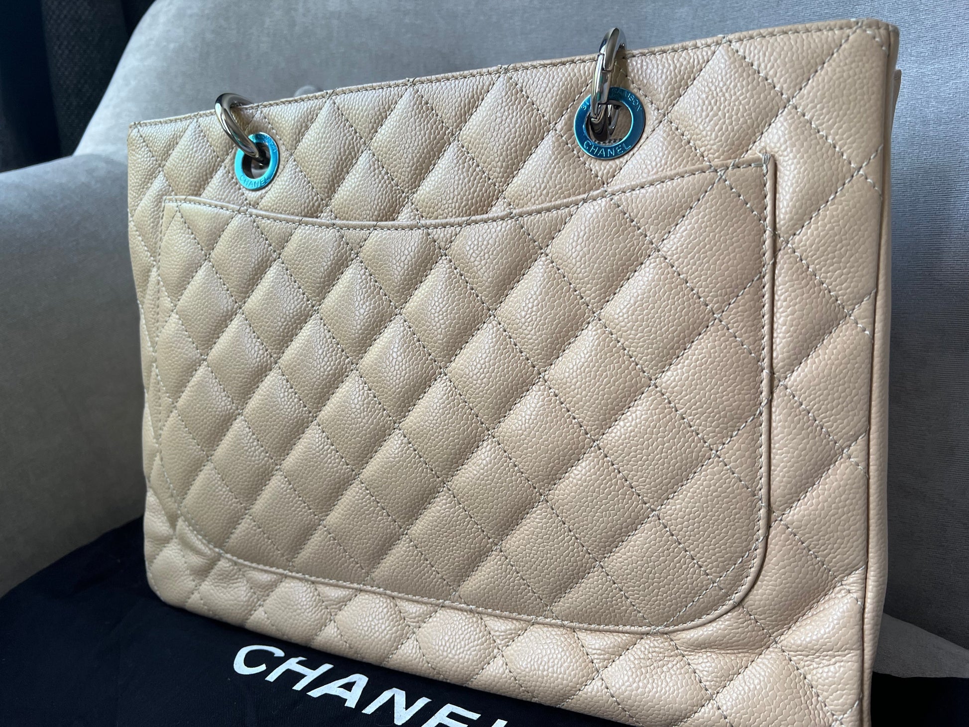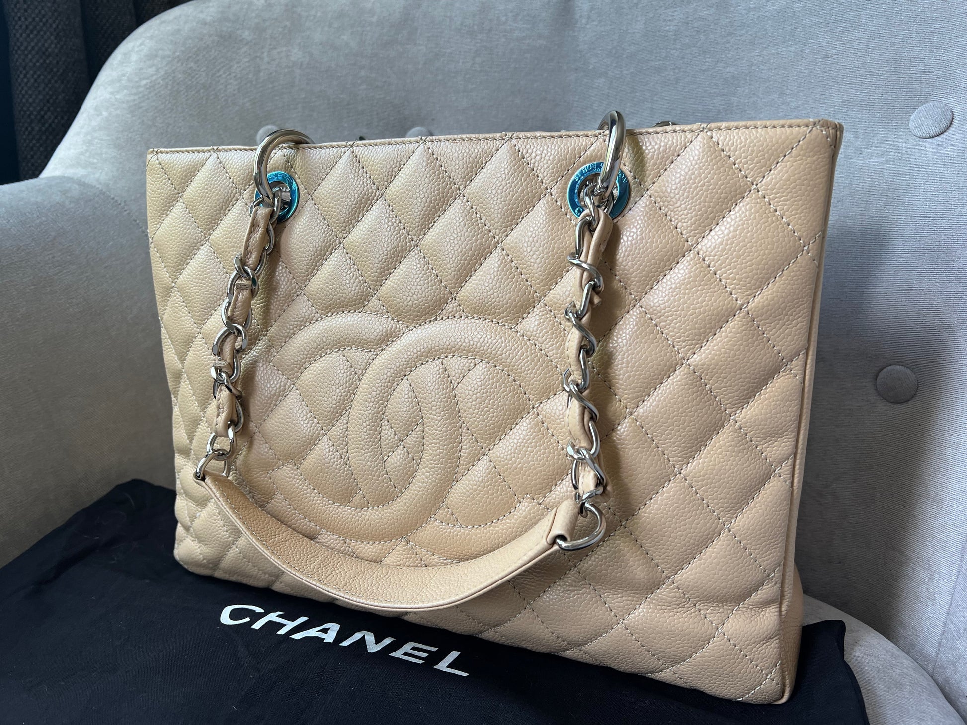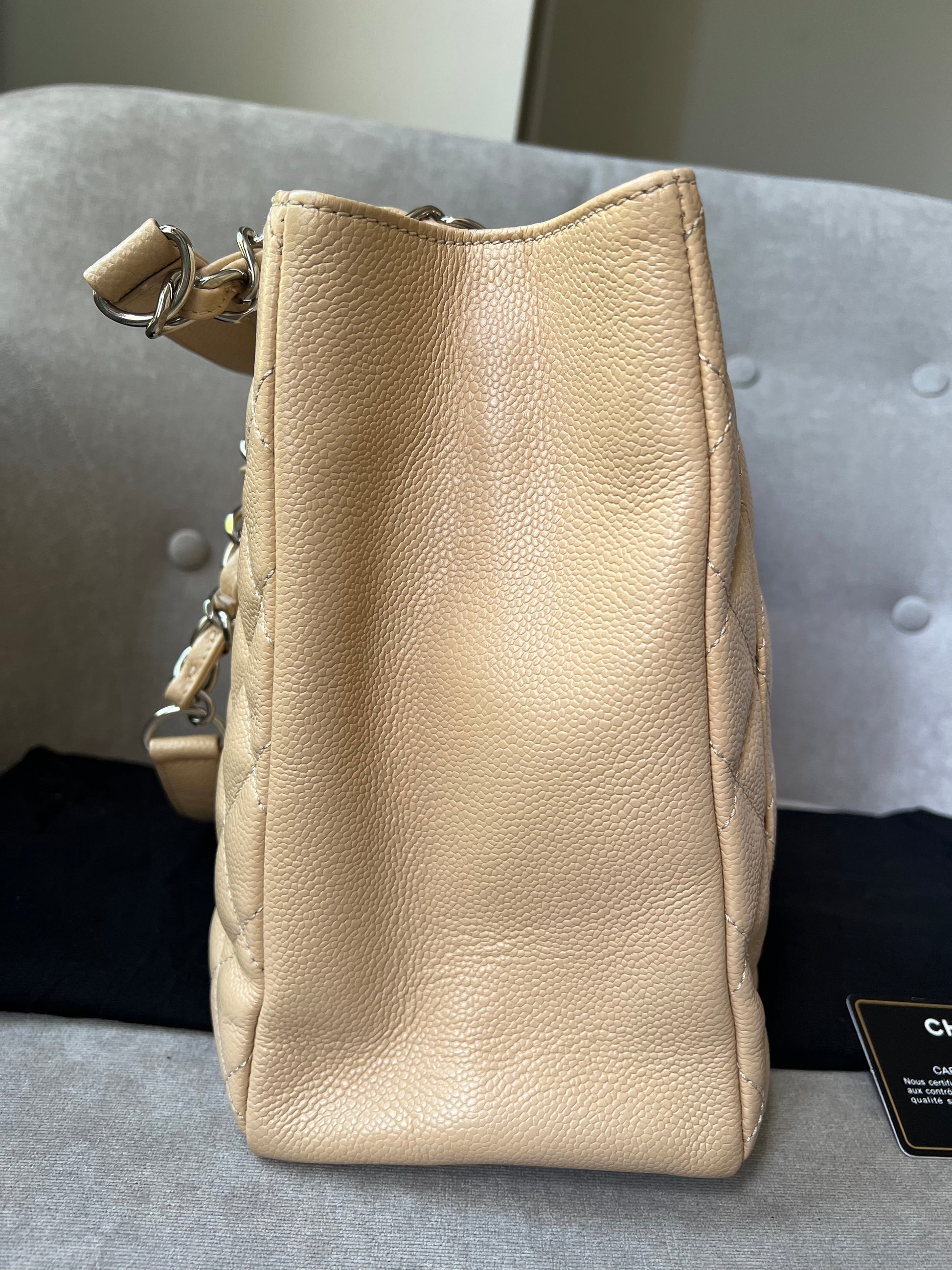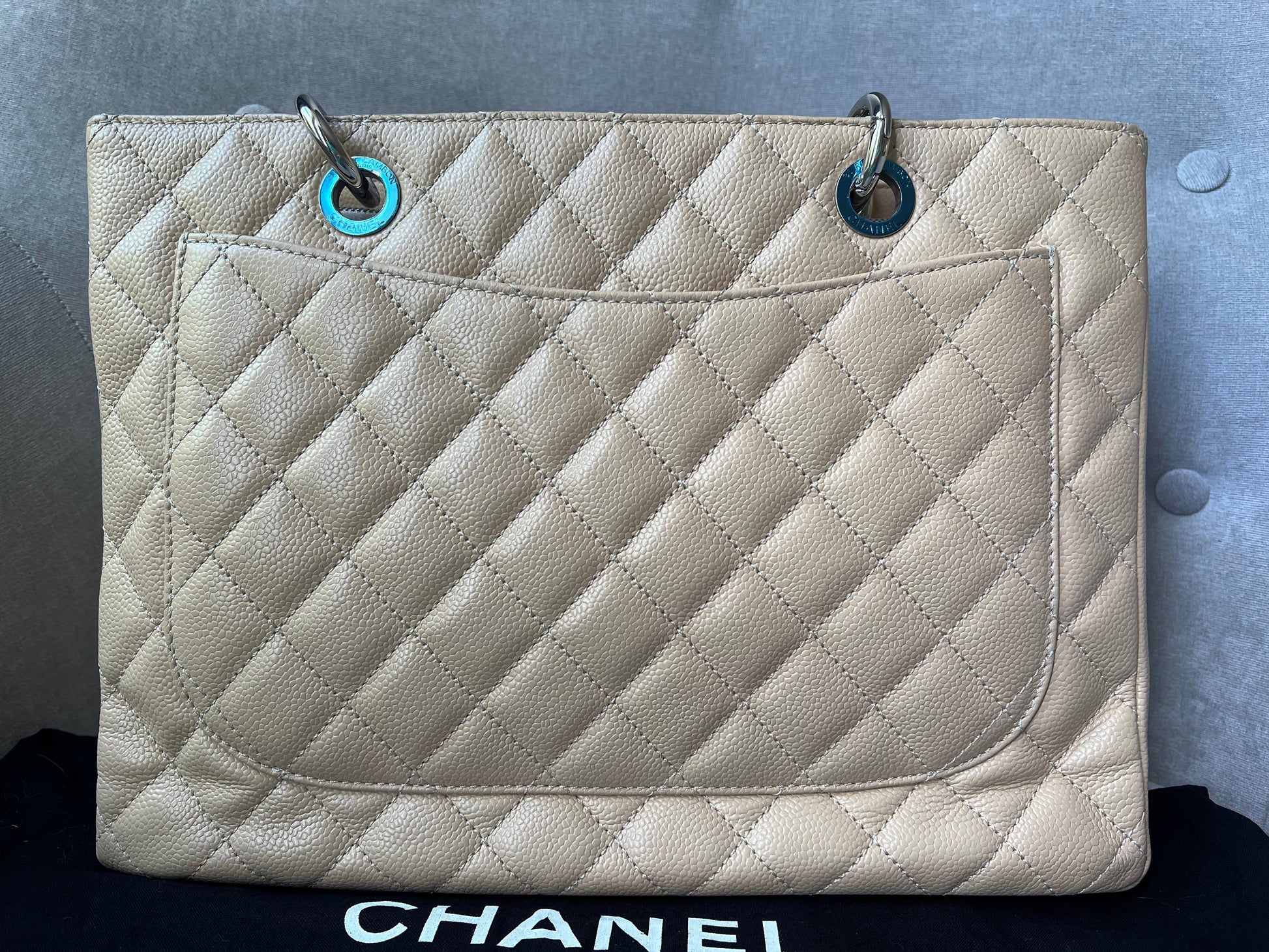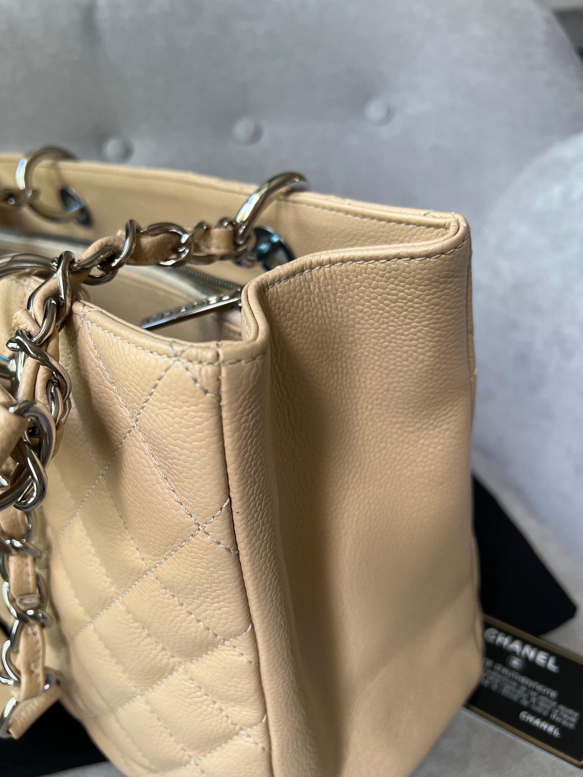 Chanel Grand Shopper Tote (GST) in Light Beige Caviar Leather with silver hardware. This very popular chain tote is sadly now discontinued and only available to buy . Great opportunity to own a practical, iconic and sophisticated Chanel bag without the same price tag as the classic flap styles. Perfect for day or evening use and the caviar leather is very resilient and durable. Can be carried in the crook of the arm or over shoulder using the chain straps.