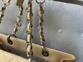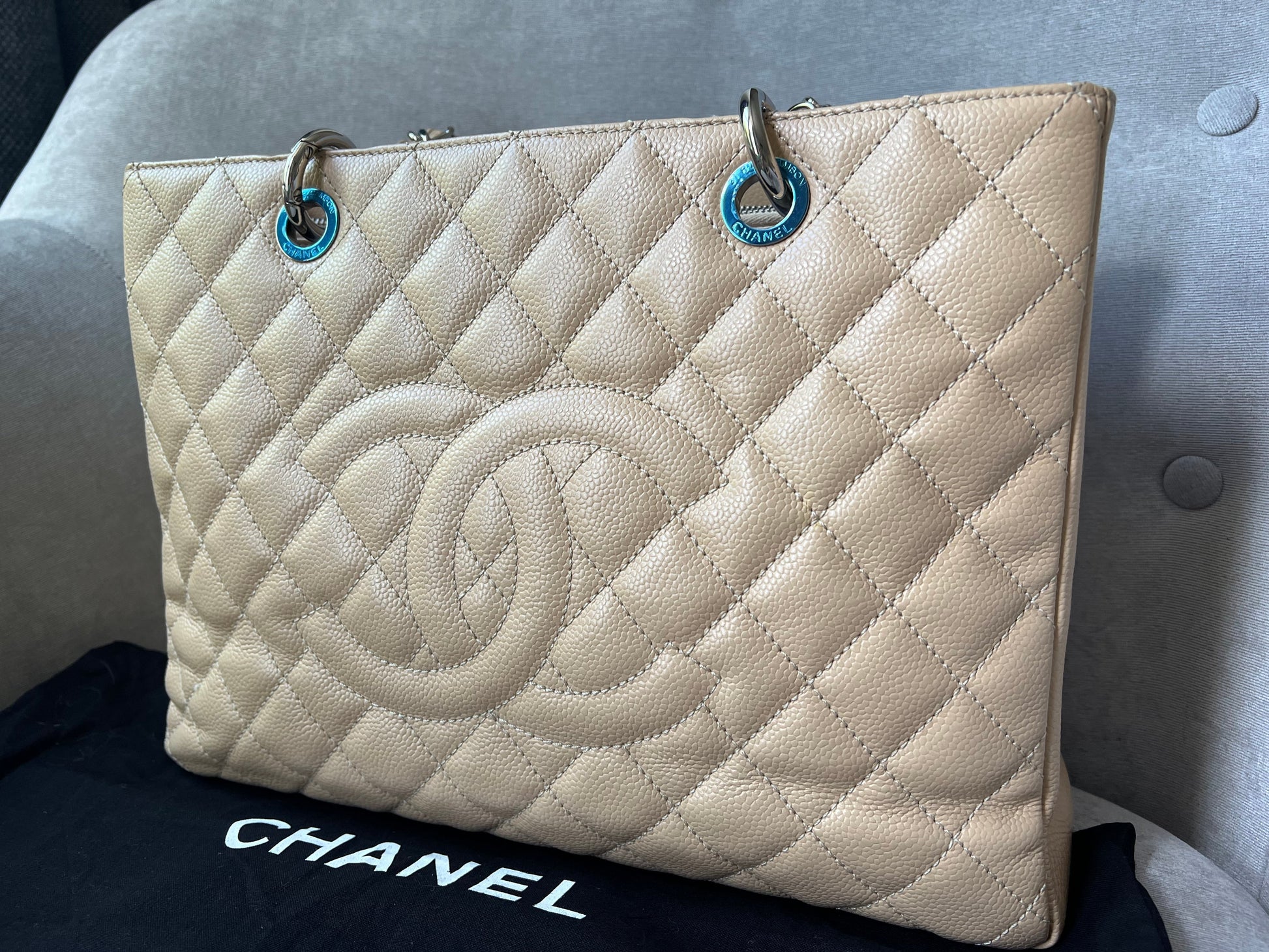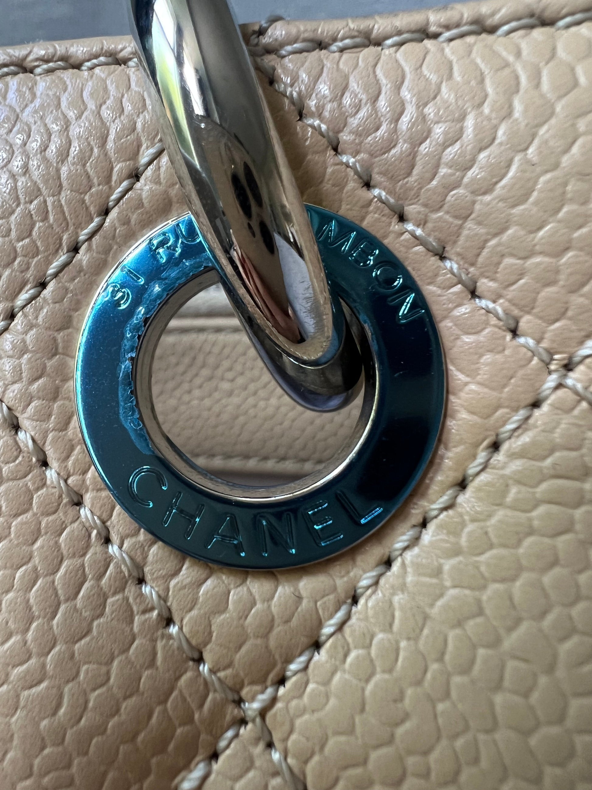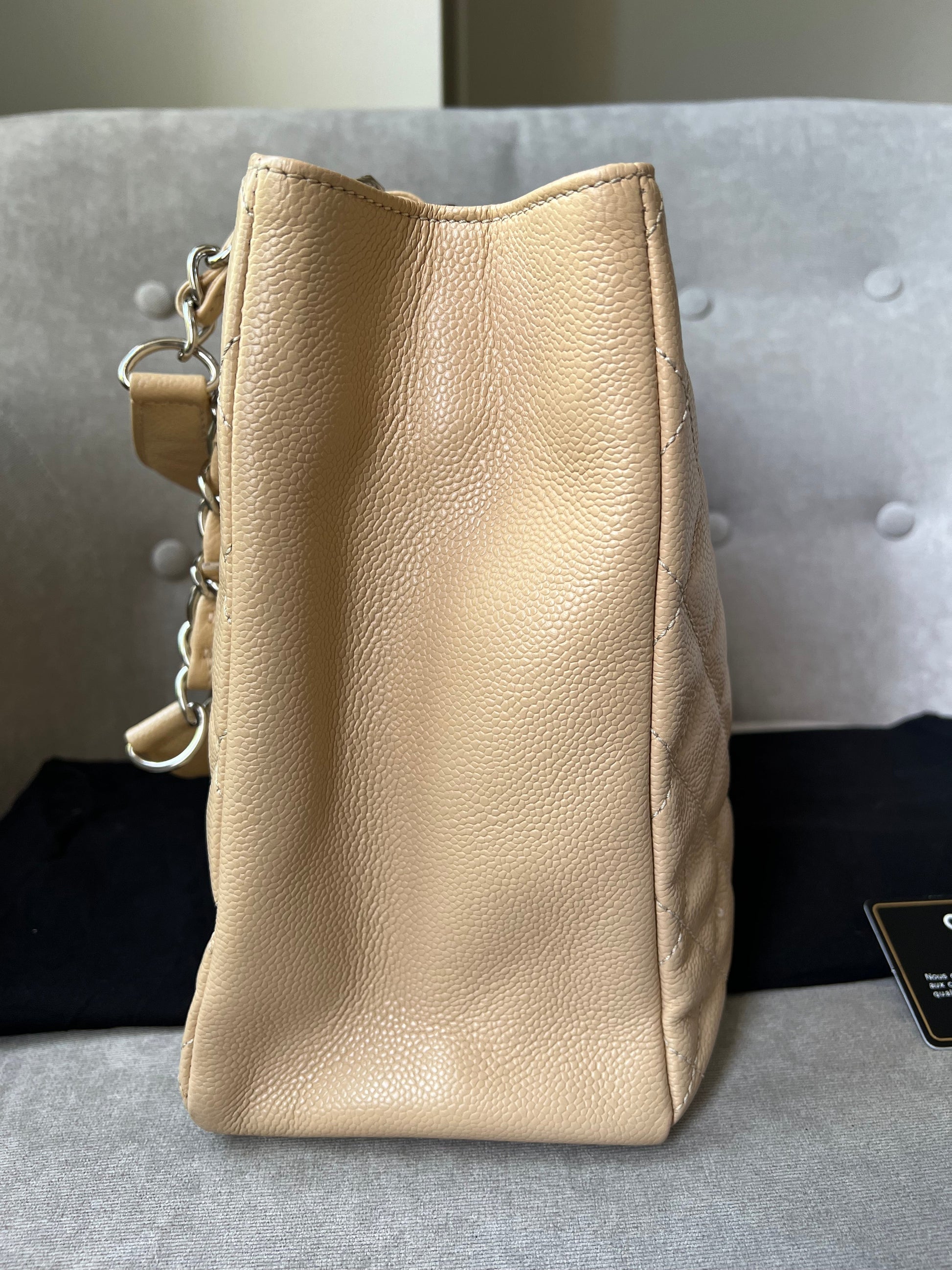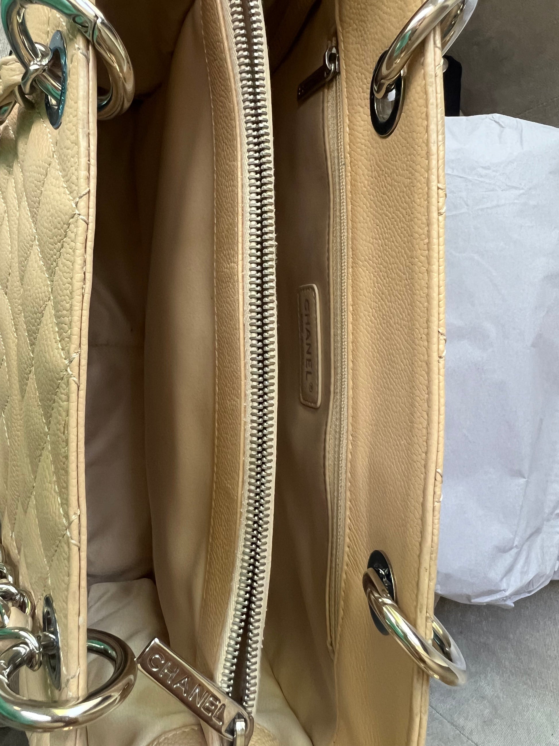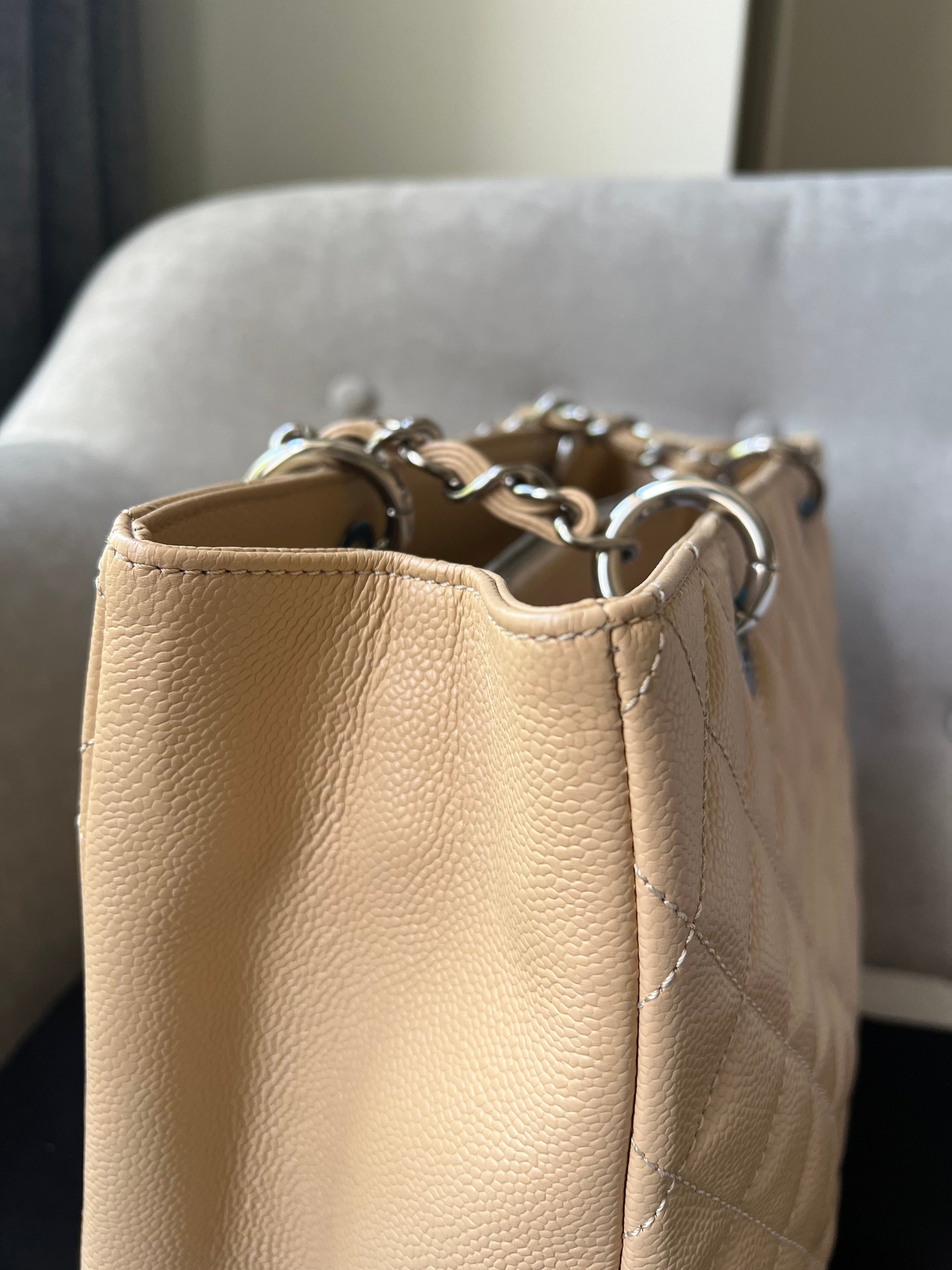 Chanel Grand Shopper Tote (GST) in Light Beige Caviar Leather with silver hardware. This very popular chain tote is sadly now discontinued and only available to buy . Great opportunity to own a practical, iconic and sophisticated Chanel bag without the same price tag as the classic flap styles. Perfect for day or evening use and the caviar leather is very resilient and durable. Can be carried in the crook of the arm or over shoulder using the chain straps.