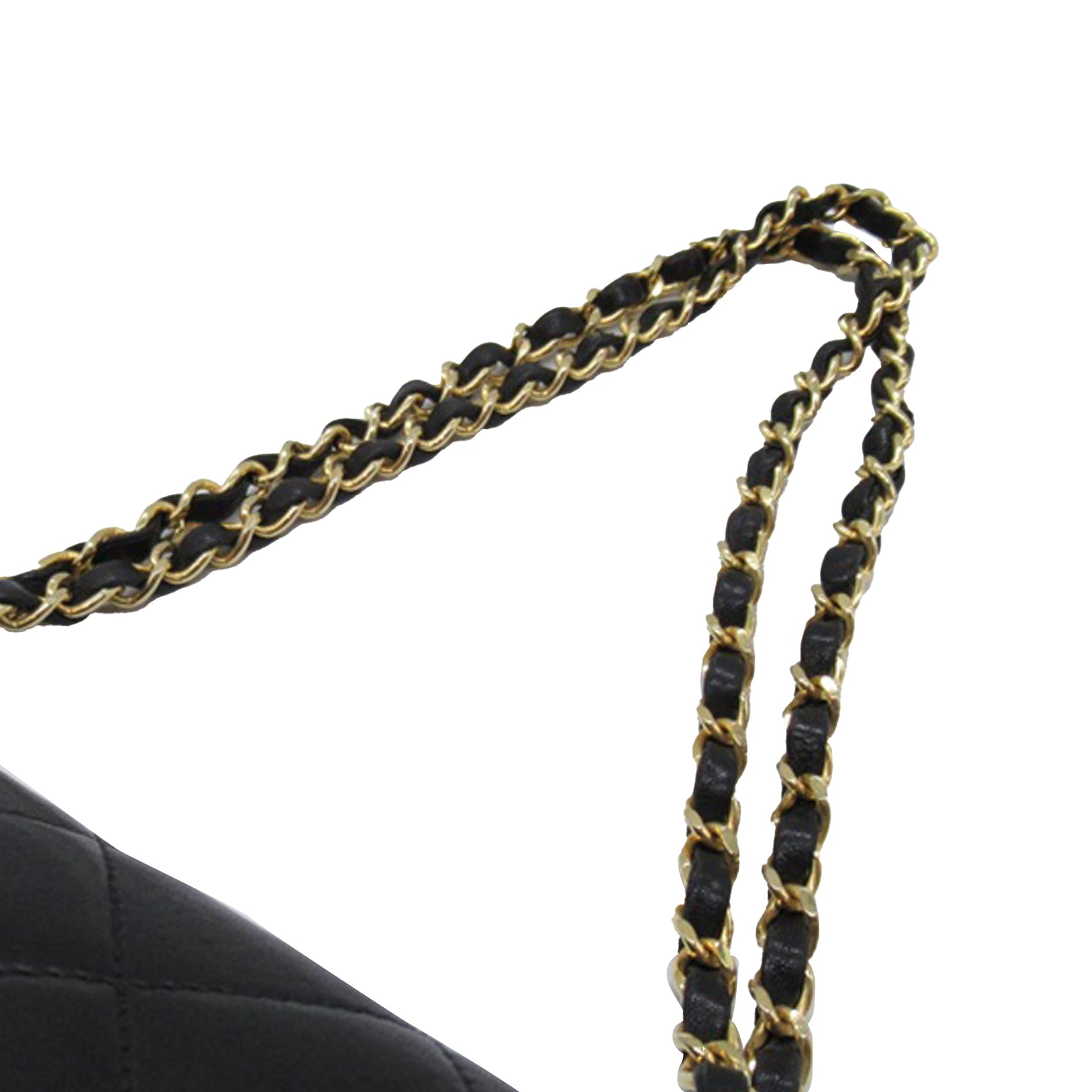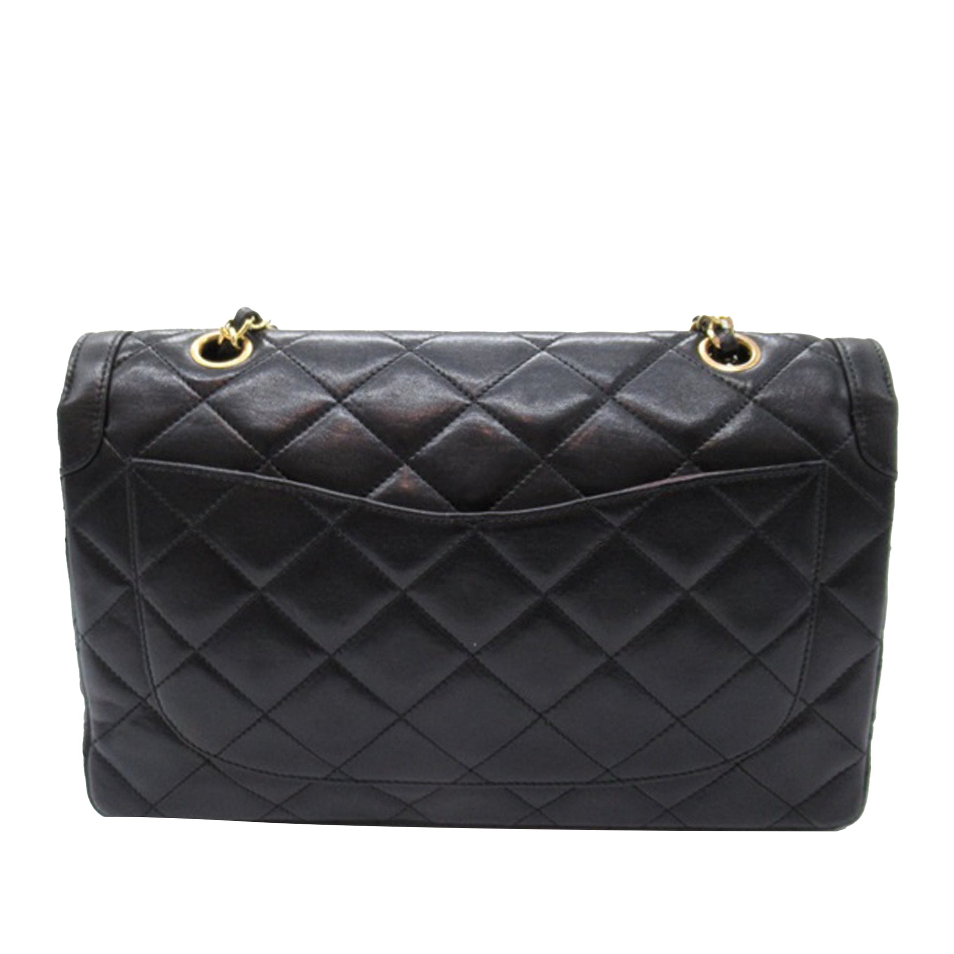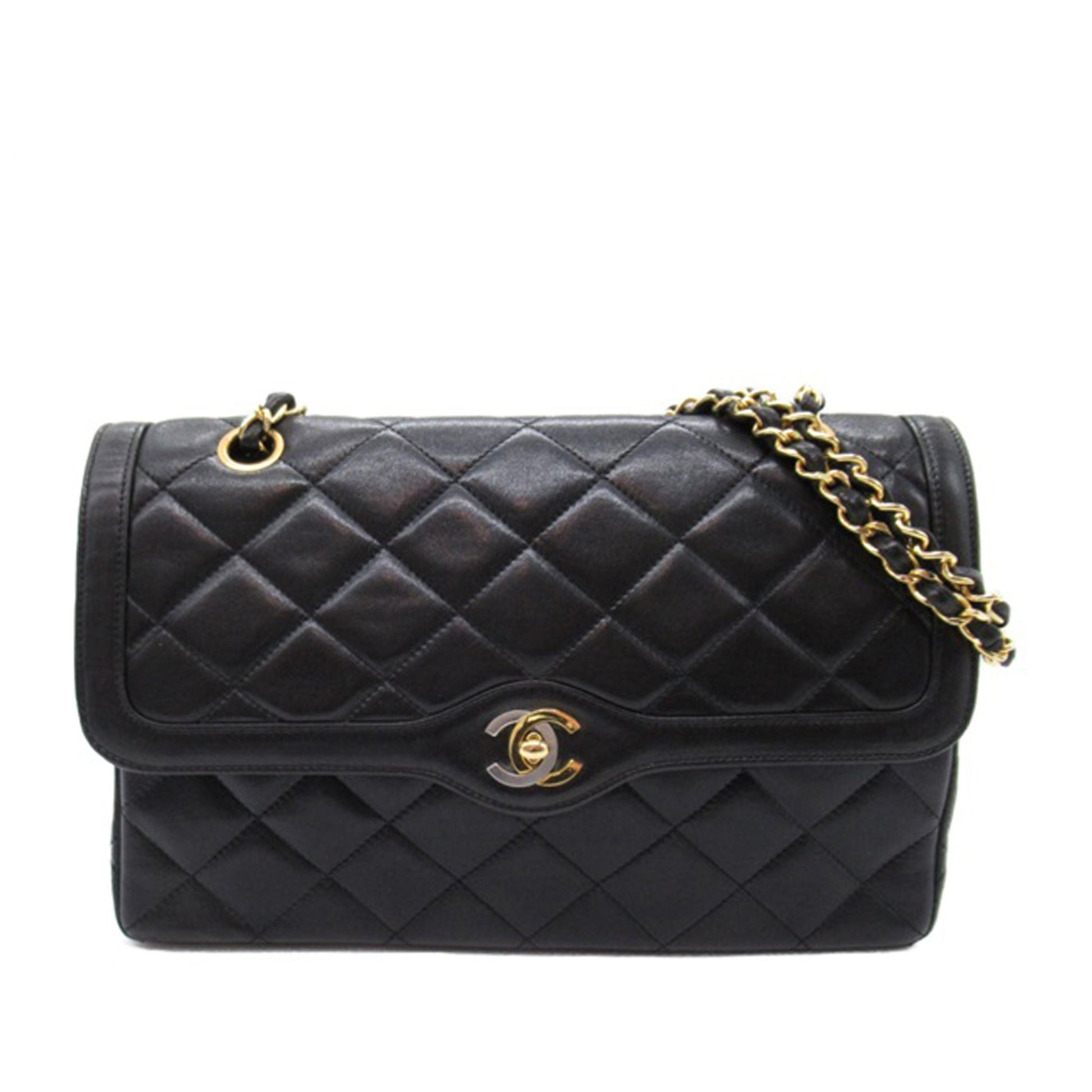 This shoulder Bag features a quilted lambskin body, leather woven chain shoulder straps, double front flaps with interlocking Cs and a twist lock closure, an exterior back slip pocket, and interior zip and slip pockets. Comes with ity card and dust Bag.
