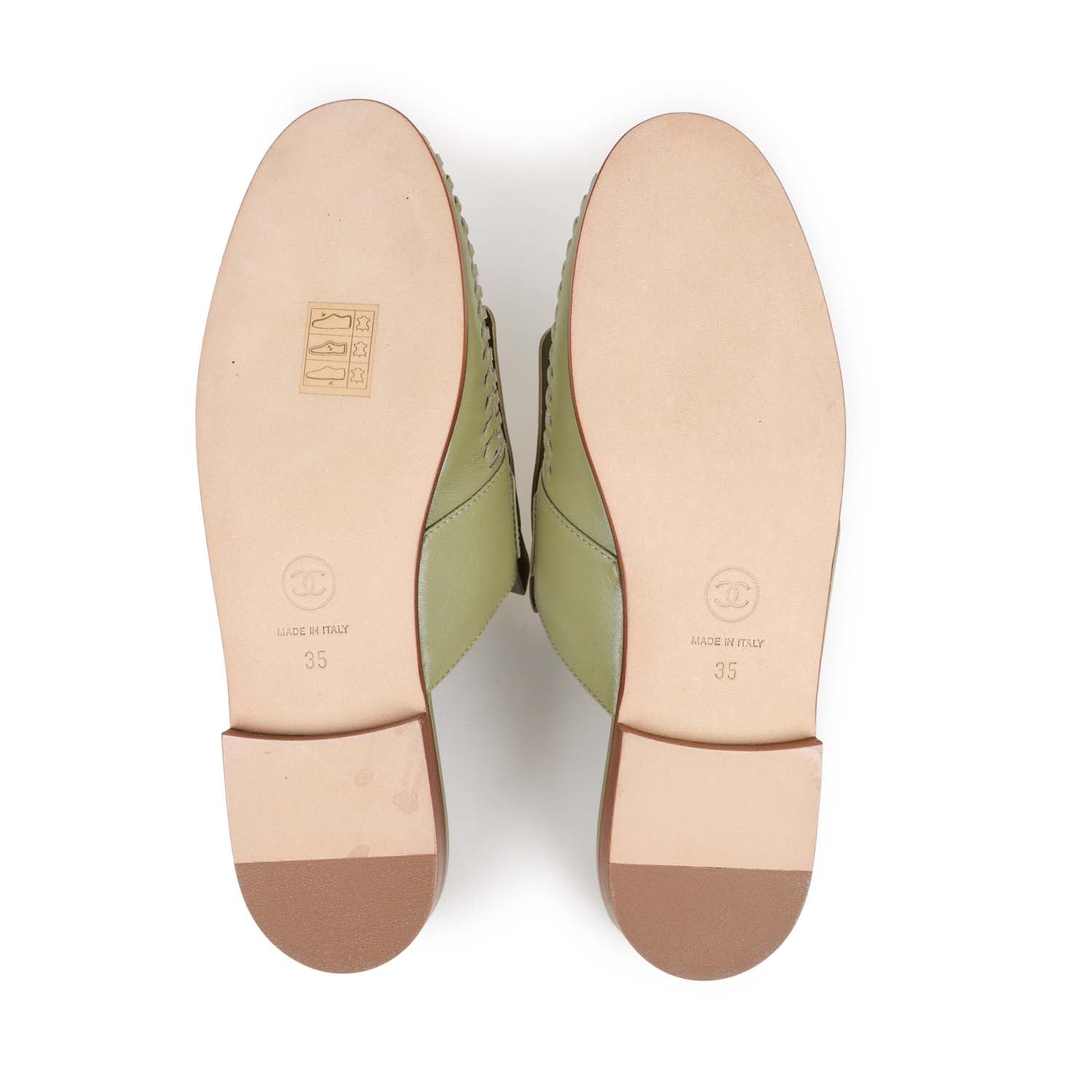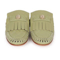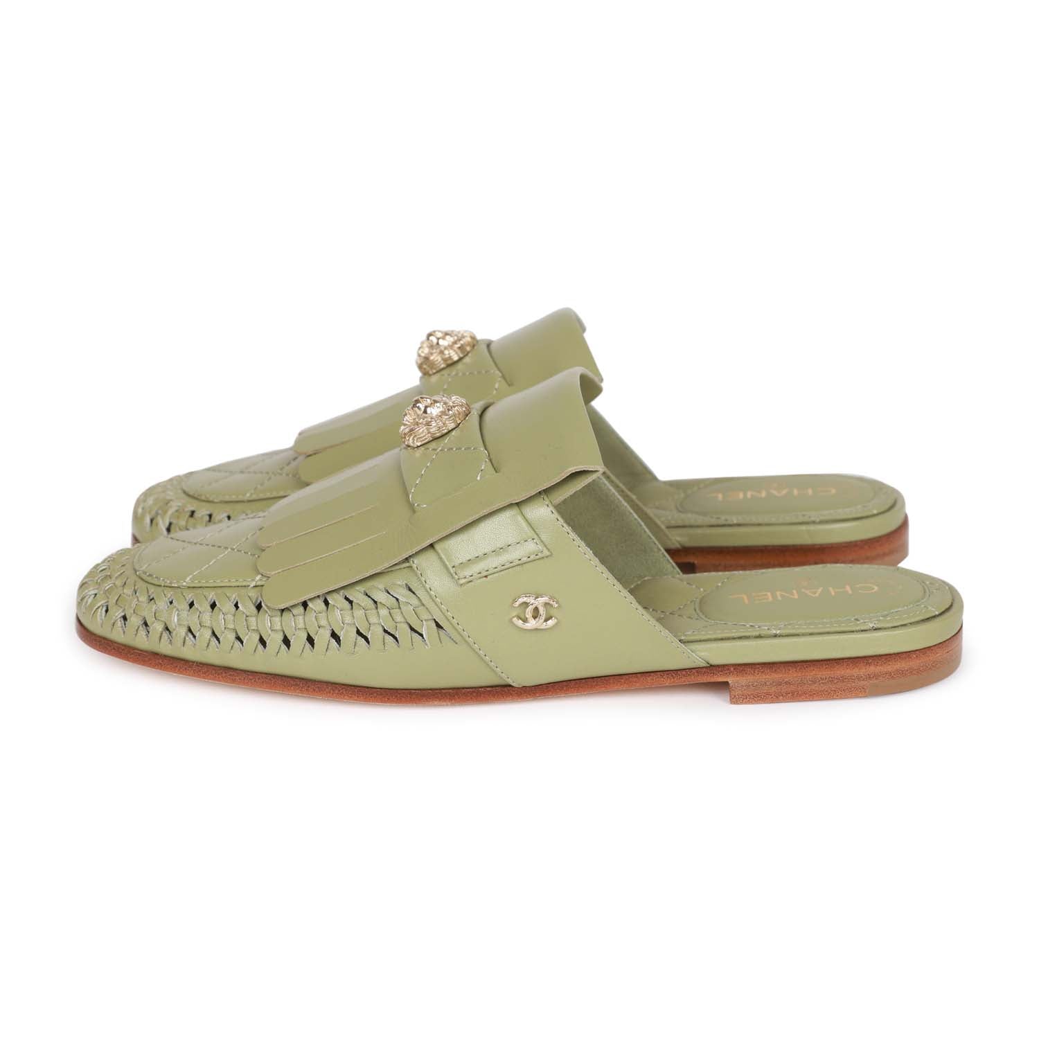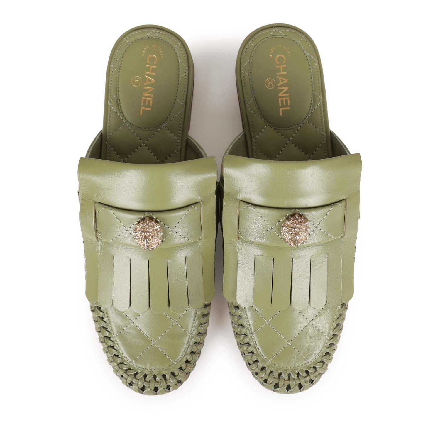Chanel Lion Head Mules in Sage Green Fringe Leather 35