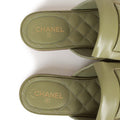 This pair of Chanel Mules is in Sage Green Quilted Lambskin with light gold Lion Head adornments, fringe detail, and "CC" logo with cutout trim and leather sole/heel in size 35EU.