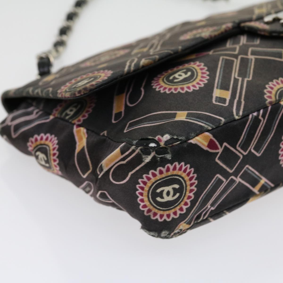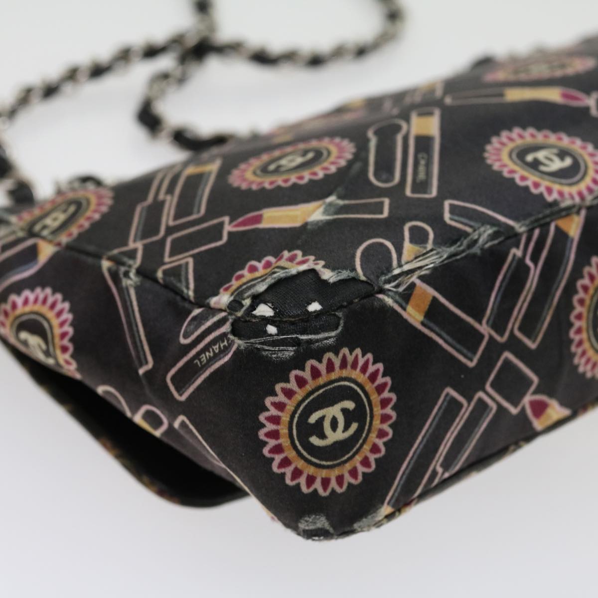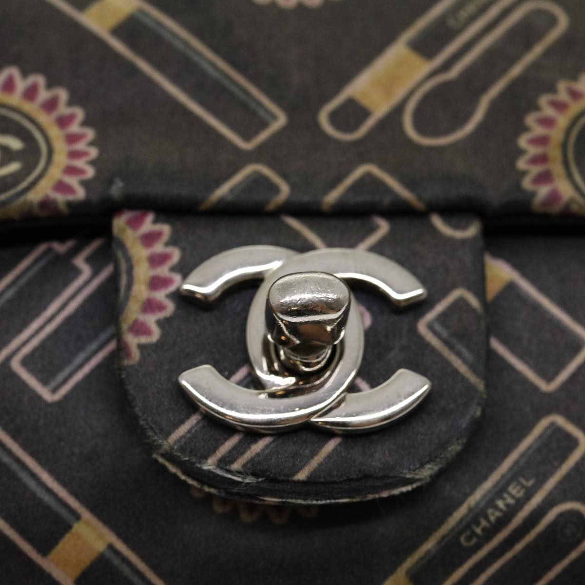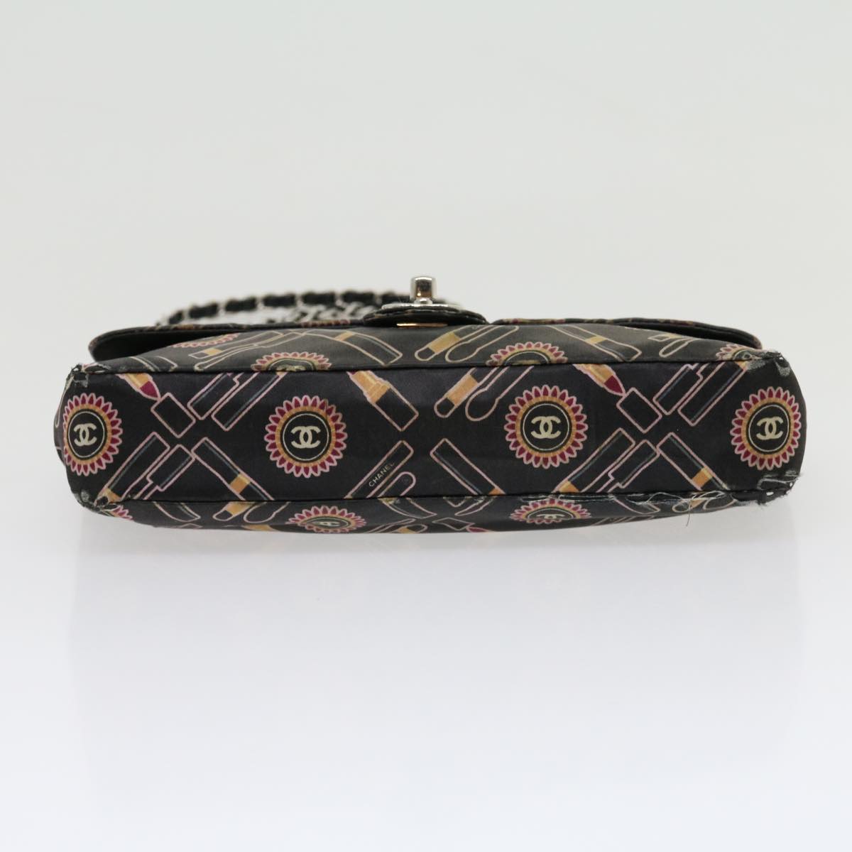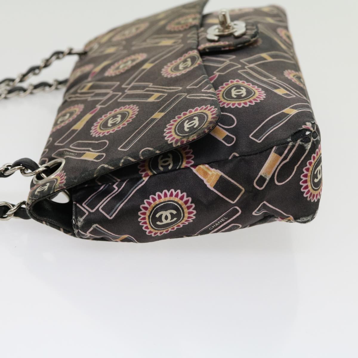 Chanel Lip Chain Turn Lock Shoulder Bag Satin Black CC 30892