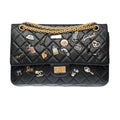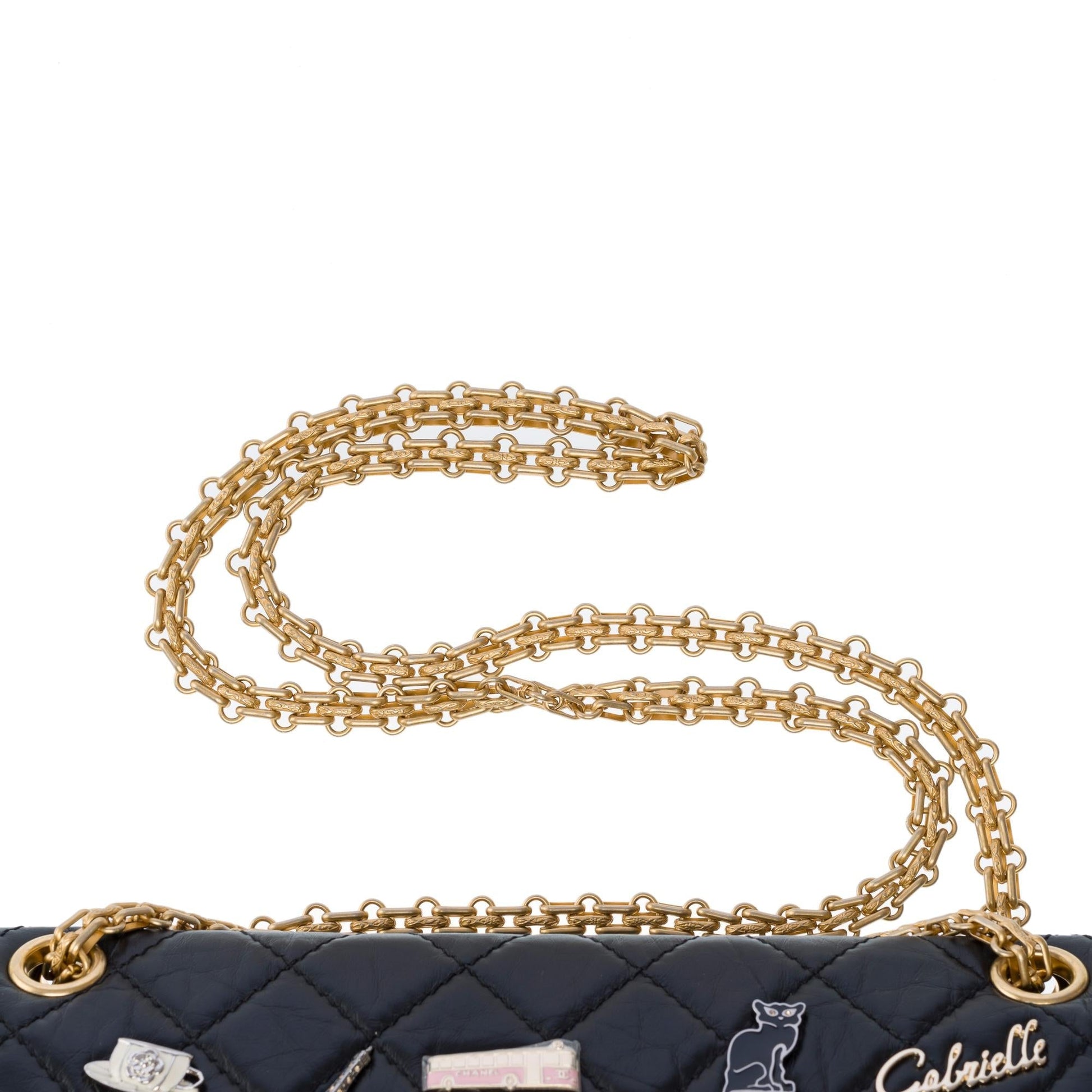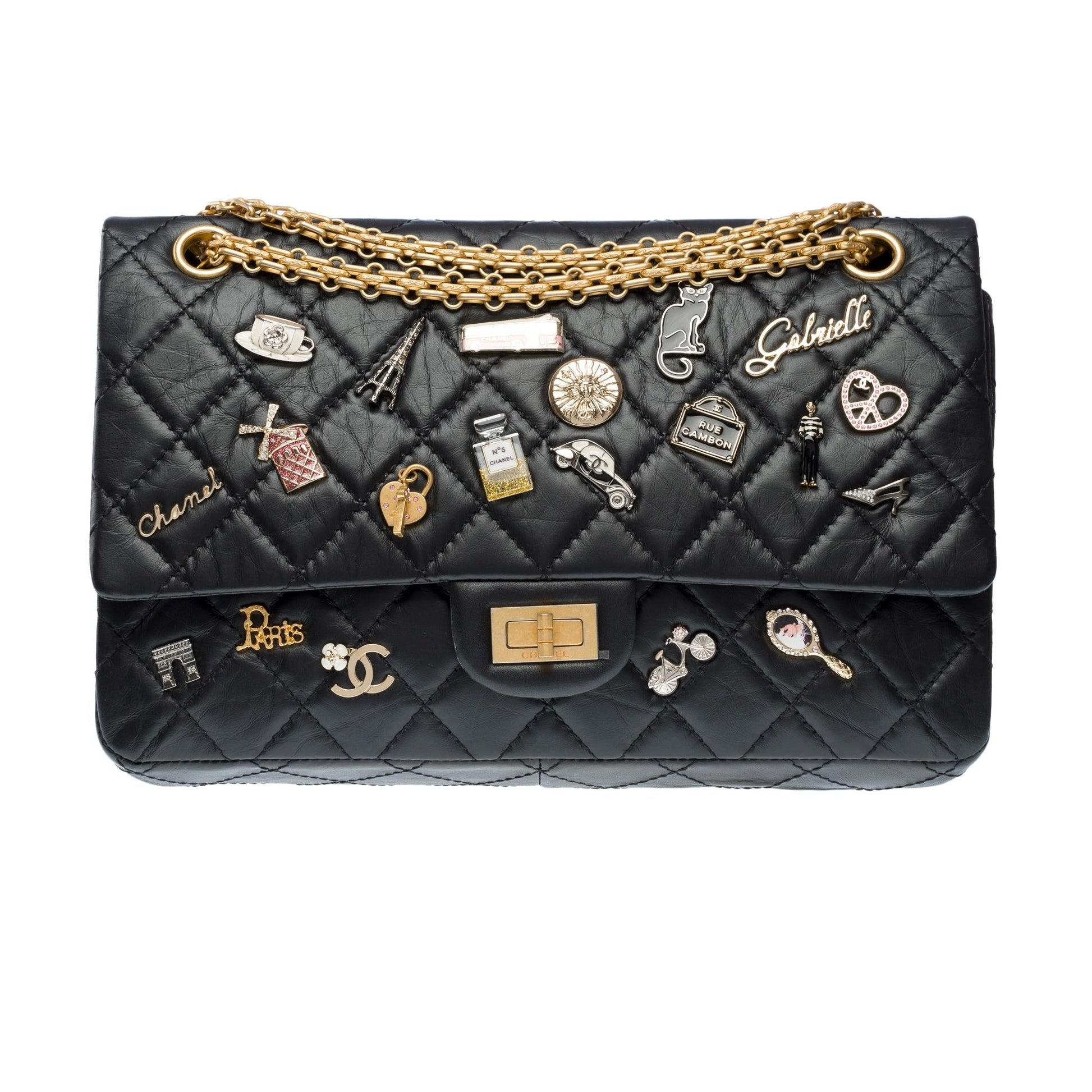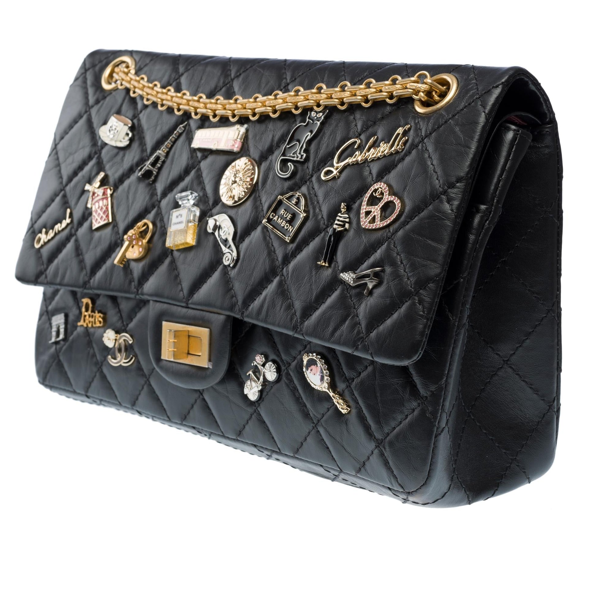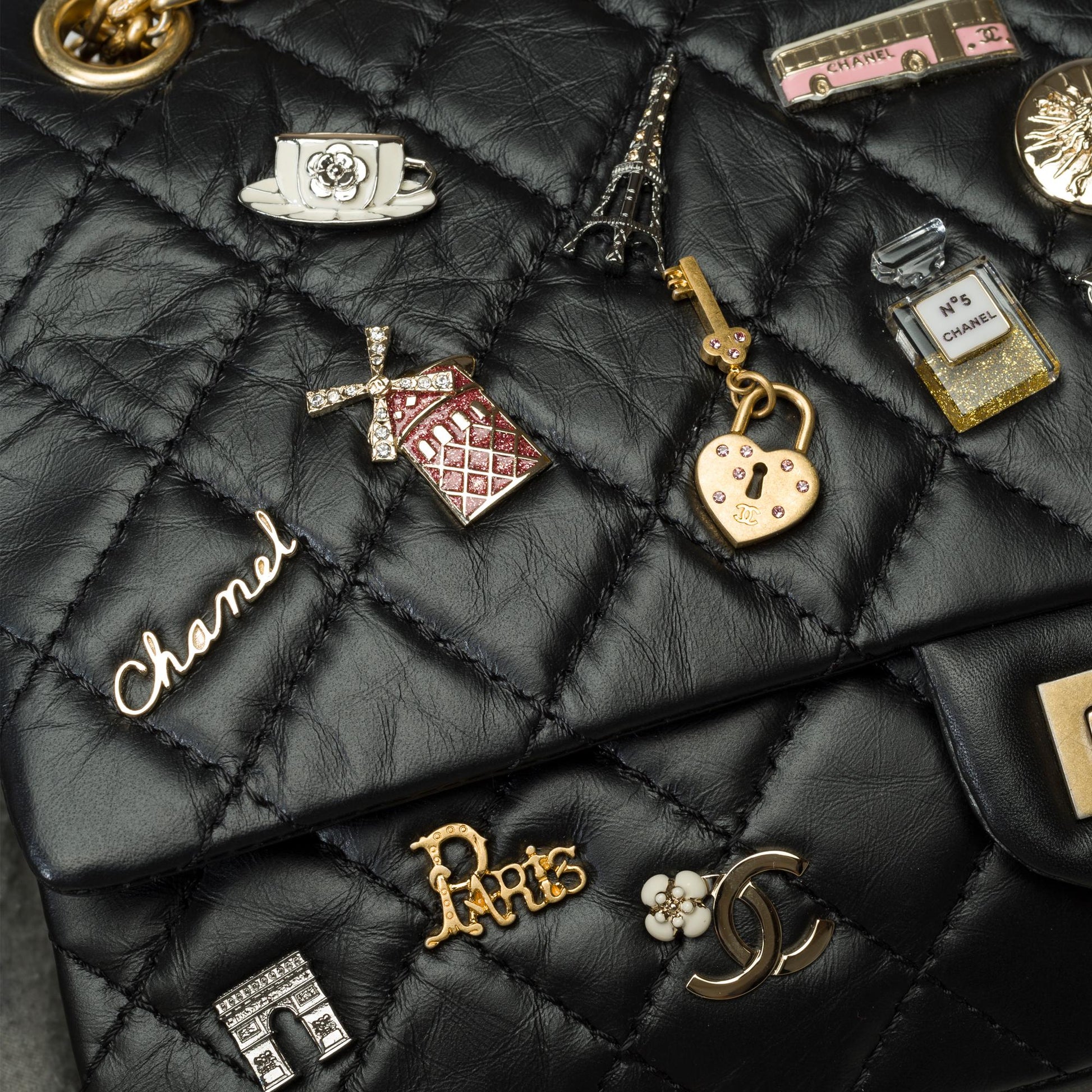 Amazing? ?and? ?Rare? ?Chanel? ?2.55? ?limited? ?edition? ?2.55? ?Metiers? ?d'art? ?2017? ?"Lucky? ?Charms"? ?double? ?flap? ?shoulder? ?bag? ?in? ?black? ?quilted? ?aged? ?leather? ?adorned? ?with? ?metal? ?charms,? ?rhinestones? ?and? ?enamel,? ?antique? ?gold? ?metal? ?trim,? ?handle? ?in? ?aged? ?gold? ?metal? ?allowing? ?a? ?hand? ?or? ?shoulder? ?or? ?crossbody? ?carry 1? ?patch? ?pocket? ?on? ?the? ?back? ?of? ?the? ?bag Double? ?flap Padded? ?flap? ?closure,? ?? ?? ?2.55? ?closure? ?in? ?aged? ?gold? ?metal Inner? ?lining? ?in? ?burgundy? ?leather,? ?? ?? ?a? ?double? ?patch? ?pocket,? ?? ?? ?1? ?passing? ?lipstick Signature:? ?"ChanelMade? ?in? ?France" Date:? ?2017 Dimensions:? ?24x15x7? ?cm? ?(9,5x5,9x2,7? ?Inches) Chain? ?length:? ?50? ?cm? ?(19.7? ?Inches) Reference:? ?101417 Packaging Hologram:? ?Yes ity? ?card:? ?Yes Dustbag:? ?Yes Box:? ?No General? ?condition:? ?7/10 In? ?very? ?good? ?general? ?condition? ?despite? ?slight? ?wear? ?marks? ?on? ?the? ?leather? ?(slight? ?fold? ?under? ?the? ?bag),? ?inner? ?leather? ?and? ?trim? ?(scratches) extra charge option: Certificate of ity issued by a judicial expert at the Appeal Court of Paris