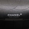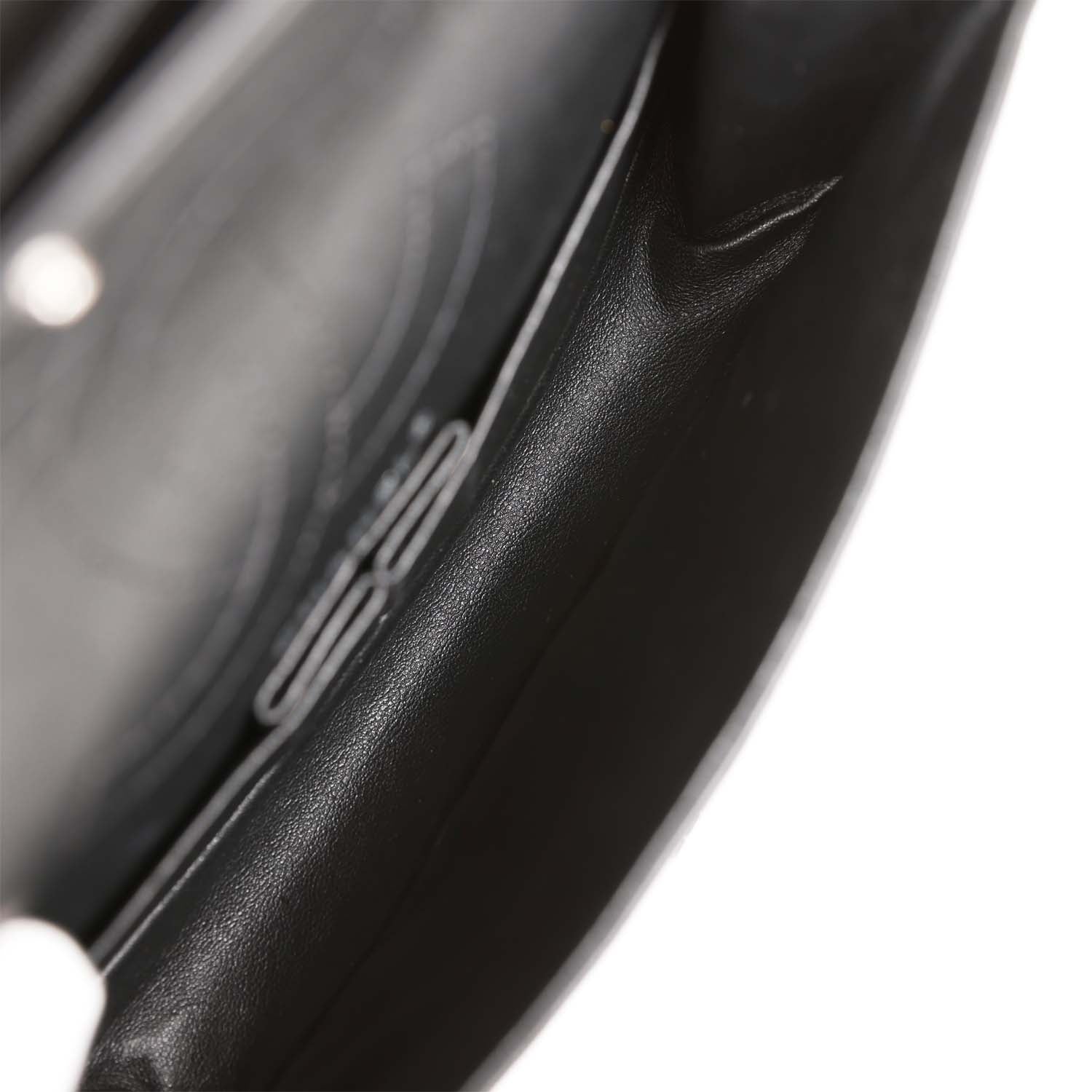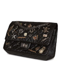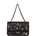 This Lucky Charms 2.55 Reissue bag of black quilted aged calfskin leather with ruthenium hardware features a front flap with a Mademoiselle turn lock closure, halfmoon back pocket and interwoven ruthenium tone chain link shoulder/crossbody strap.