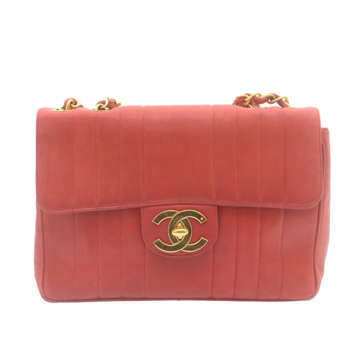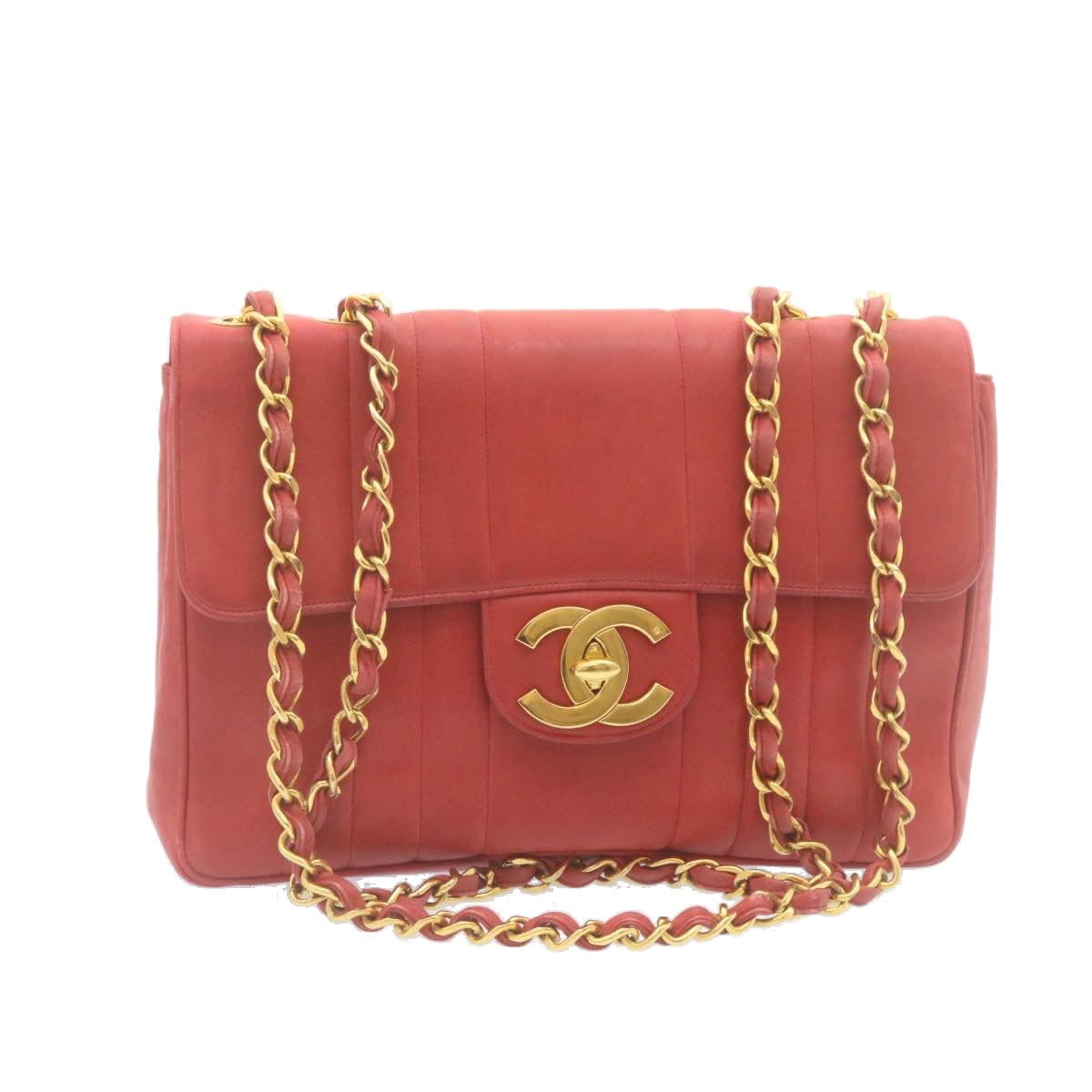 Chanel Mademoiselle Big Coco Double Chain Shoulder Bag Lamb Skin Red Auth 29129A