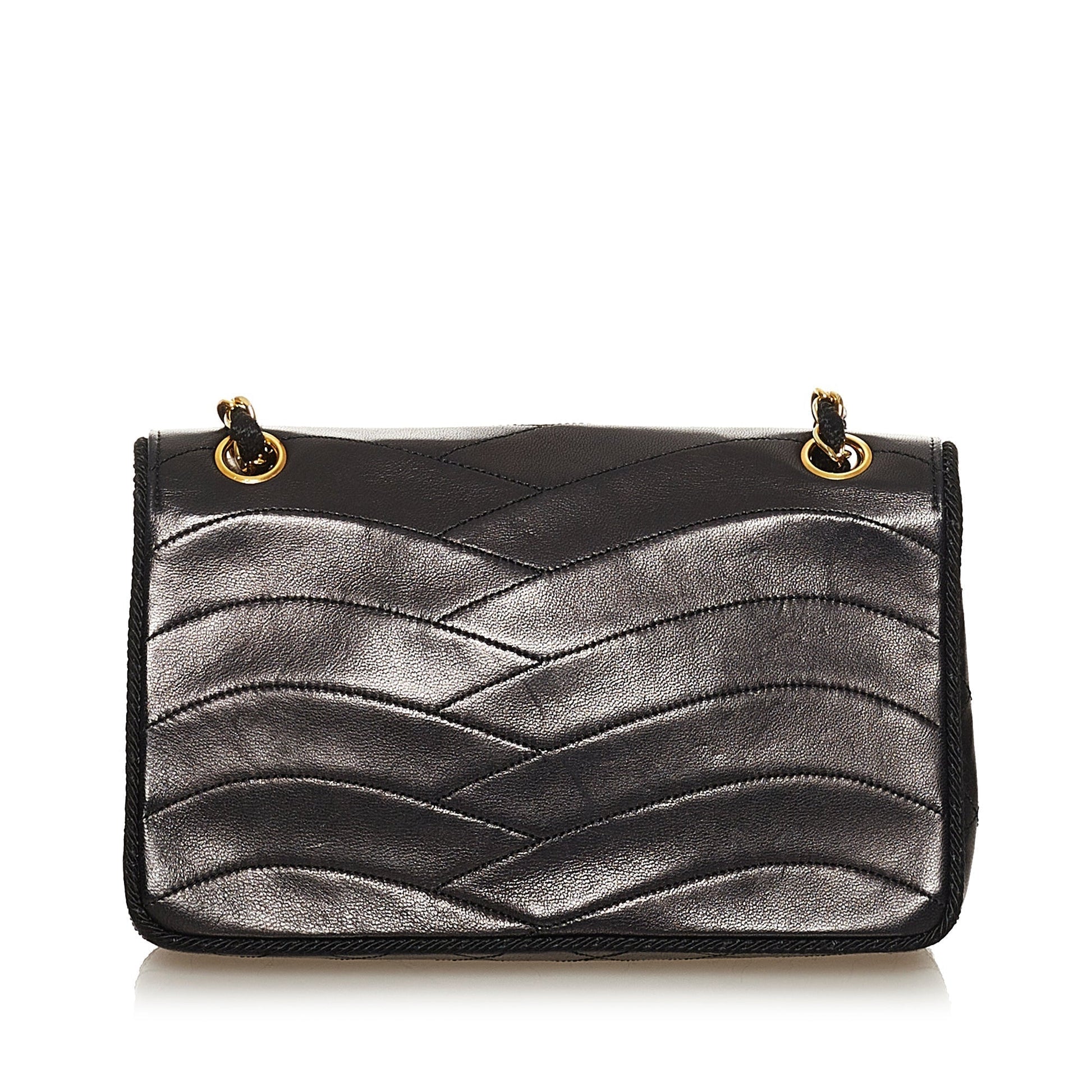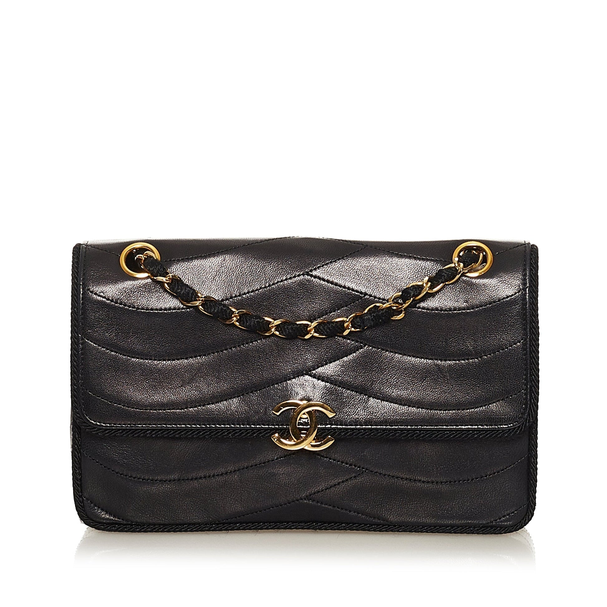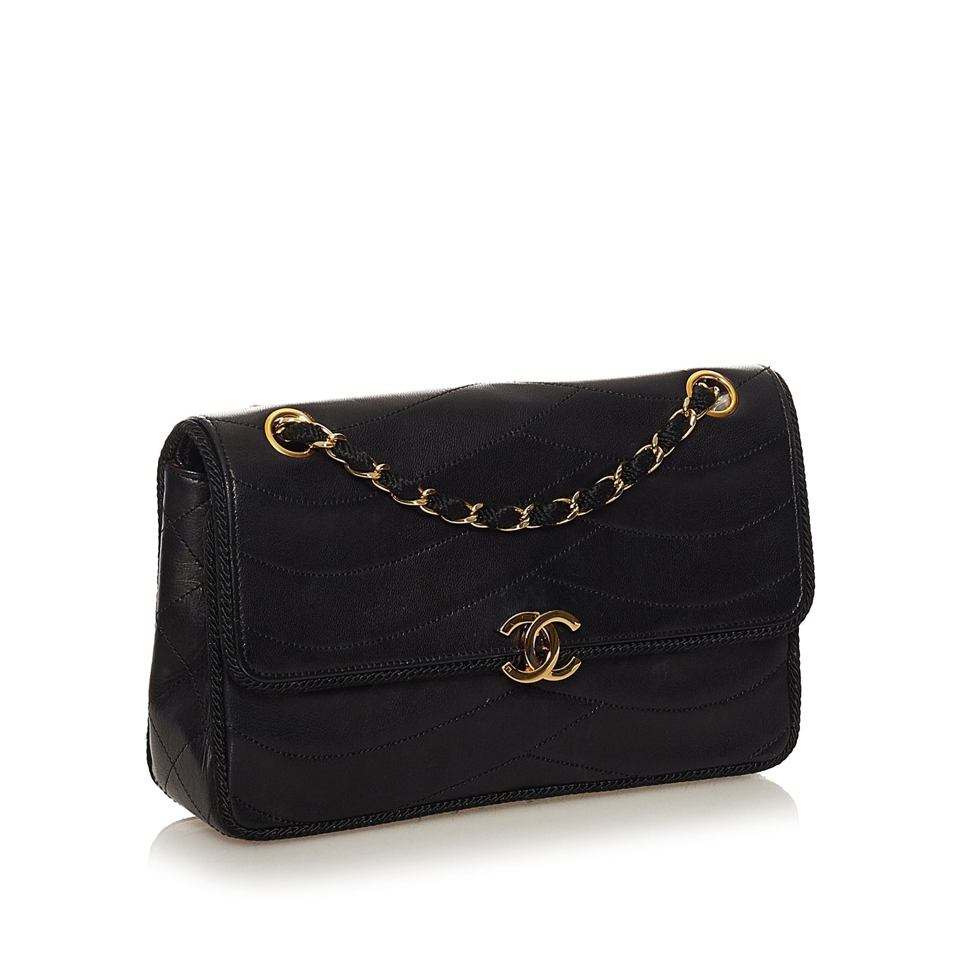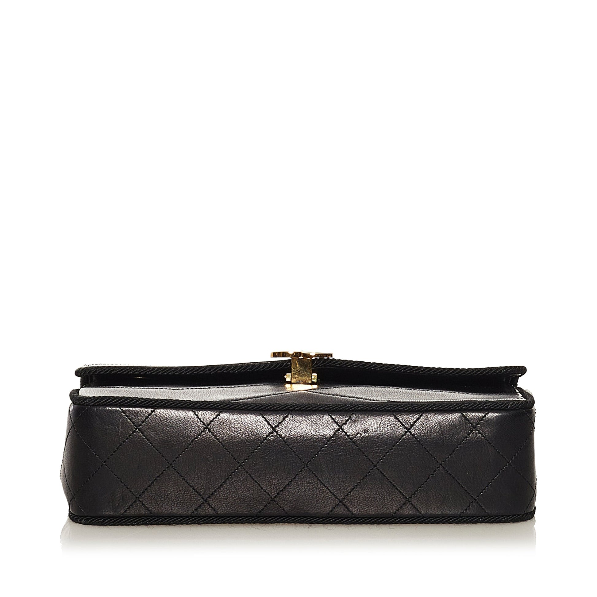 This shoulder Bag features a quilted lambskin body, leather woven chain straps, a front flap with interlocking Cs and a twist lock closure, and interior slip pockets.