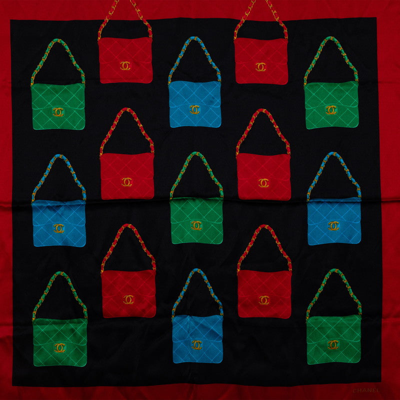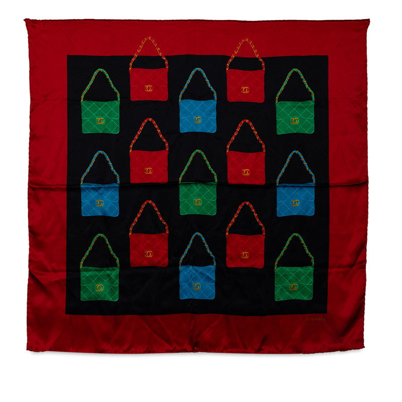 CHANEL Vintage Silk Scarf Red Flap Bag Motifs