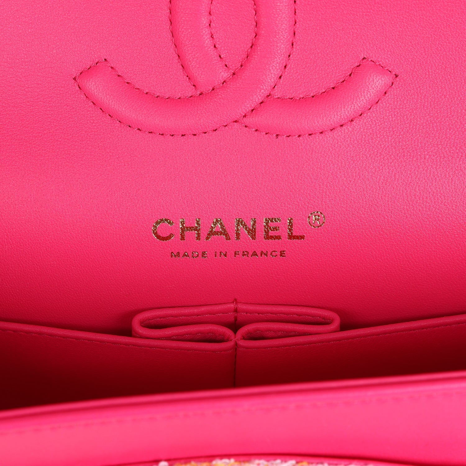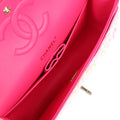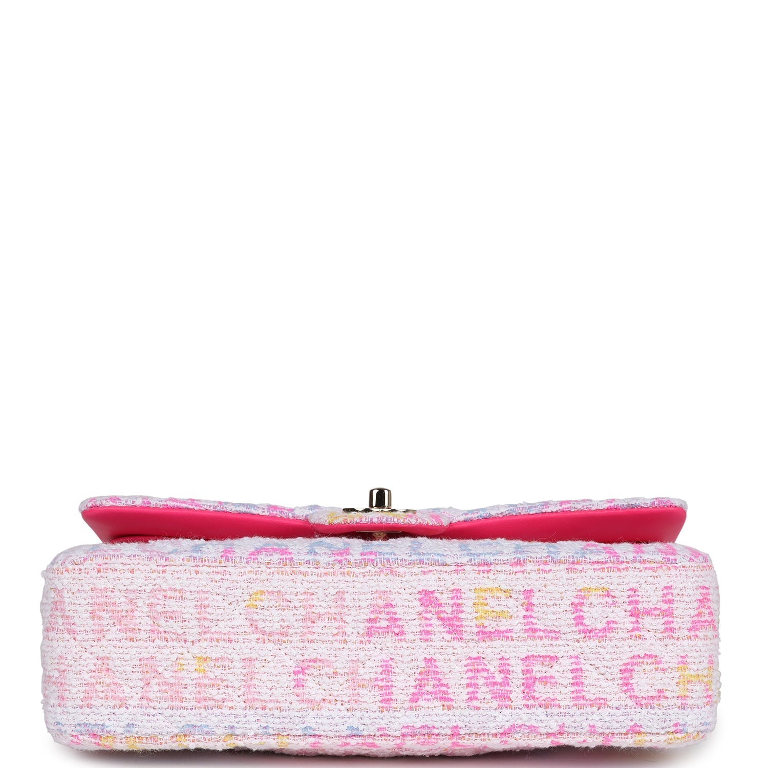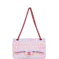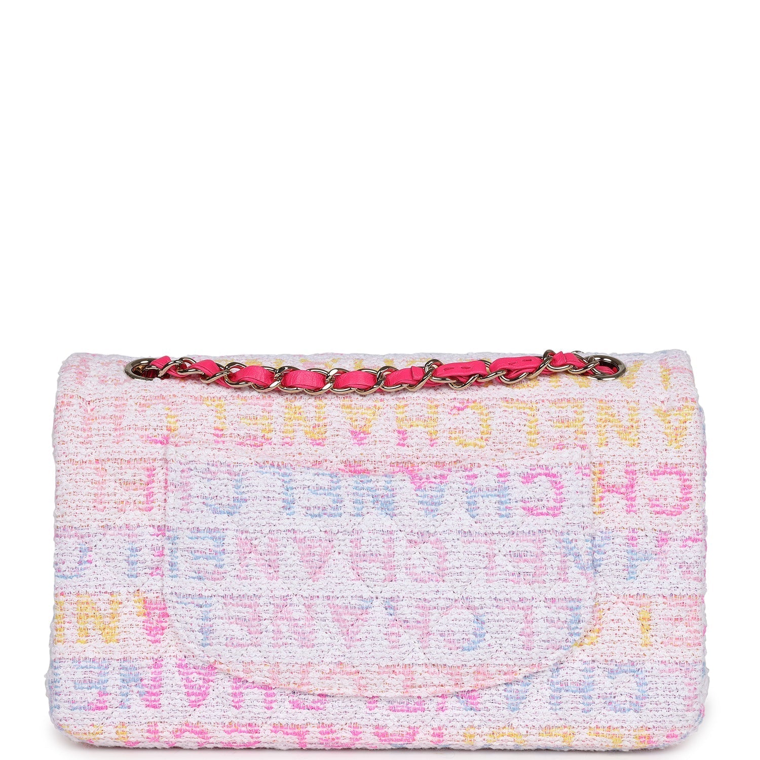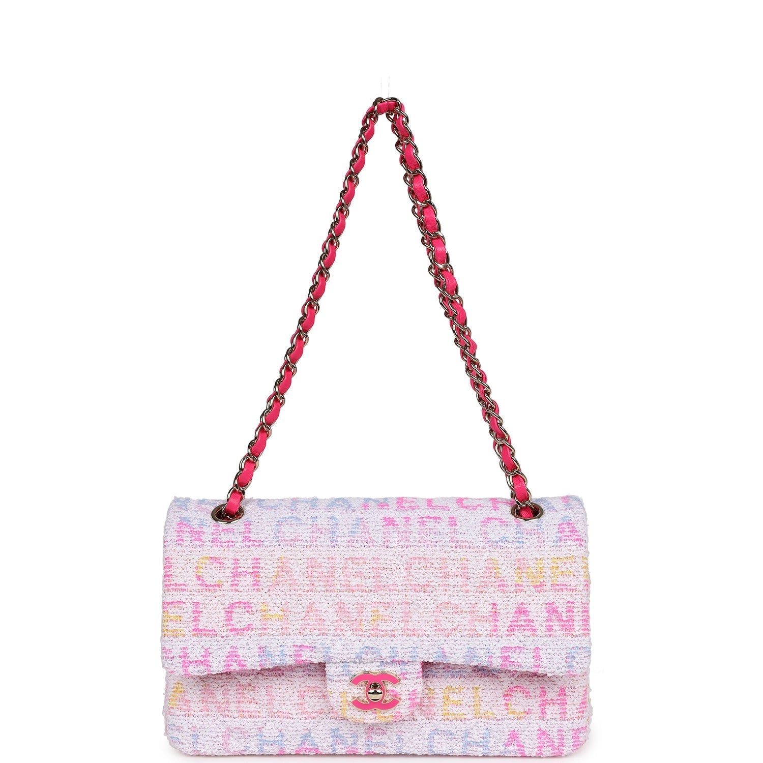 This Chanel medium classic double flap bag is in hot pink, white, yellow and purple tweed boucle fabric with light gold tone hardware and features multicolored "Chanel" lettering stitched throughout the tweed boucle fabric, has a front flap with signature light gold and hot pink lacquered CC turnlock closure, half moon back pocket, and adjustable interwoven light gold tone chain link and hot pink leather shoulder strap