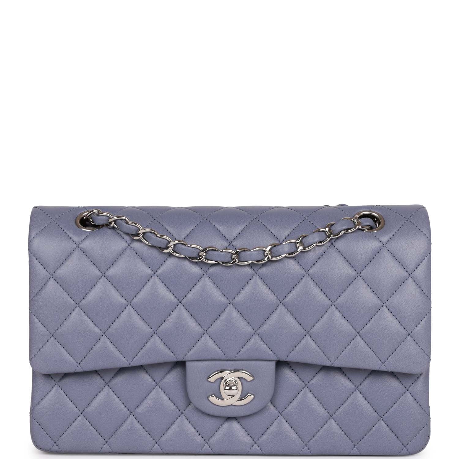 This Medium Classic Double Flap bag is in Purple lambskin leather with silver tone hardware and features a front flap with signature CC turnlock closure, half moon back pocket, and adjustable interwoven silver tone chain link and purple leather shoulder strap