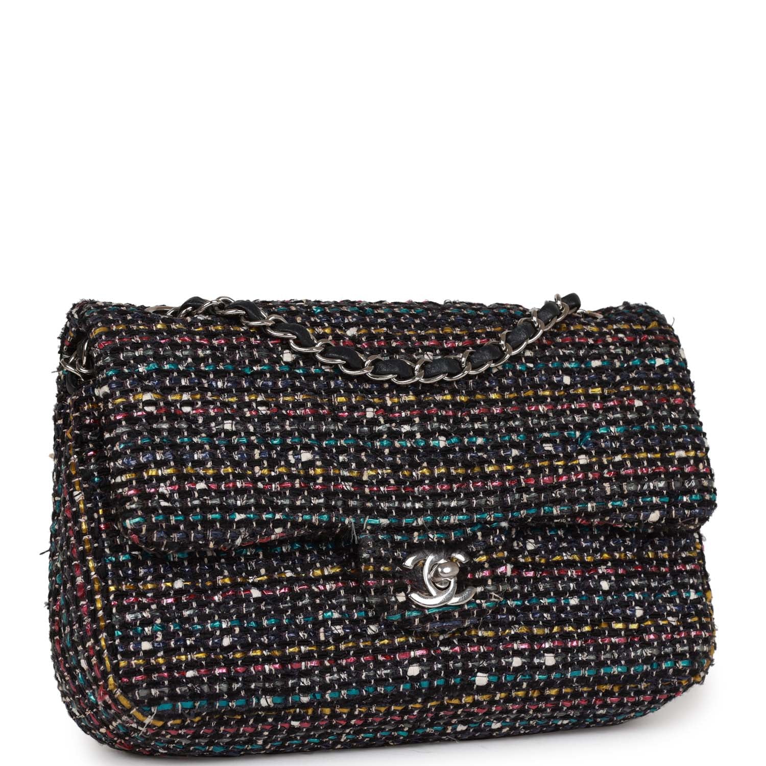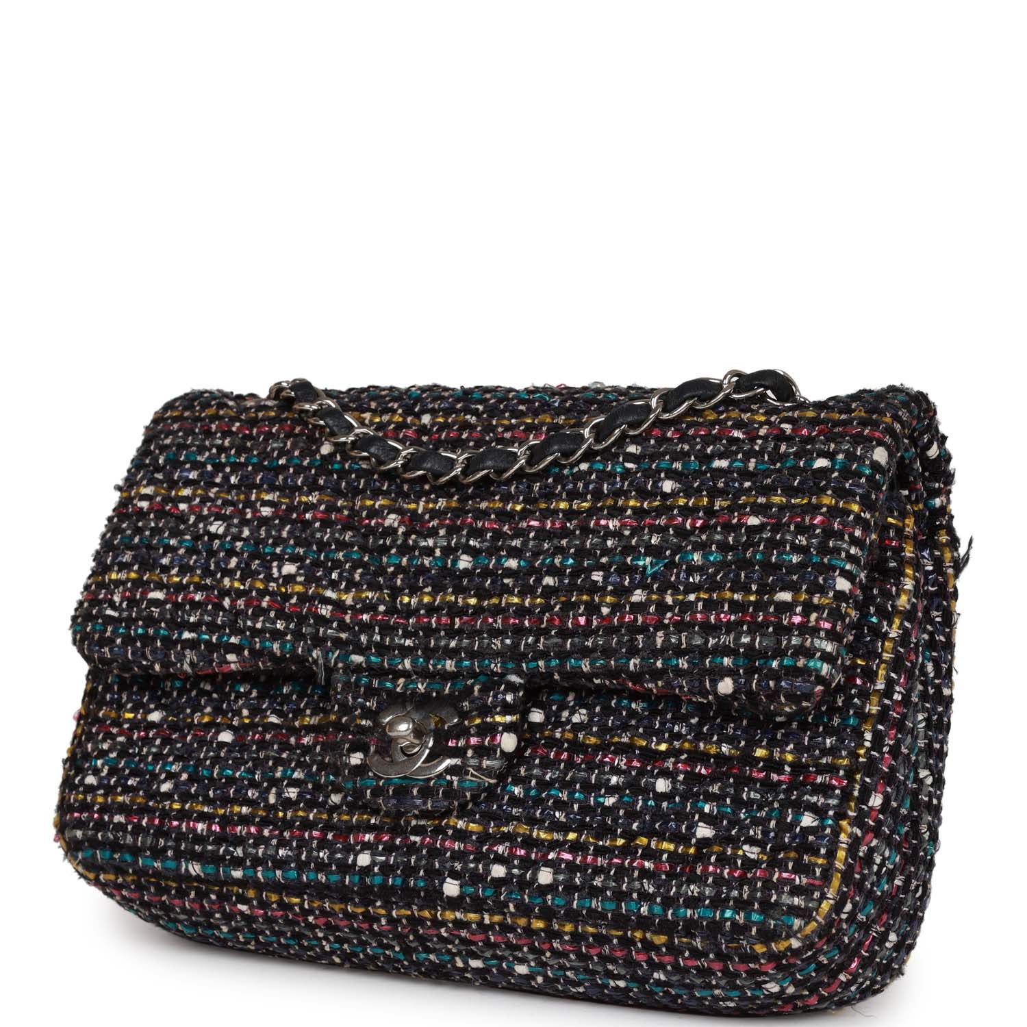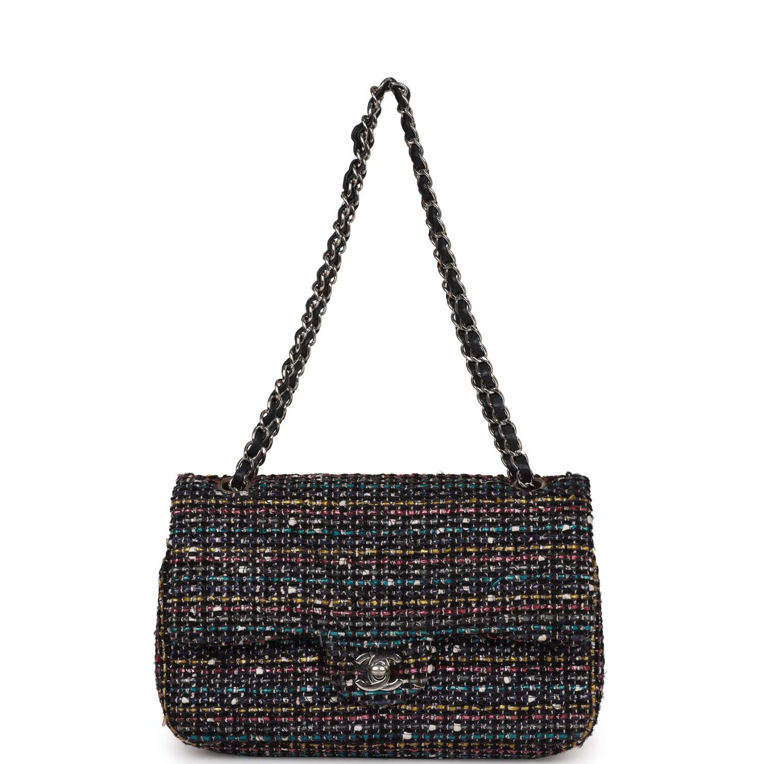 This Medium Classic Double Flap bag is in White and Black tweed boucle fabric with silver hardware and features a front flap with signature CC turnlock closure, half moon back pocket, and adjustable interwoven silver tone chain link and white leather shoulder strap