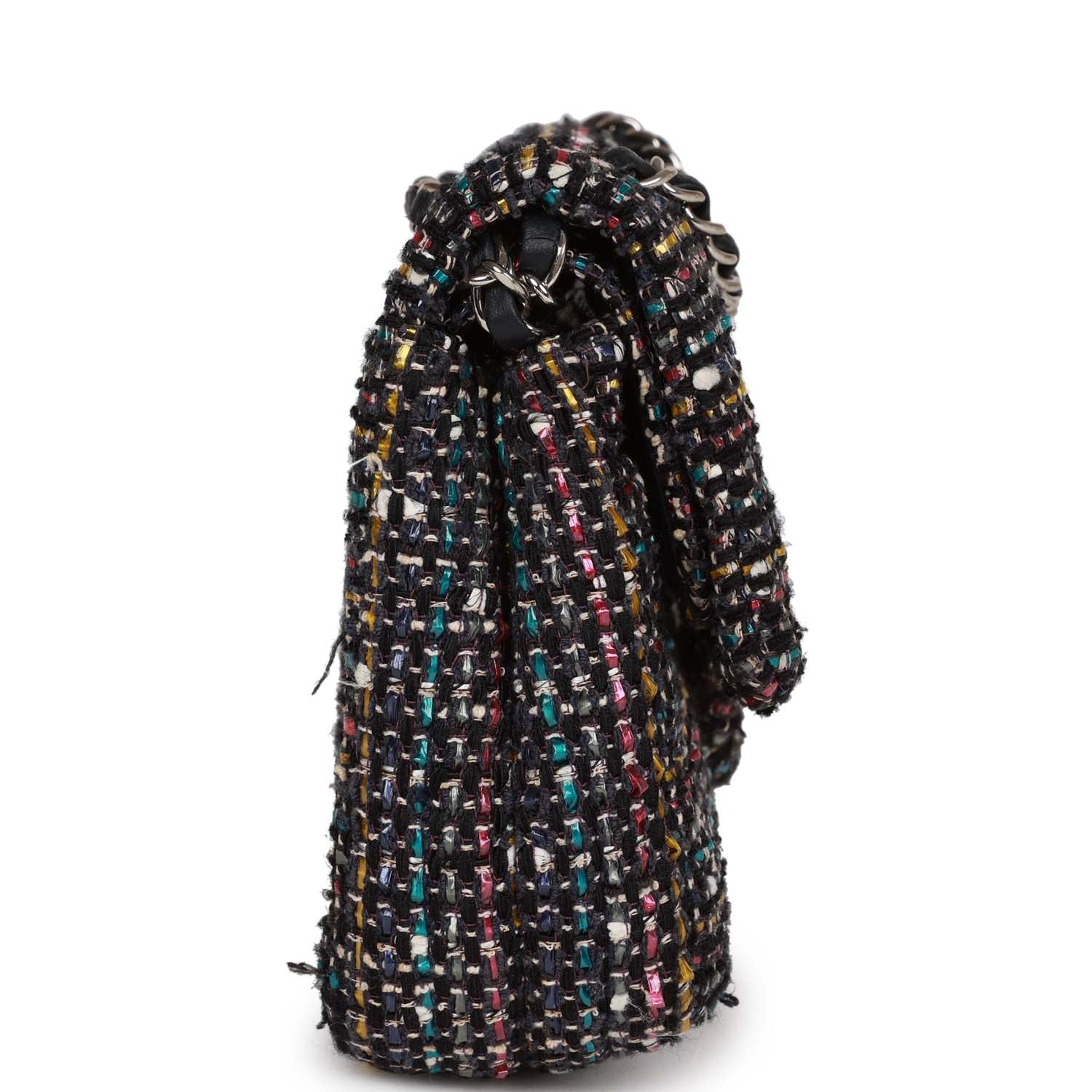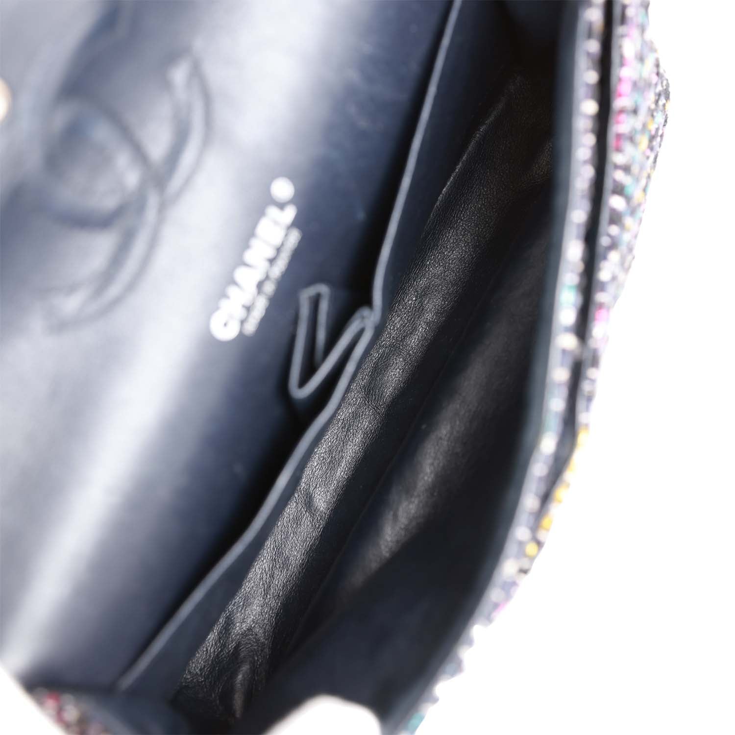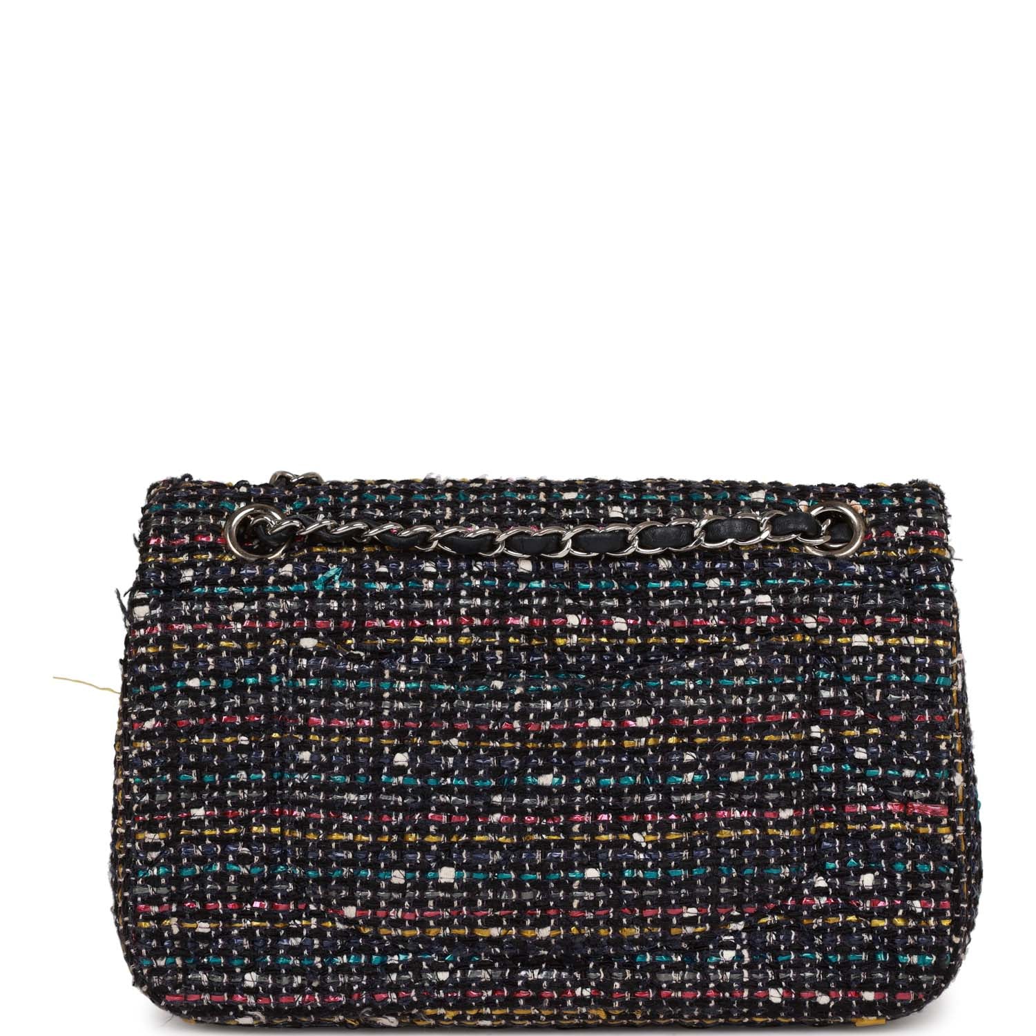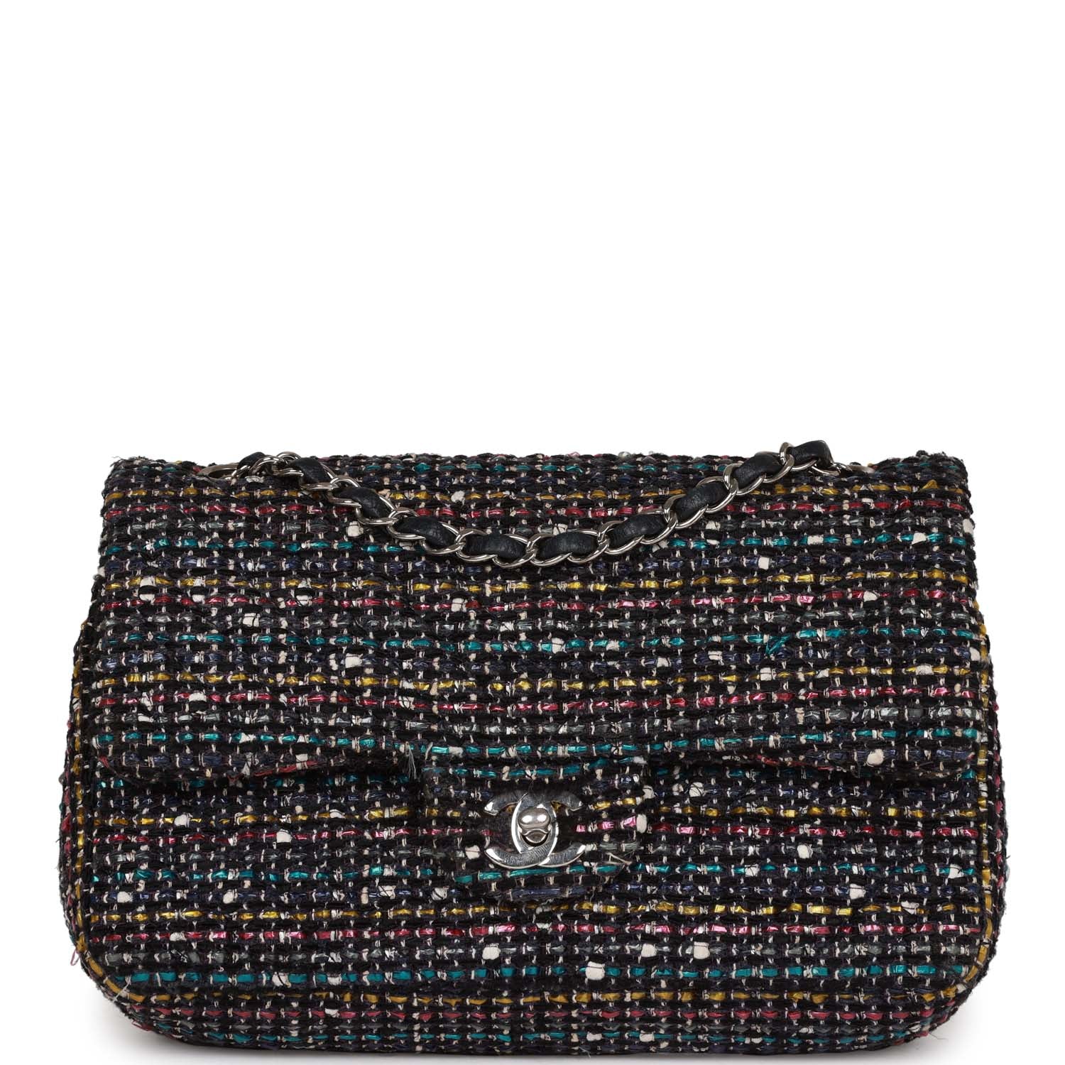 This Medium Classic Double Flap bag is in White and Black tweed boucle fabric with silver hardware and features a front flap with signature CC turnlock closure, half moon back pocket, and adjustable interwoven silver tone chain link and white leather shoulder strap