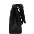 This medium classic double flap bag is in black lambskin leather with silver hardware and features a front flap with signature CC turnlock closure, half moon back pocket, and adjustable interwoven silver tone chain link and black leather shoulder strap