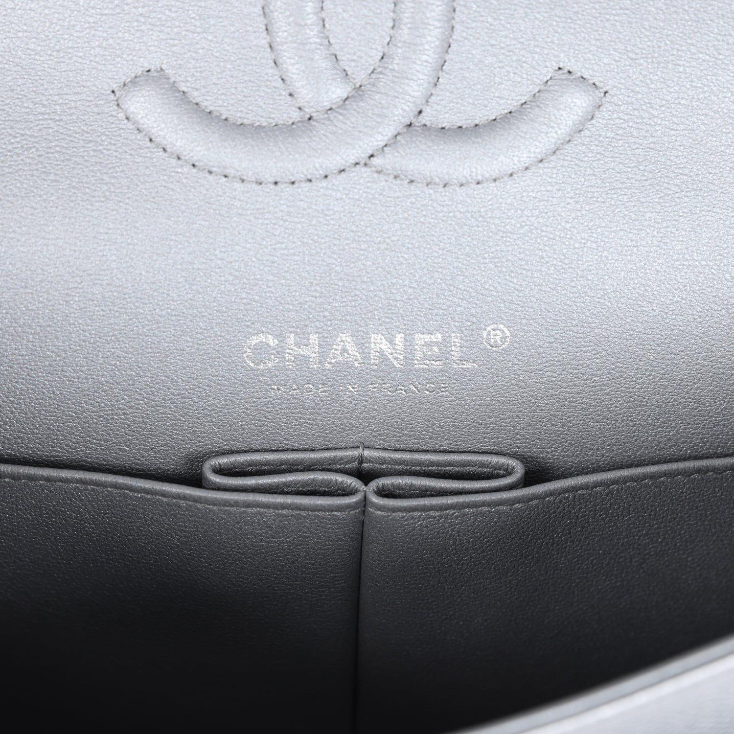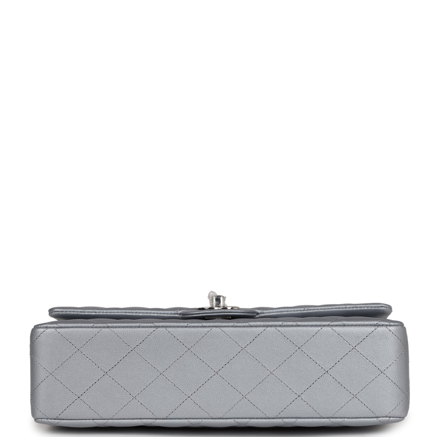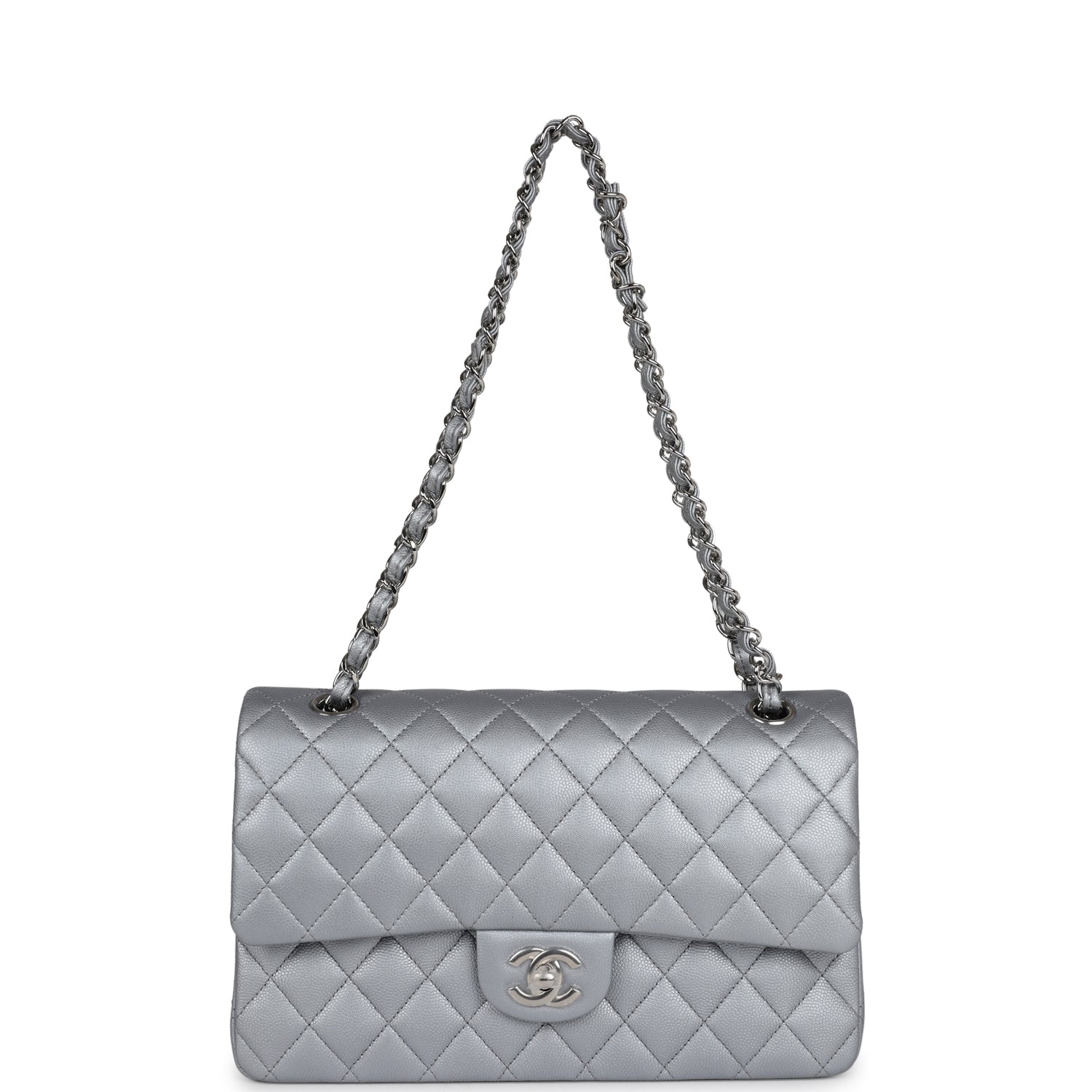 This Medium Classic Double Flap Bag is in Silver Caviar leather with Silver Hardware, front flap with CC turnlock closure, tonal stitching, half moon back pocket and adjustable interwoven silver chain link and silver leather shoulder/crossbody strap.