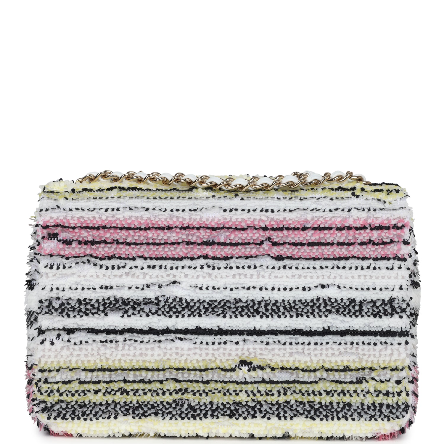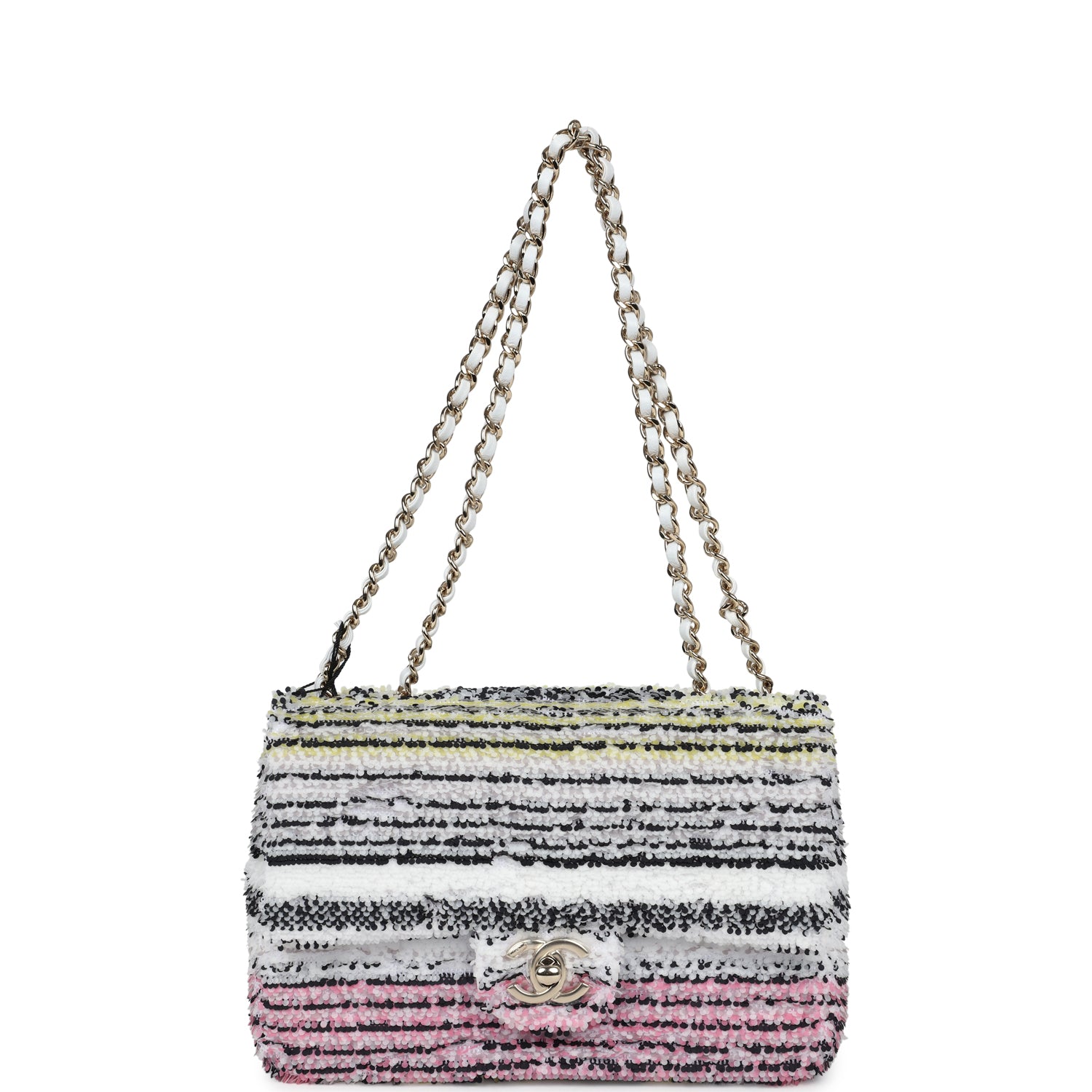 This Chanel mini striped flap bag is of black, white, pink and yellow sequins with light gold hardware and features a front CC turnlock closure, tonal stitching, and one interwoven white leather and light gold chain shoulder/crossbody strap.