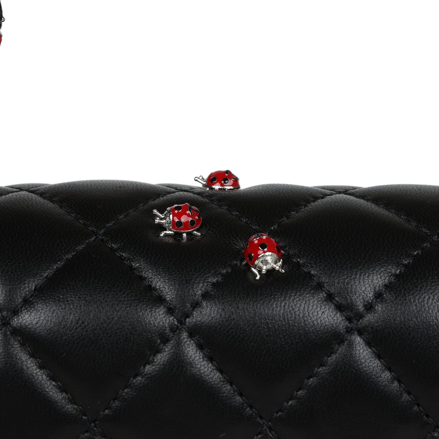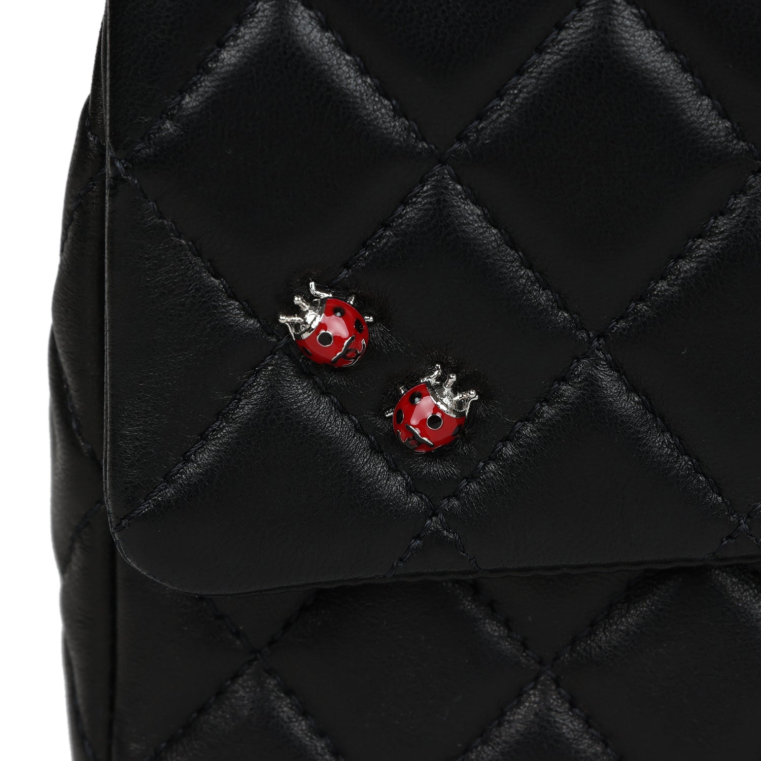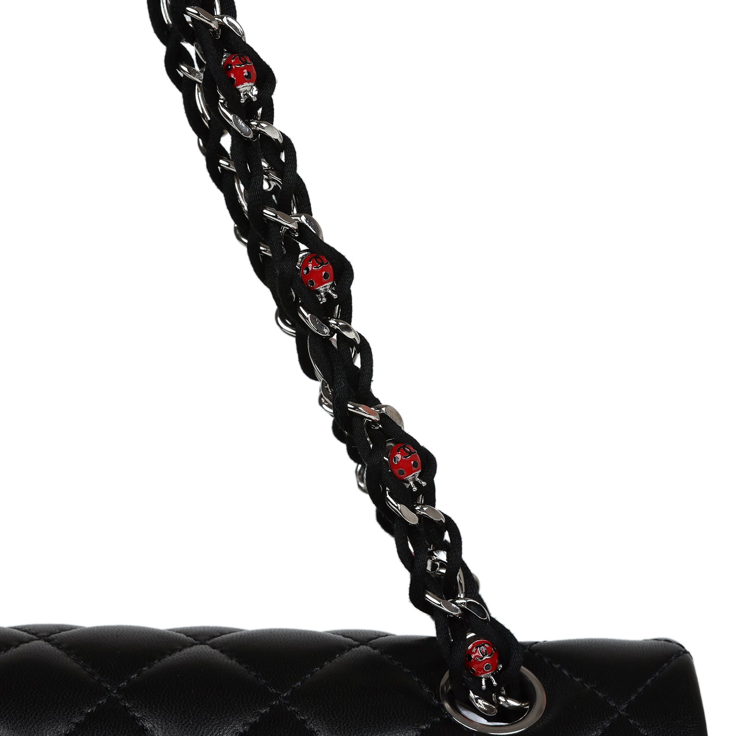 This medium classic single flap bag is in Black quilted lambskin leather with silvertone hardware and features Red and Silver lady bugs on the body of the bag, a front flap with signature CC turnlock closure, and a half moon back pocket.