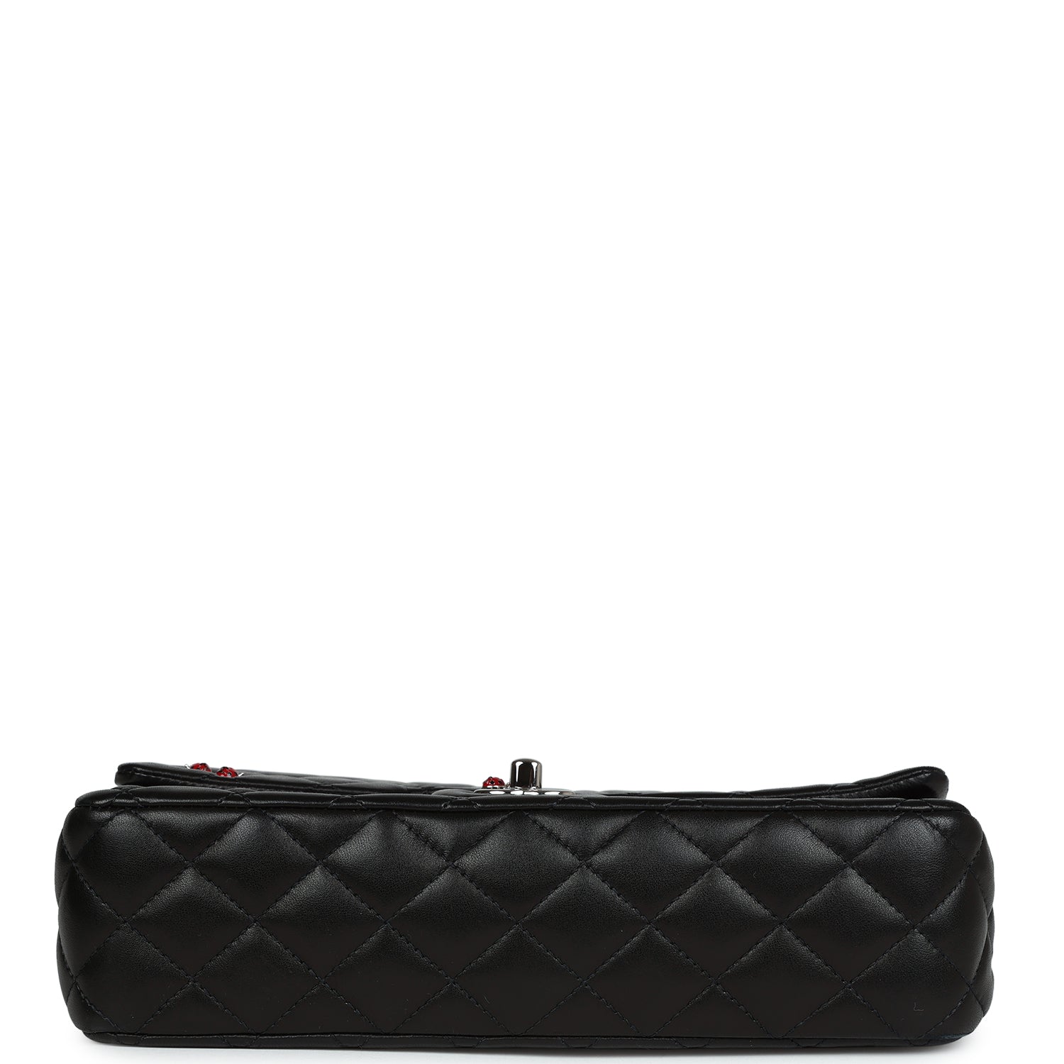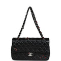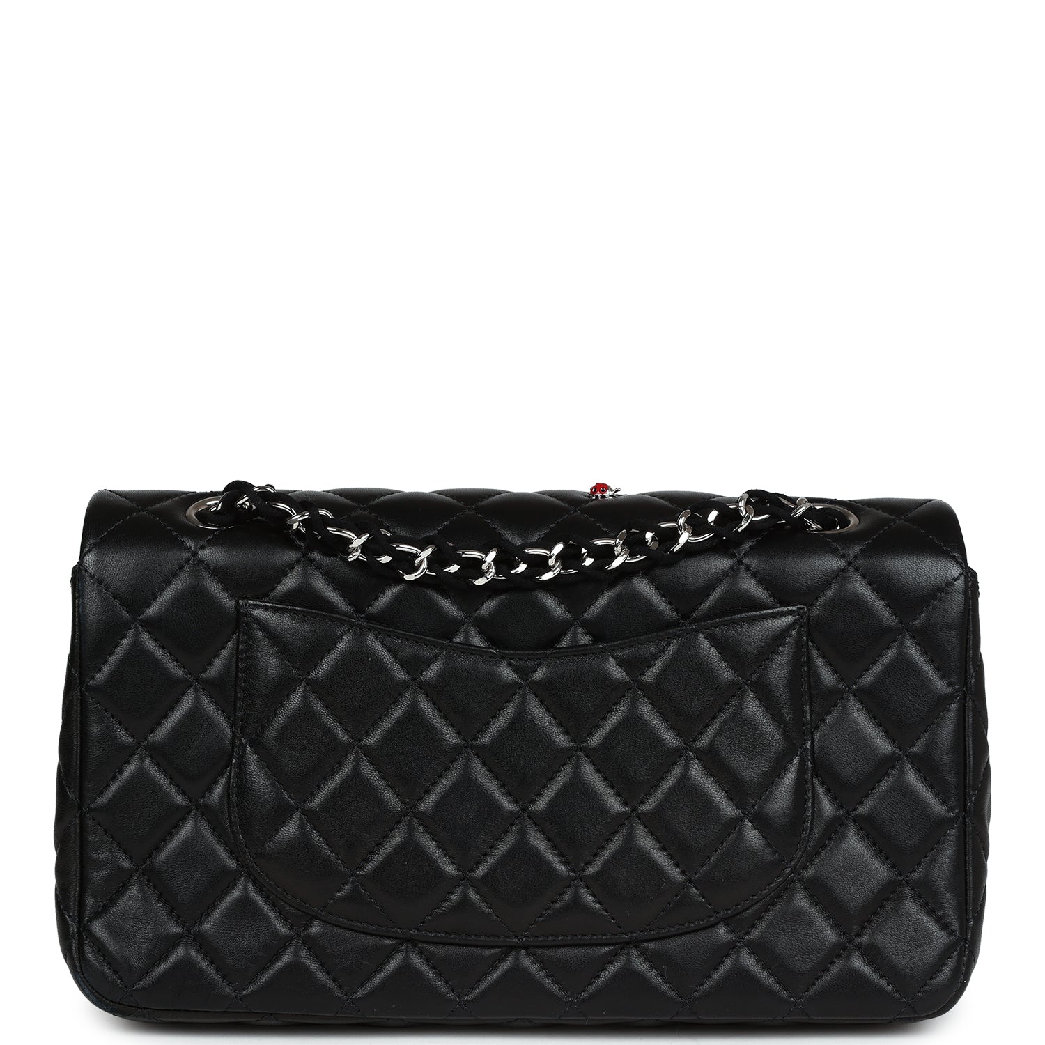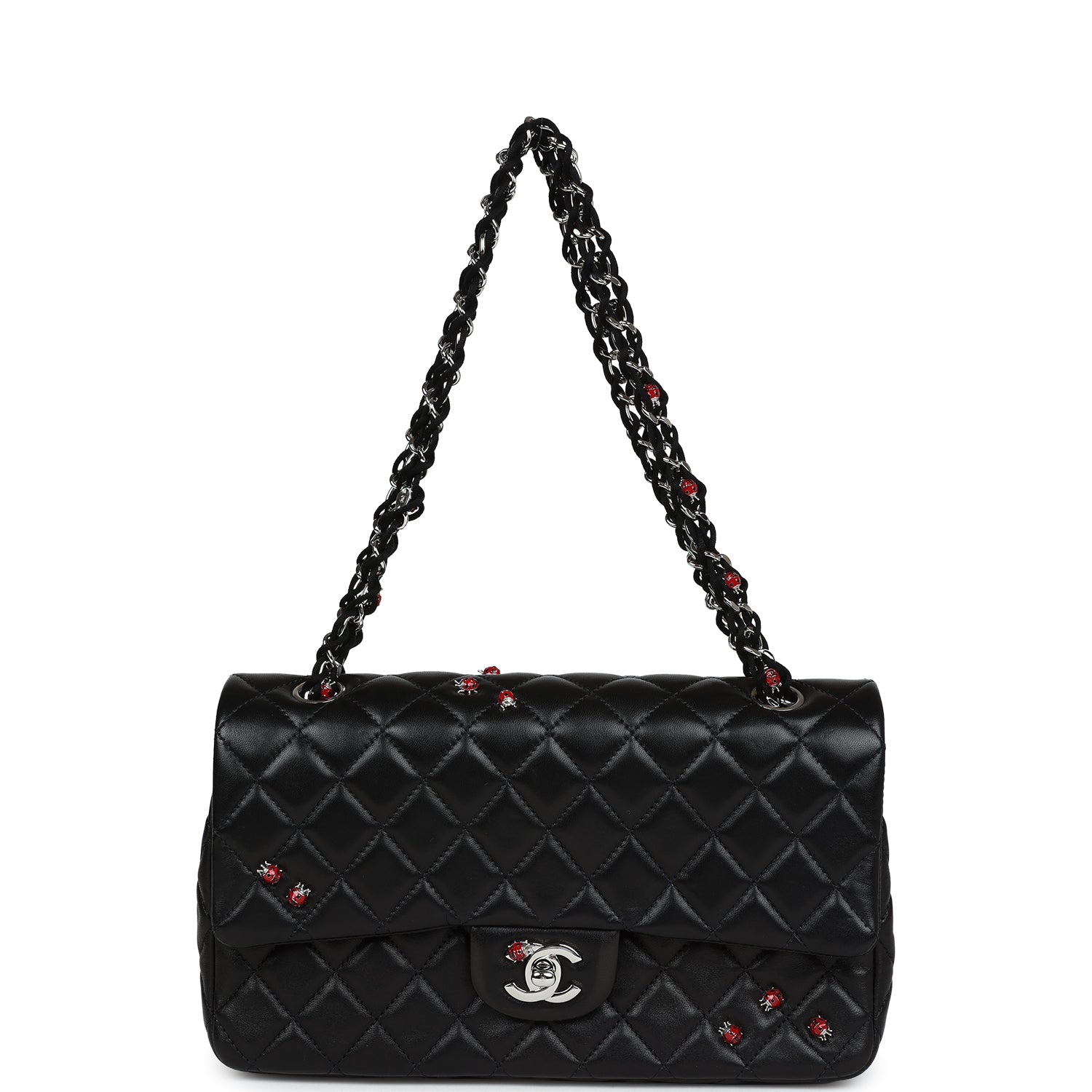 This medium classic single flap bag is in Black quilted lambskin leather with silvertone hardware and features Red and Silver lady bugs on the body of the bag, a front flap with signature CC turnlock closure, and a half moon back pocket.
