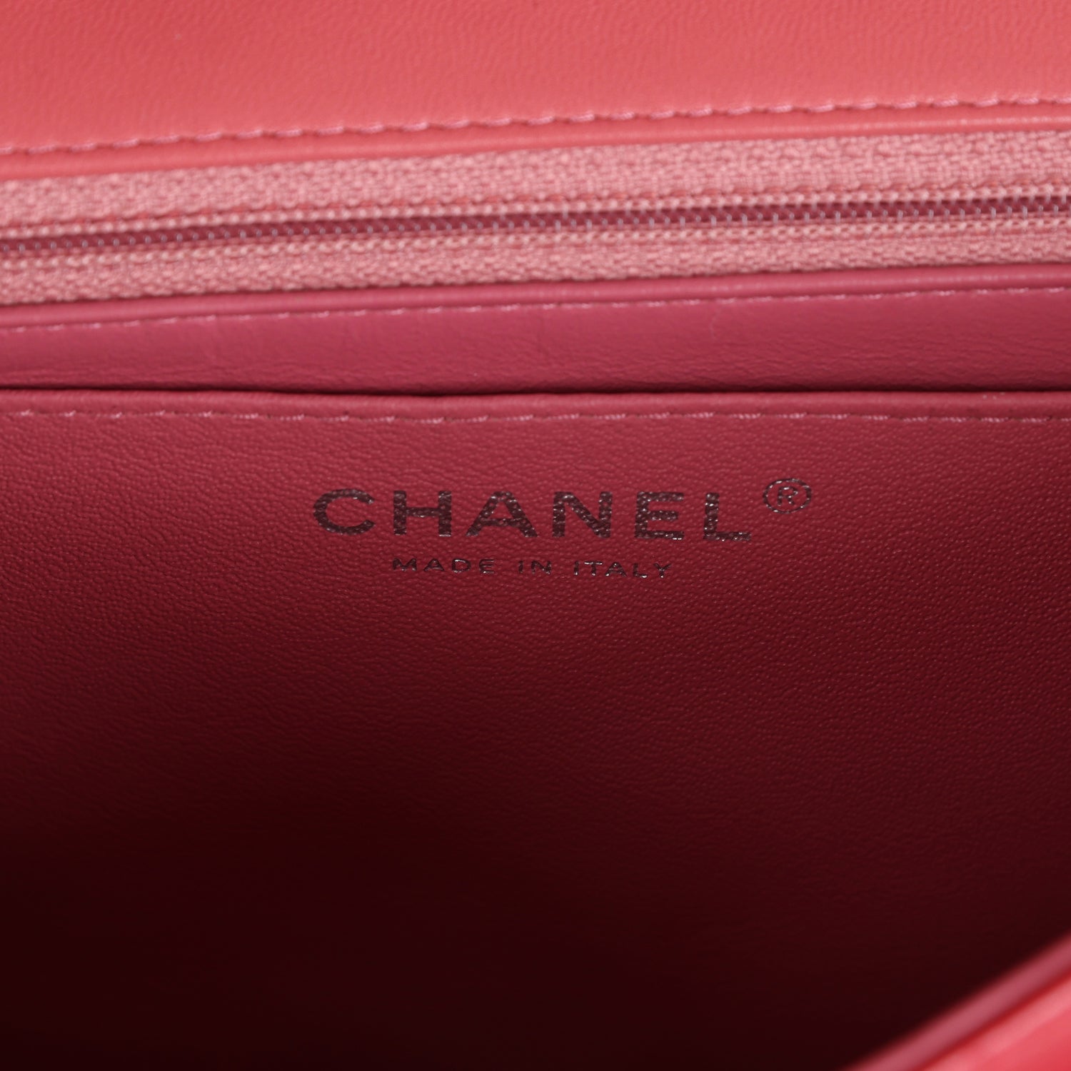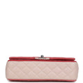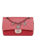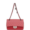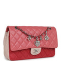 This medium classic single flap bag is in Pale Pink, Hot Pink and Red quilted lambskin leather with silvertone hardware and features, a front flap with signature CC turnlock closure, and a half moon back pocket and an adjustable Silver tone interwoven strap of Pink leather chainlink shoulder/crossbody strap with silver crystal and faux pearl charms.