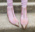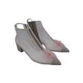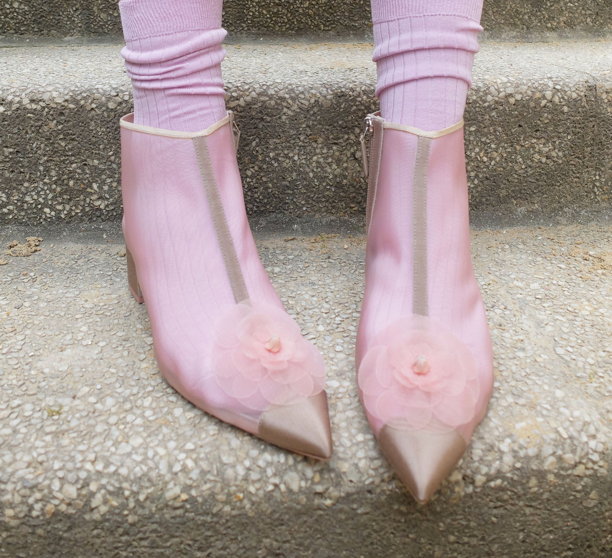 � DESCRIPTION: Chanel 2019 Camelia ankle-boots in light pink and mesh and a pink grosgrain heel and tip. Open with a zipper on the inside.