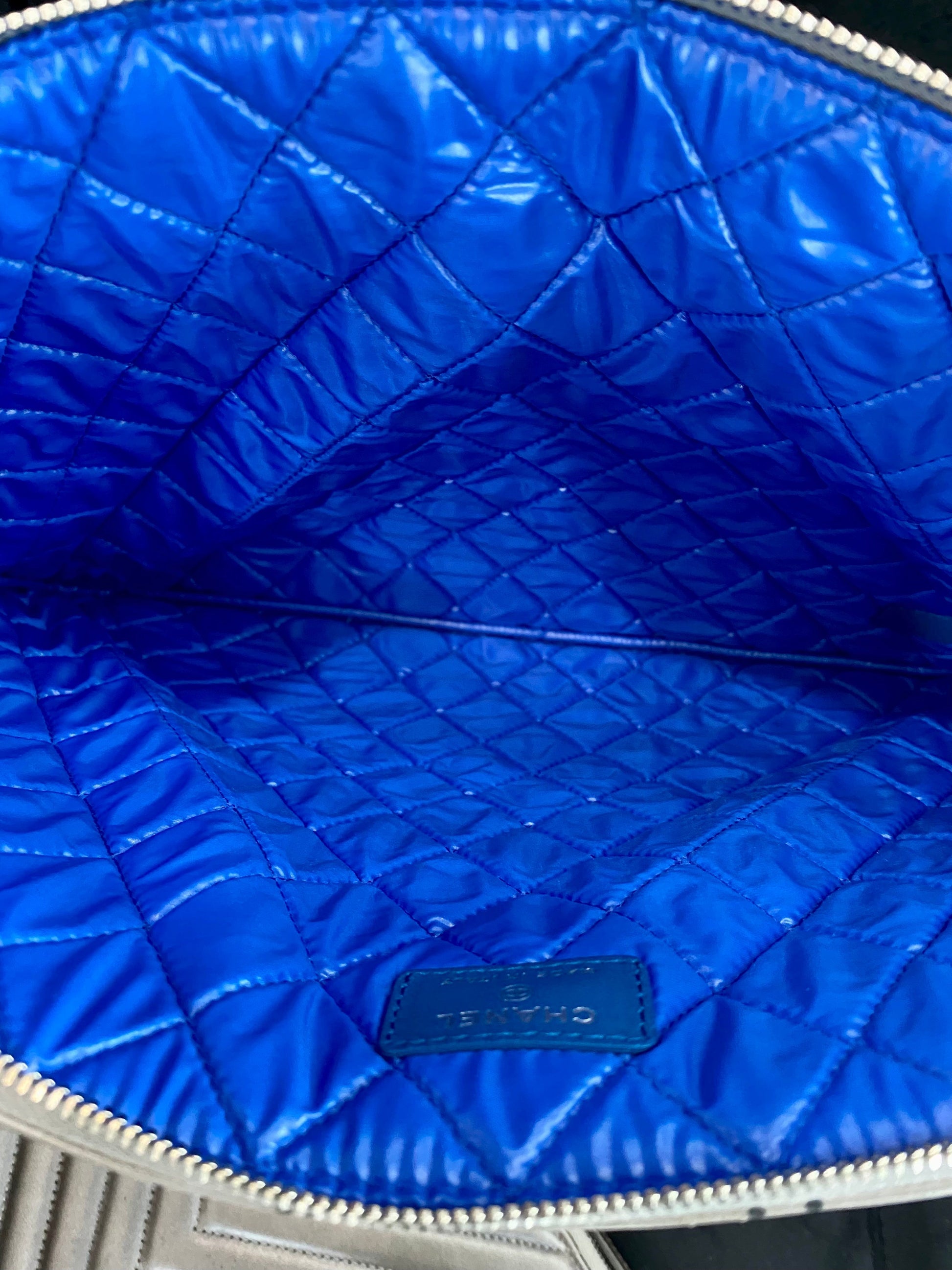 The bag features a polished dark silver top zipper that opens to a protective quilted vibrant blue nylon interior.