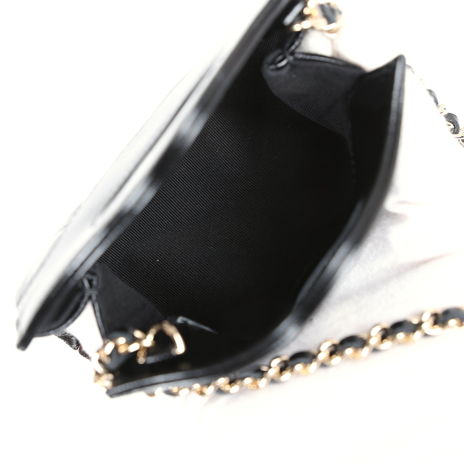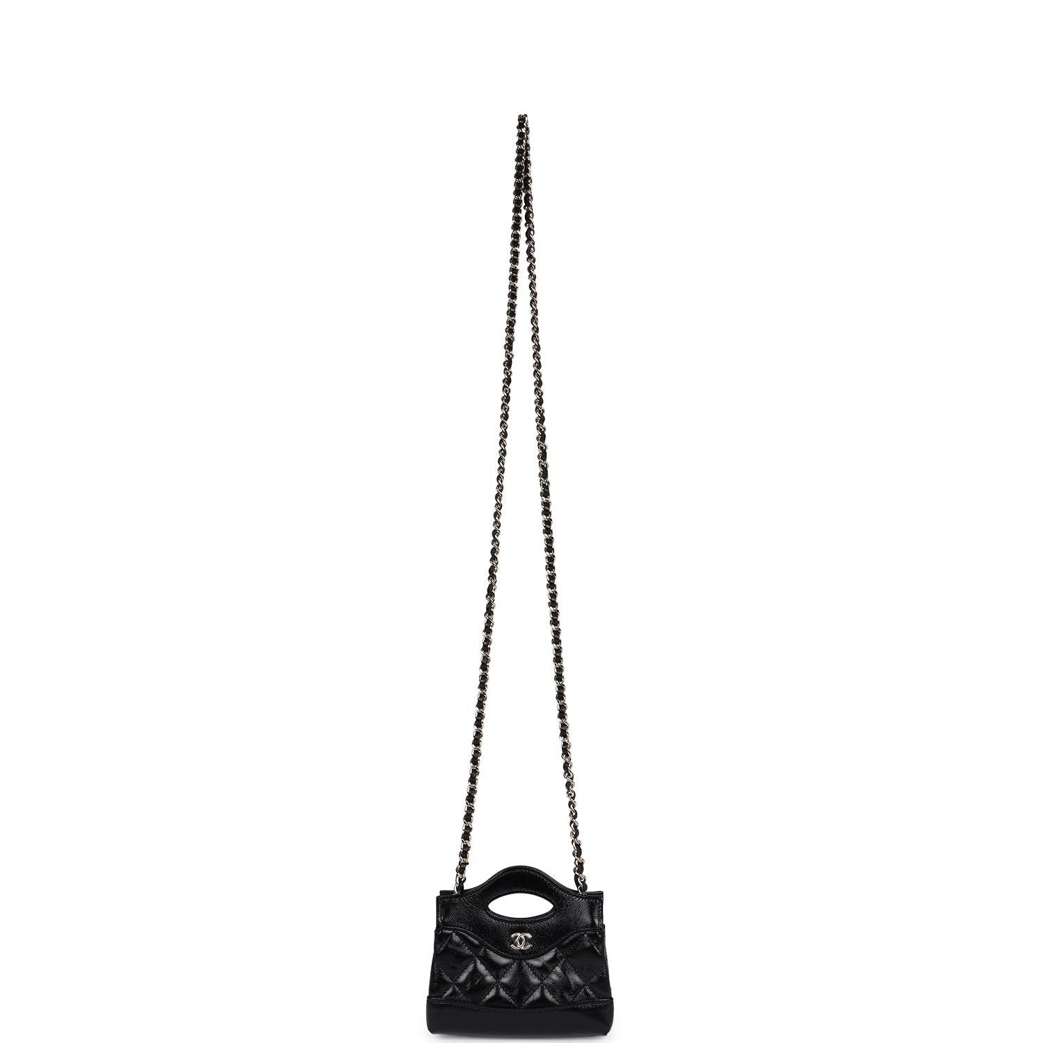 This Chanel 31 micro shopper bag in black shiny lambskin leather with light gold tone hardware, featuring cutout top handles, cc turnlock closure, one interwoven black leather and light gold chainlink shoulder strap