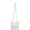 This Chanel mini 22 Hobo Bag is in white and silver ombre metallic calfskin with silver tone metal hardware and signature diamond quilting, a white lacquered metal "Chanel" logo on front of bag, Chanel Paris metal hang tag, interwoven chain link with silver tone metal and white leather, one long leather cord, one long chain link shoulder strap