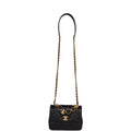 This Mini Charms Flap Bag in Black Quilted Lambskin with Brushed Gold Hardware, features a single flap, CC turnlock closure, tonal stitching, interwoven black leather and brushed gold chainlink shoulder/crossbody strap with Chanel iconic coin charms, and one halfmoon pocket on back of bag.