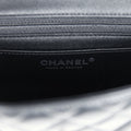 This mini rectangular flap bag is in black lambskin with silver hardware and has a front flap with signature CC turnlock closure, rear half moon pocket and single interwoven black leather and silver tone chain link shoulder/crossbody strap.