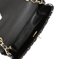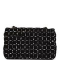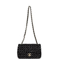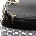This Mini Classic Rectangular Flap Bag is in a Black and White tweed with gold hardware and features a front flap with CC turnlock closure, half moon back pocket and interwoven gold chain link and black leather shoulder/crossbody strap.