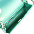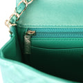 This Mini Classic Rectangular Flap Bag is in green iridescent lambskin with light gold hardware and features a front flap with CC turnlock closure, half moon back pocket and interwoven gold chain link and green leather shoulder/crossbody strap.