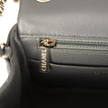 The interior is lined in dark grey leather and features a zipper pocket with a Chanel pull and an open pocket below.