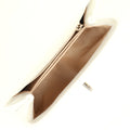 The interior is lined in beige grossgrain fabric with two mains compartments, one center divide slip pocket, and one zip pocket on the rear wall.