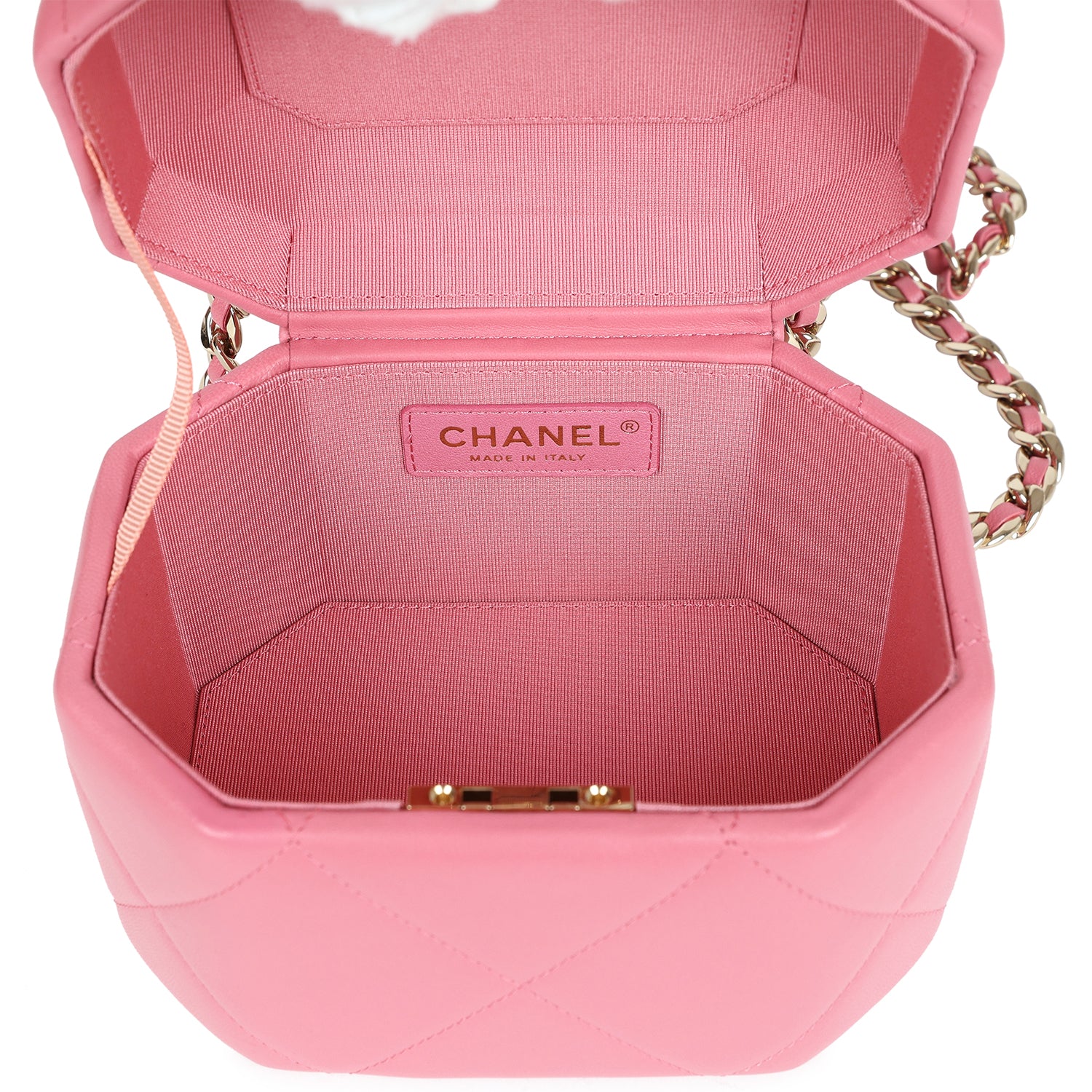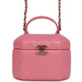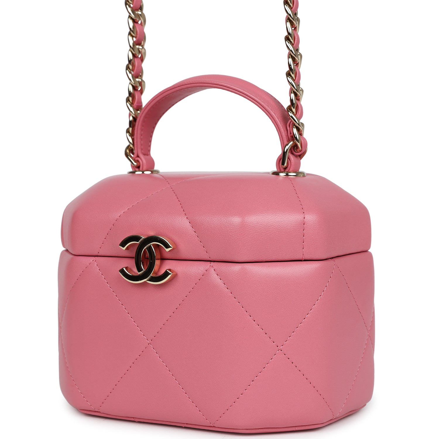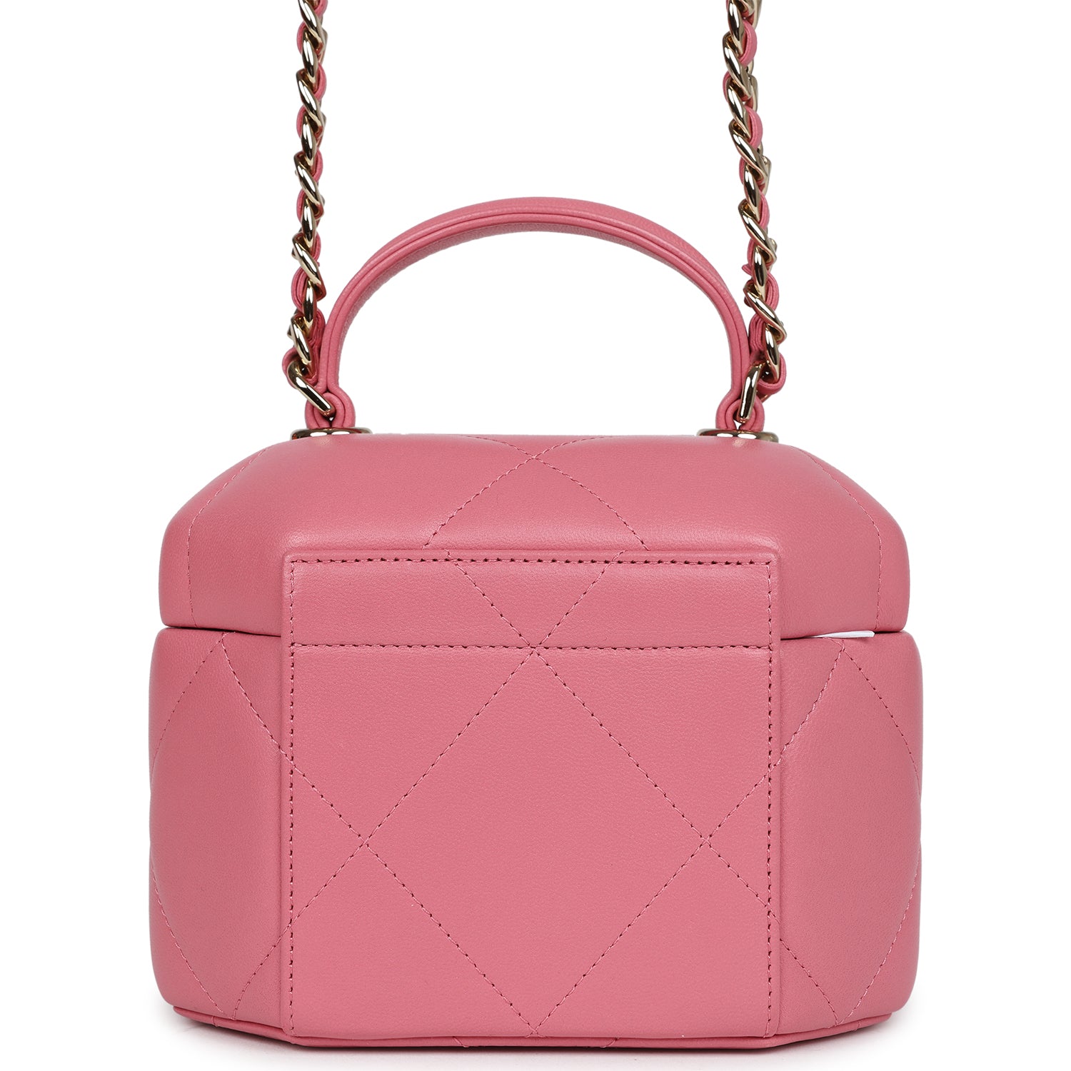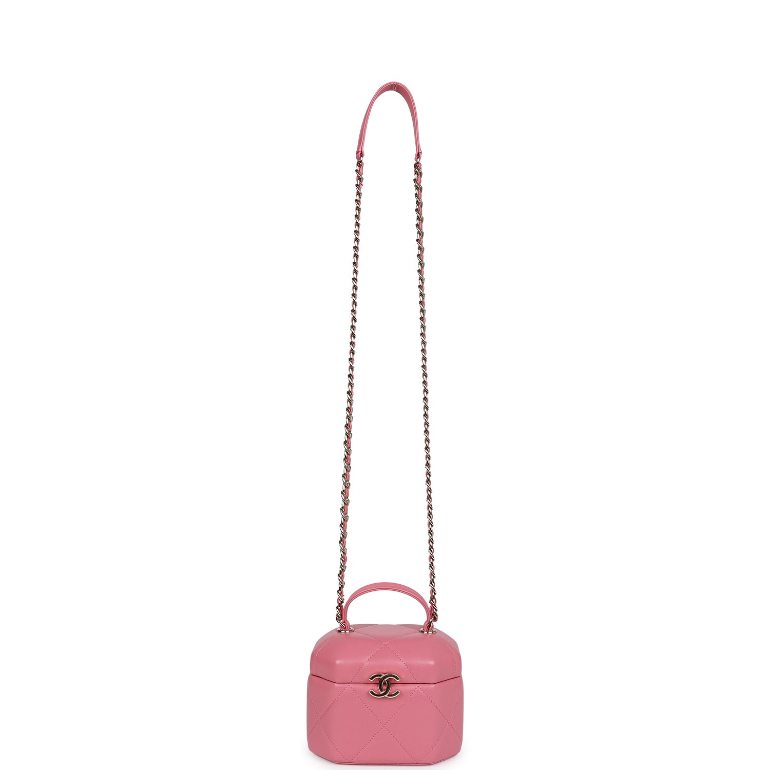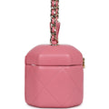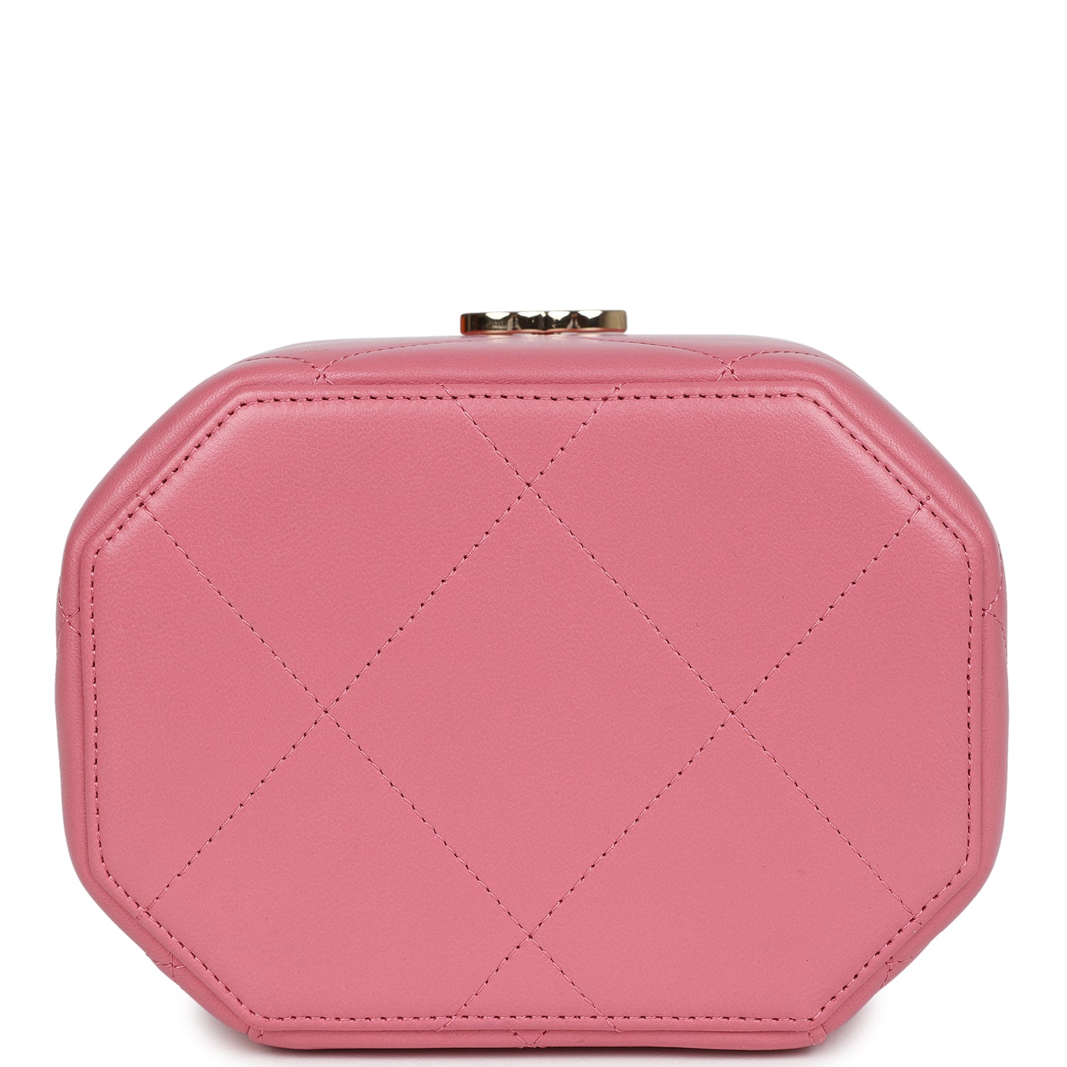 This Mini Vanity Case is in Dark Pink Quilted Lambskin leather with Gold Hardware, features a hexagon case design, a top handle, a gold CC flip lock closure, and a gold interwoven with pink leather shoulder/crossbody strap.