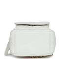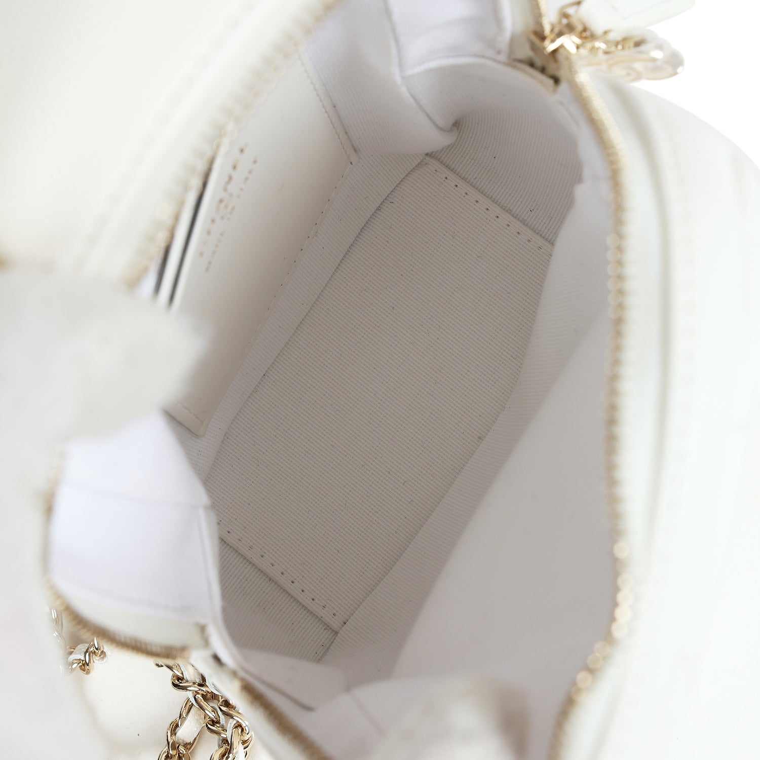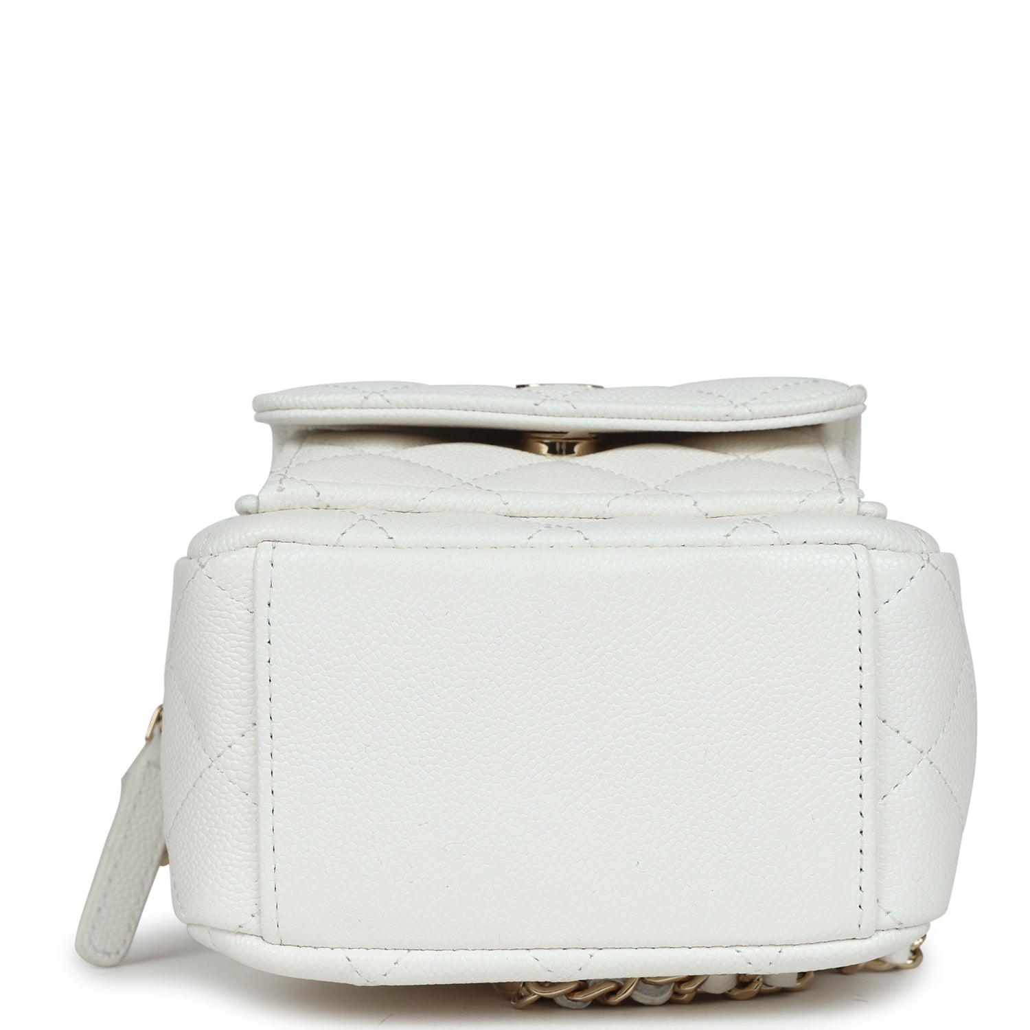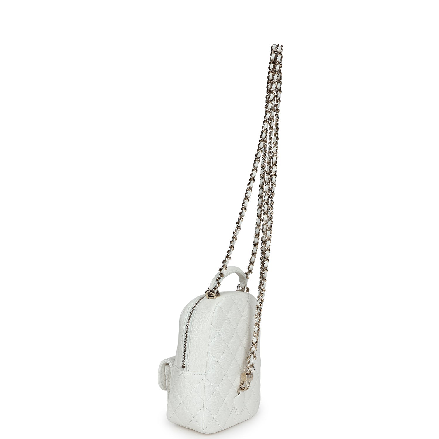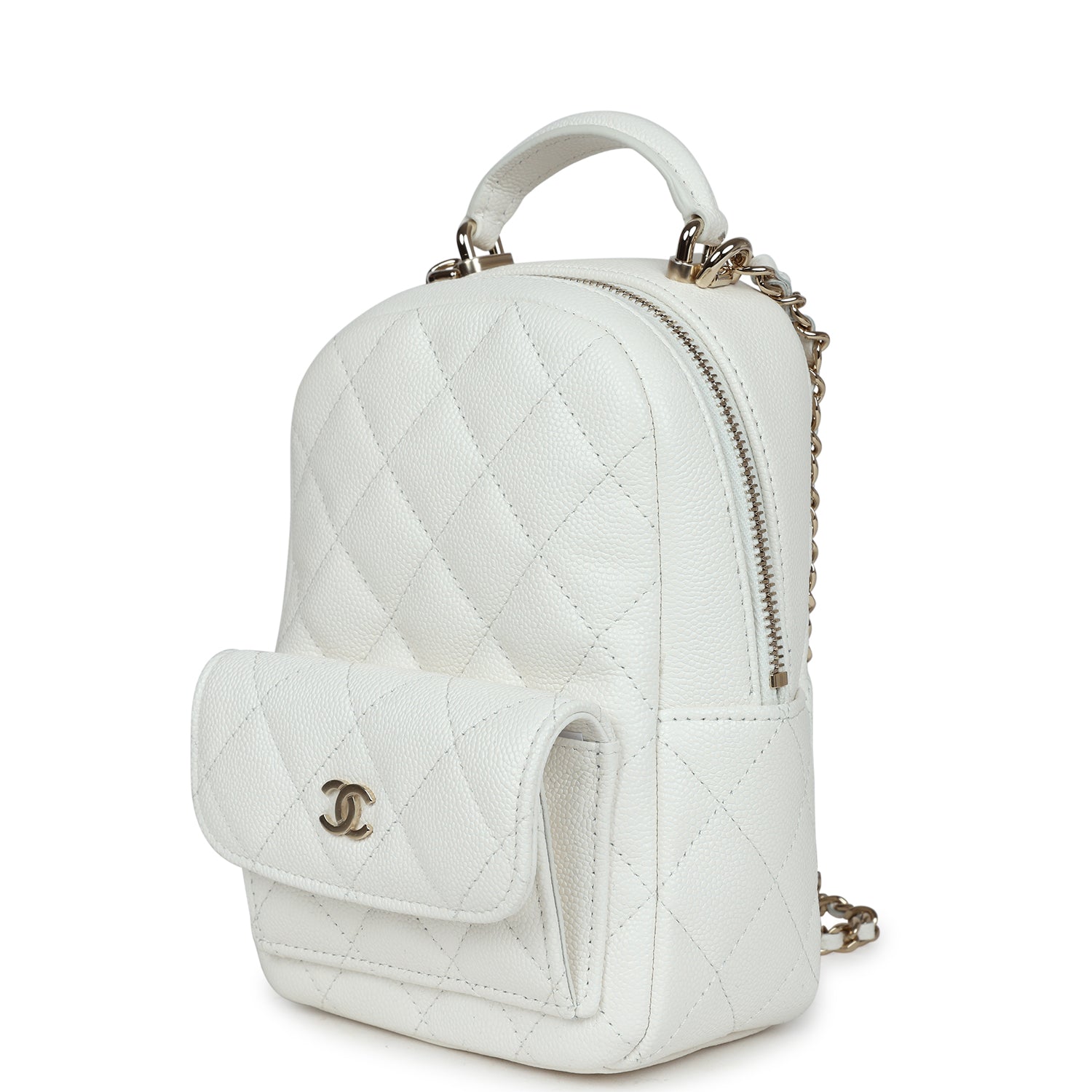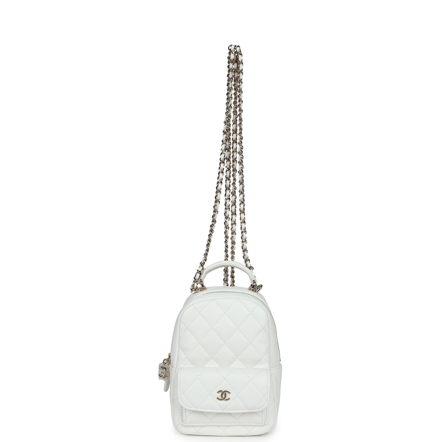 This Mini Phone Holder Backpack with Chain is in White Caviar leather with Light Gold Hardware, features a backpack style bag, small front snap coin pocket with CC logo, leather top handle, zip around closure with leather pull and CC logo charm, convertible light gold tone chain interwoven with white leather crossbody/shoulder strap