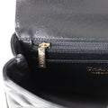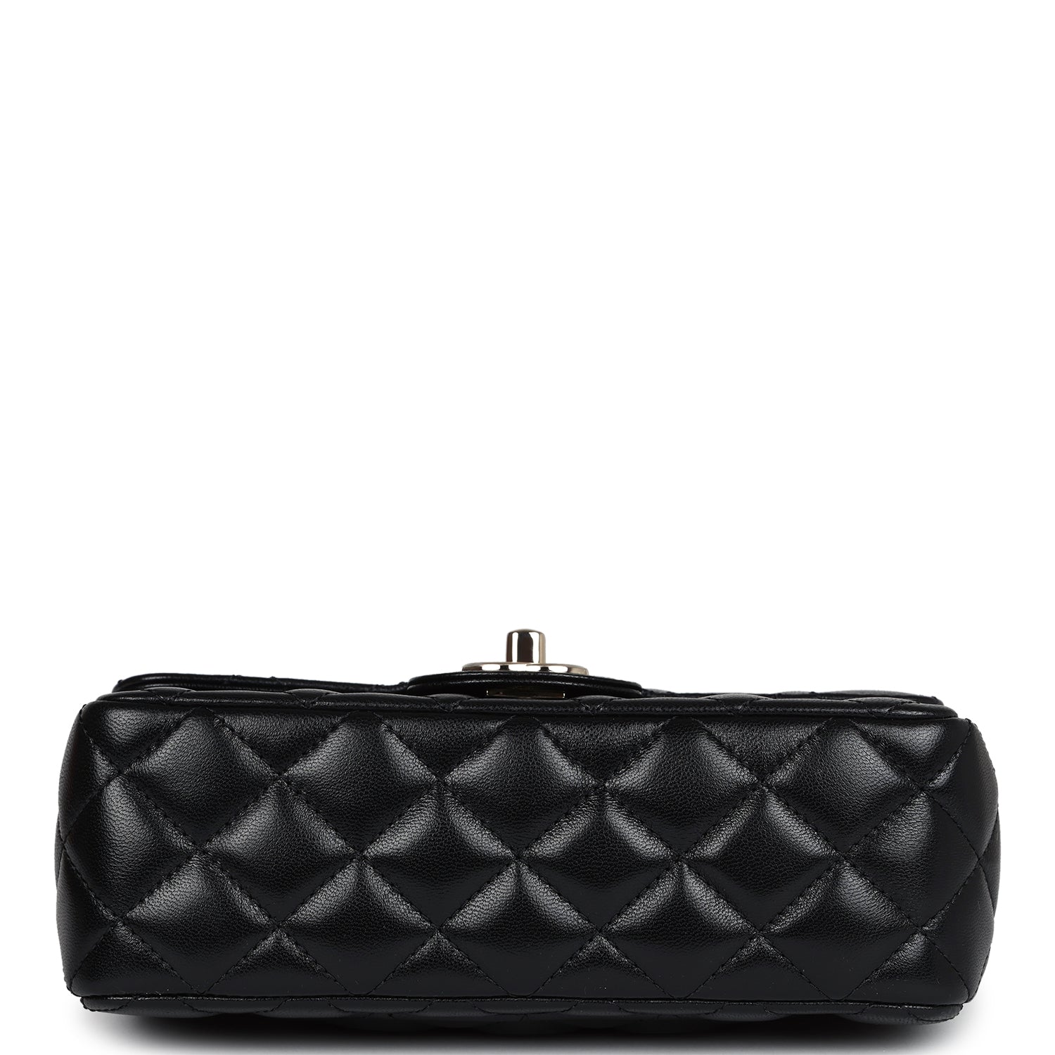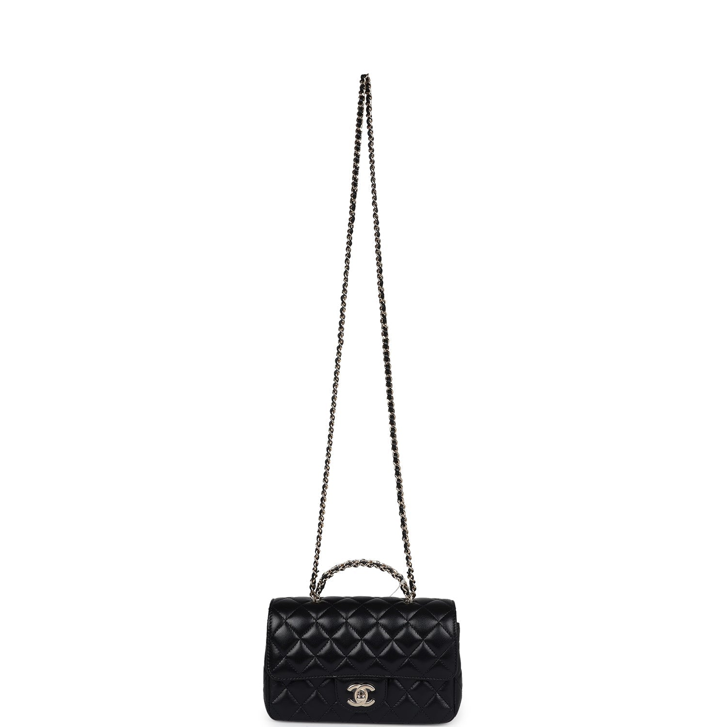 This Mini Rectangular flap bag is in black lambskin with light gold tone hardware and has a front flap with signature CC turnlock closure, rear half moon pocket, a faux crystal and black leather top handle and single interwoven black leather and light gold tone chain link shoulder/crossbody strap.